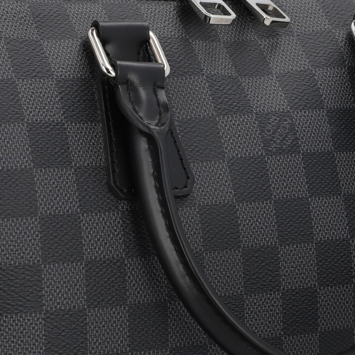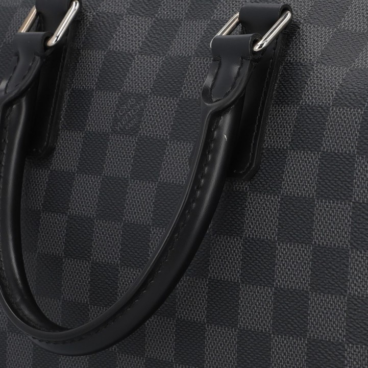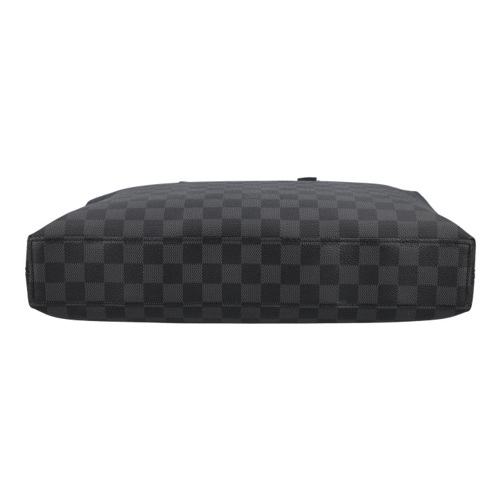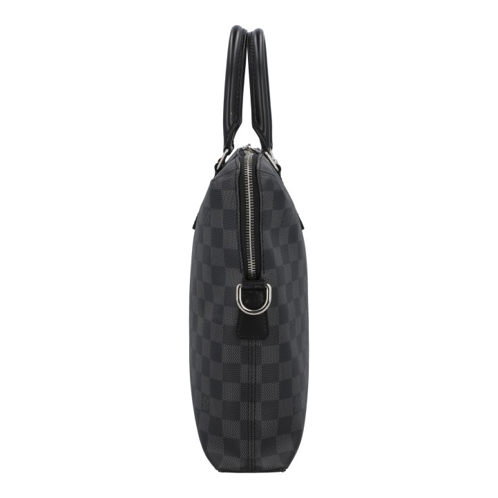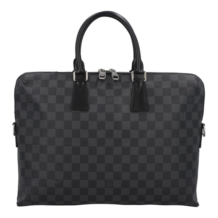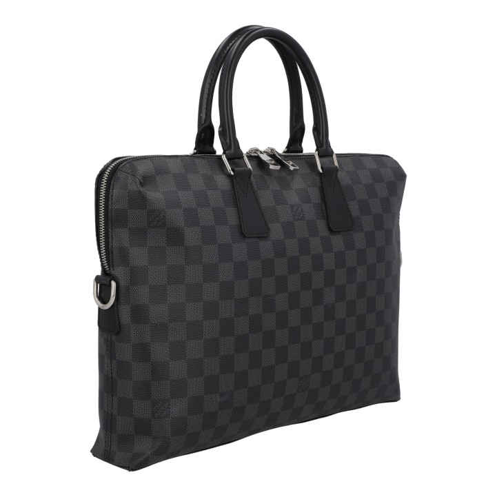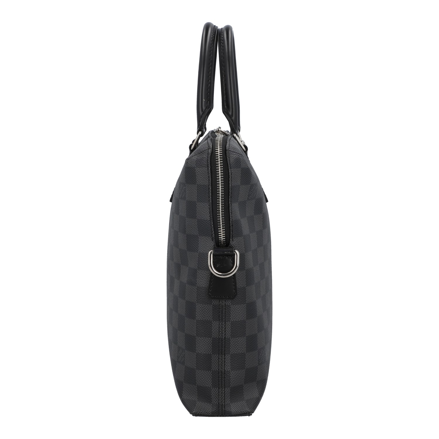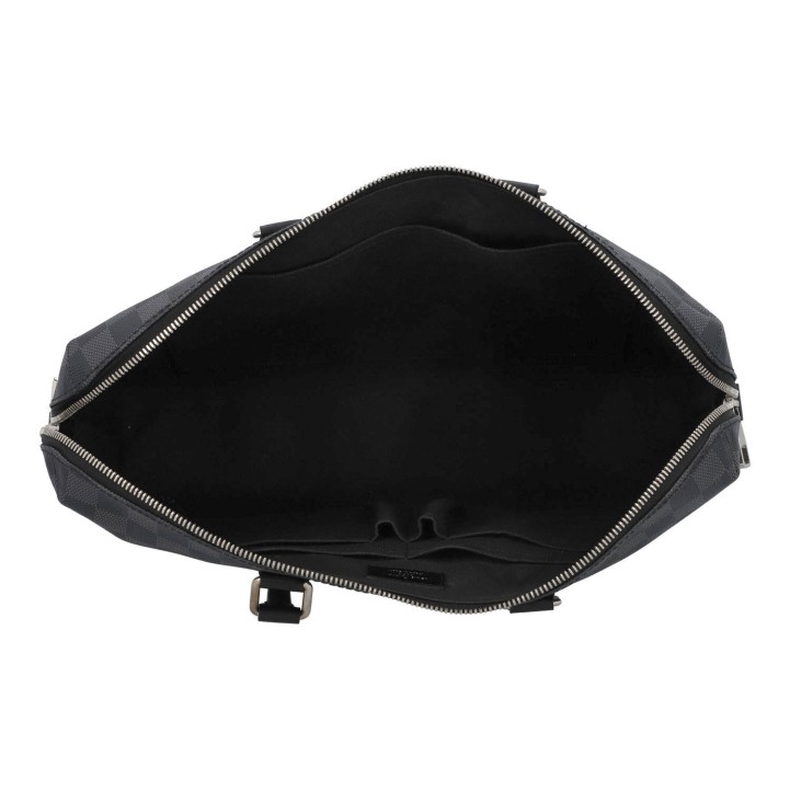 Damier Graphite Canvas Serie mit schwarzen Lederdetails, silberfarbener Hardware, Doppelhenkeln, Reißverschluss und abnehmbarem Schulterriemen. Innenraum aus schwarzem Textil mit fünf Fächern und zwei Halterungen für Stifte. Gebrauchsspuren vorhanden. 37 x 6 x 28 cm.