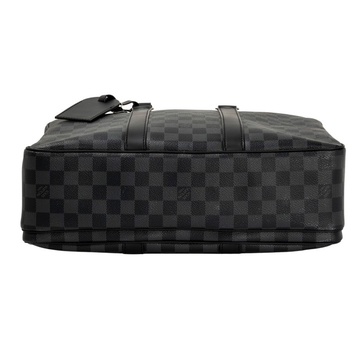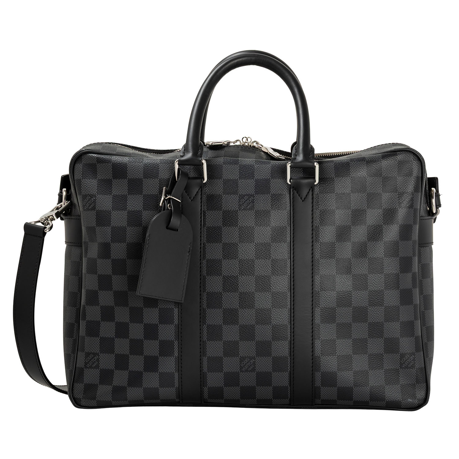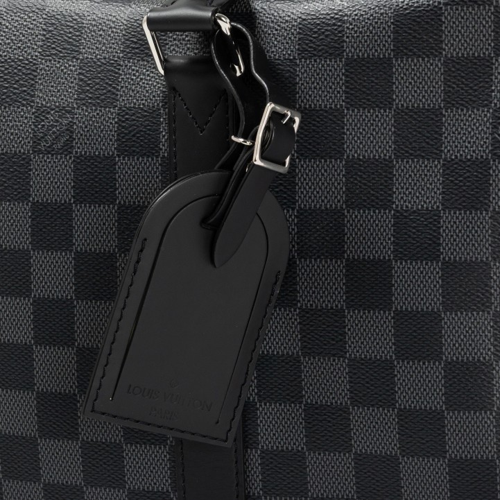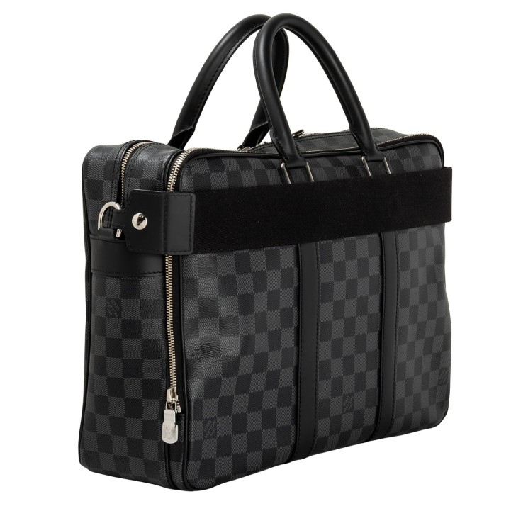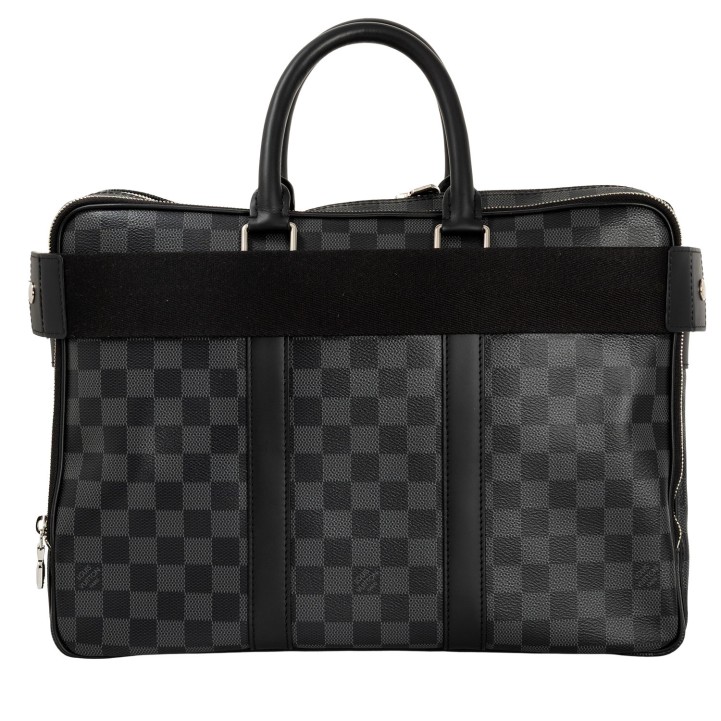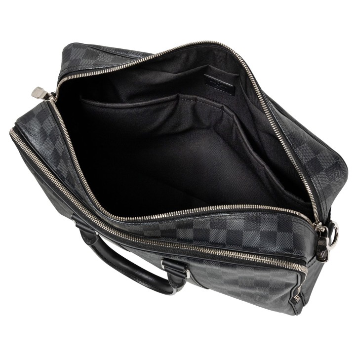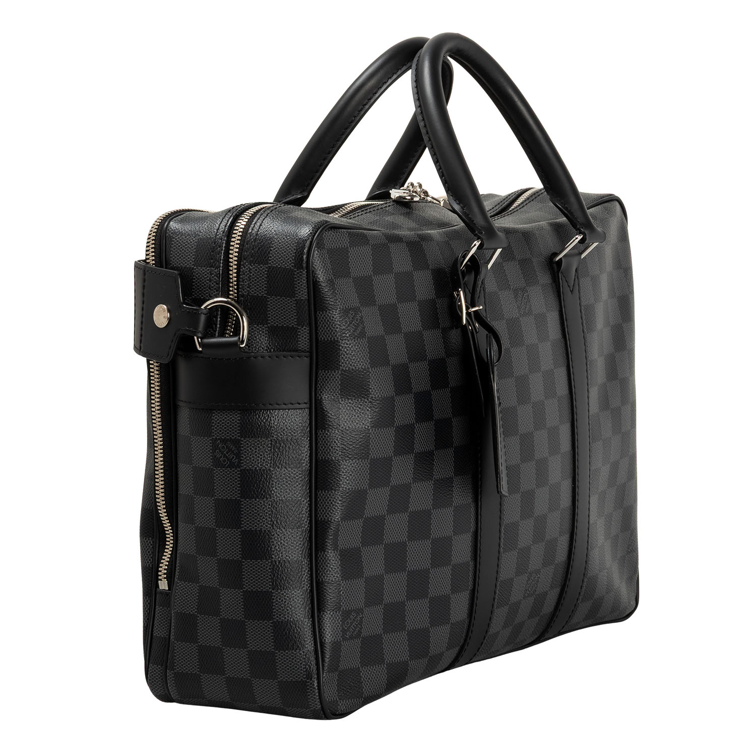Damier Graphite Canvas Serie mit schwarzen Details aus Leder, silberfarbener Hardware, Doppelhenkeln, zwei Reißverschlussfächern und abnhembarem Schulterriemen. Innenraum aus schwarzem Textil mit diversen Fächern. Box und Staubbeutel anbei. Dezente Gebrauchsspuren vorhanden. 37 x 10,5 x 27 cm.