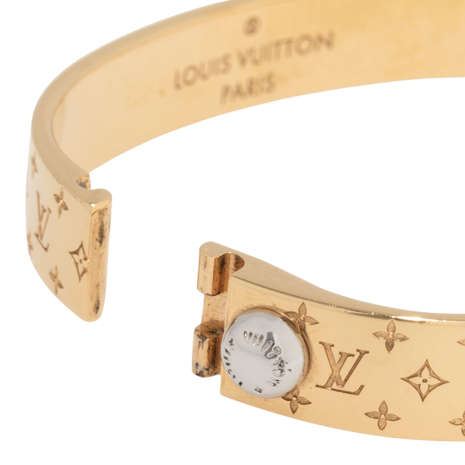 Messing mit Gold-Finish mit eingravierter Louis Vuitton Signatur und Monogram Motiv. Staubbeutel anbei. Tragespuren dezent vorhanden.