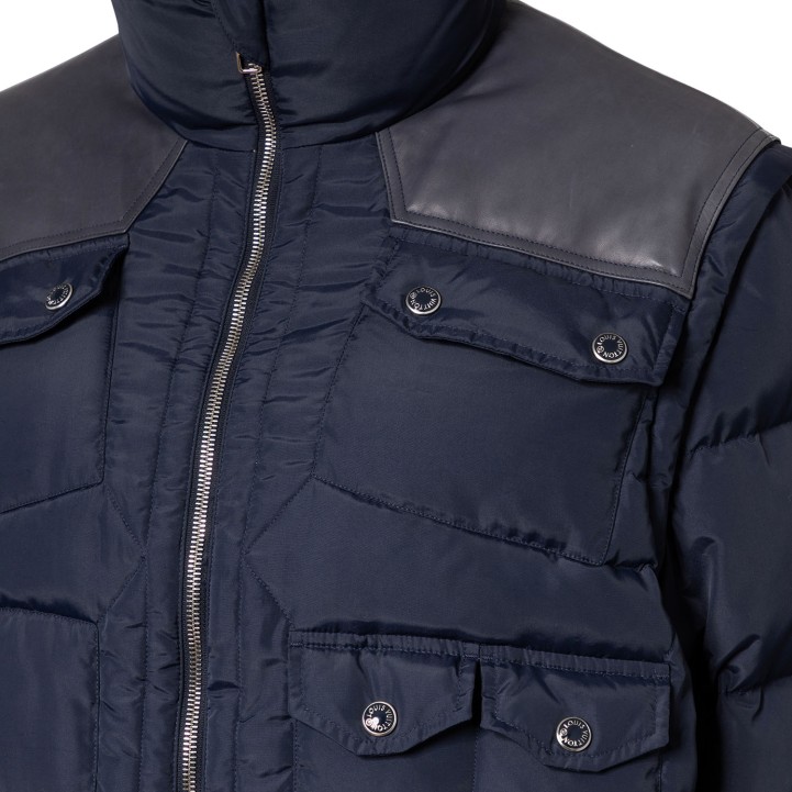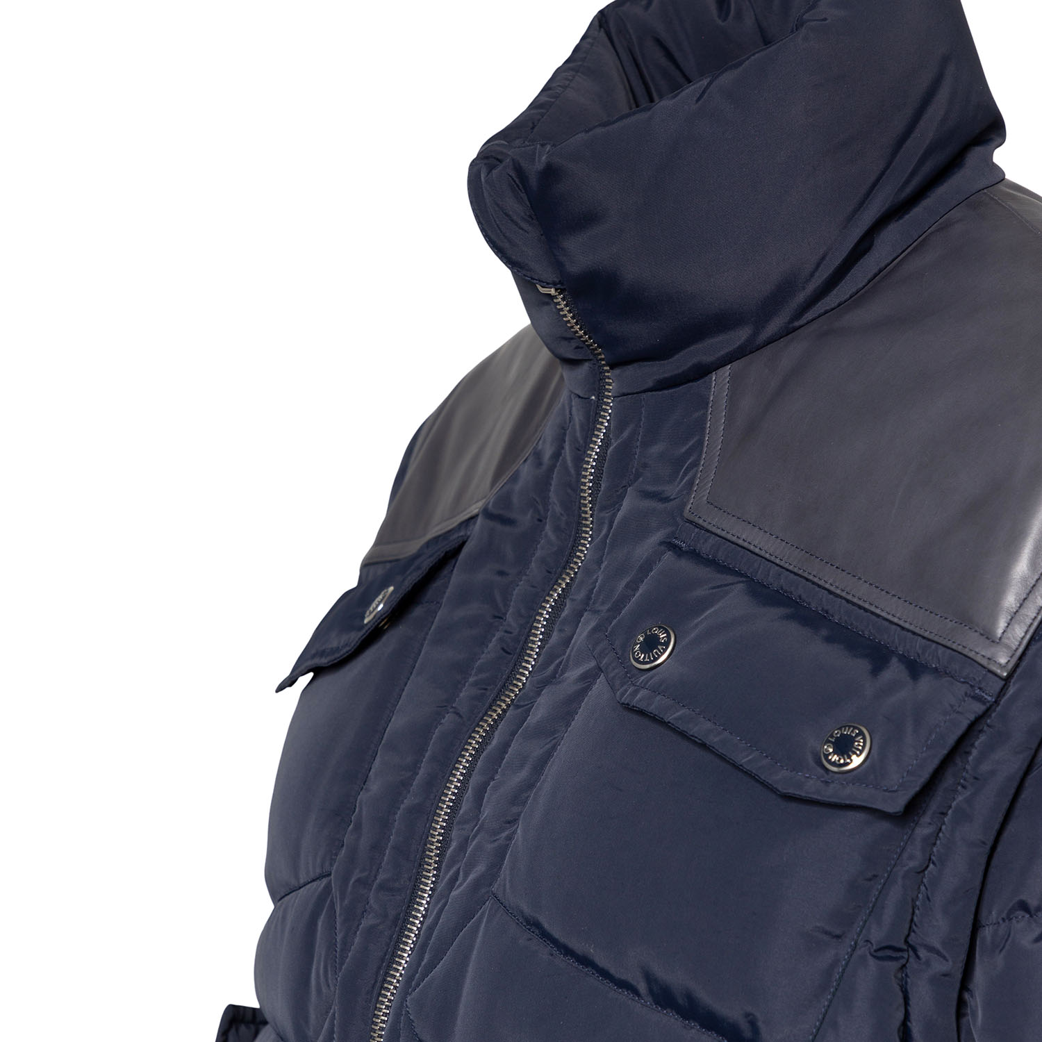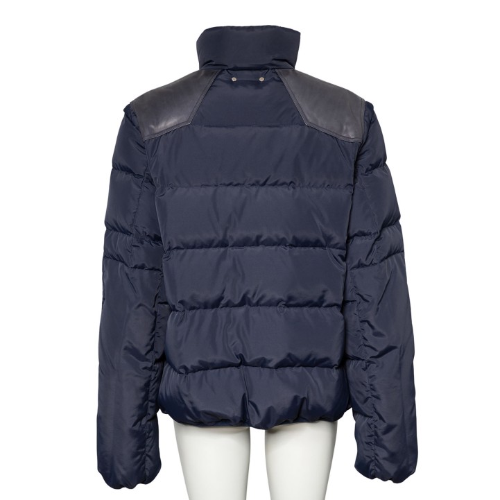 Quer gesteppte Daunenjacke in Dunkelblau mit Leder-Schulterpasse, silberfarbener Hardware und mehreren praktischen Eingrifftaschen. 2-Way-Design: Die Ärmel sind per Reißverschluss abnehmbar, sodass die Jacke auch als Weste getragen werden kann. Innenfutter mit Damier-Muster. Insgesamt in sehr gutem Erhaltungszustand.