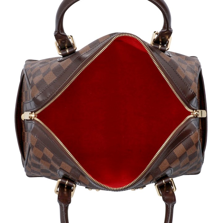 Koll. 2009. Damier Ebene Serie mit dunkelbraunem Leder, goldfarbener Hardware und rotem Innenleben. Front mit Logo-Plakette, längenverstellbare Doppelhenkel, Hauptfach mit Reißverschluss und zwei kleinen Seitenfächern. Staubbeutel anbei. Guter Erhalt. 31x20x22cm.