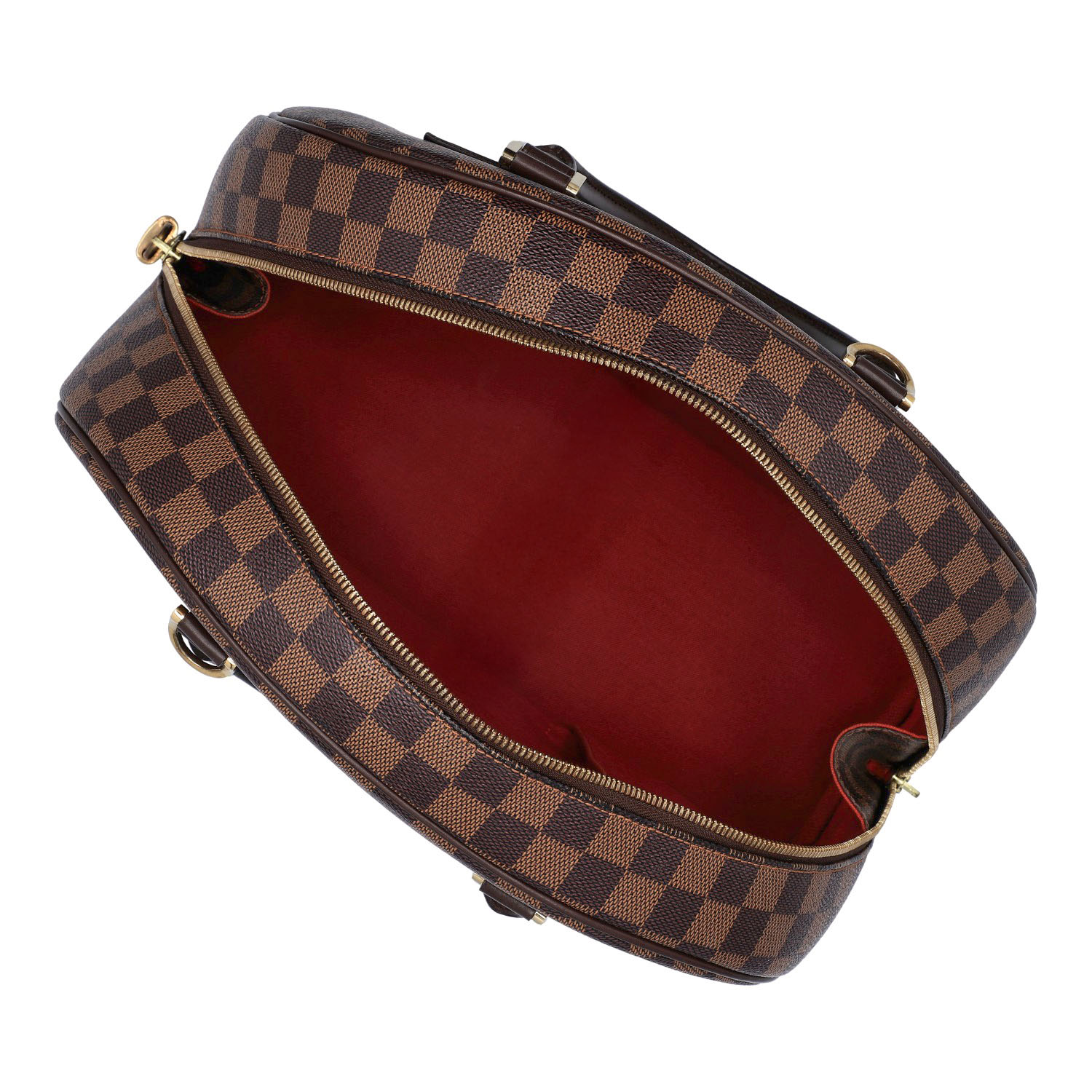 Koll. 2002. Damier Ebene Serie mit dunkelbraunem Glattleder und goldfarbener Hardware. Klassisches Modell mit umlaufendem Reißverschluss und textilem Innenfutter in Rot. Staubbeutel, Schulterriemen, Schloss und Schlüssel anbei. Leichte Gebrauchsspuren vorhanden. 35x14x26cm.