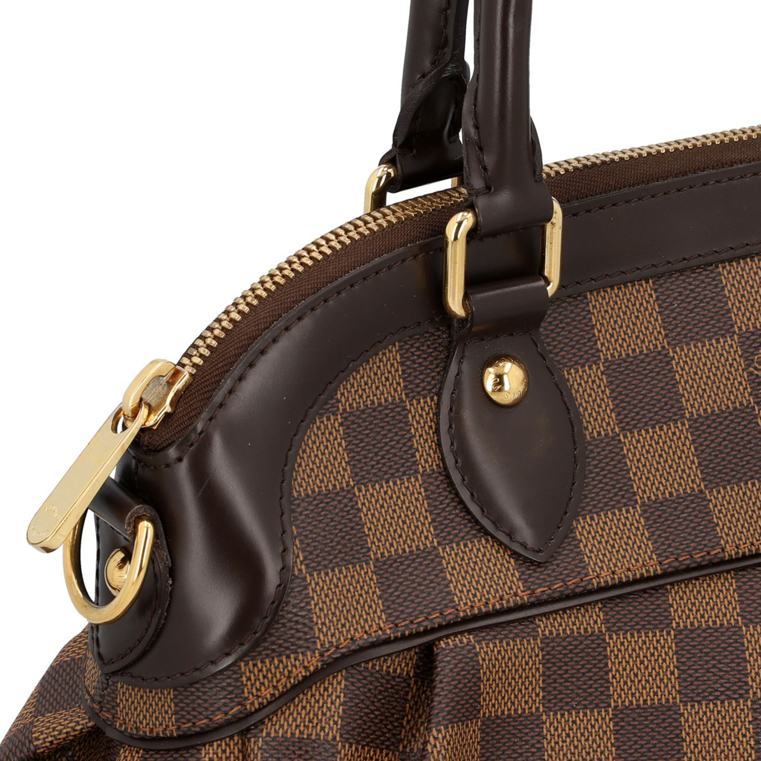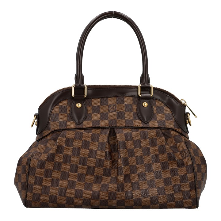 Koll. 2009. Damier Ebene Serie mit dunkelbraunem Glattleder und goldfarbener Hardware. Korpus mit Faltendekor, Doppelhenkeln und Reißverschluss. Innenfutter in Rot mit zwei kleinen Innenfächern. Schulterriemen und Staubbeutel anbei. 34x15x25cm.