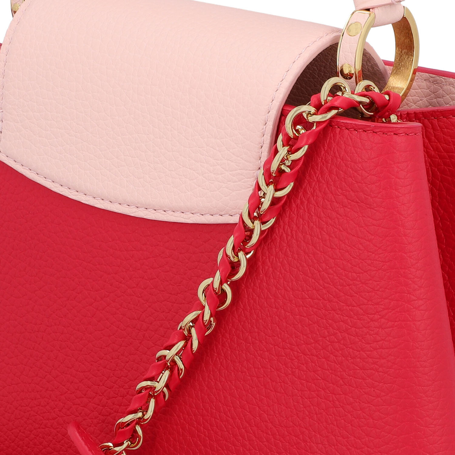 Korpus aus pinkfarbenem Kalbsleder mit hellrosafarbenen Überschlag und Tragegriff an der Oberseite, goldfarbener Hardware. Innenraum mit einem Reißverschlussfach. Abnehmbarer, verstellbarer mit Leder durchflochtener Kettenriemen und Staubbeutel anbei. Sehr guter Zustand. 27 x 18 x 9 cm.