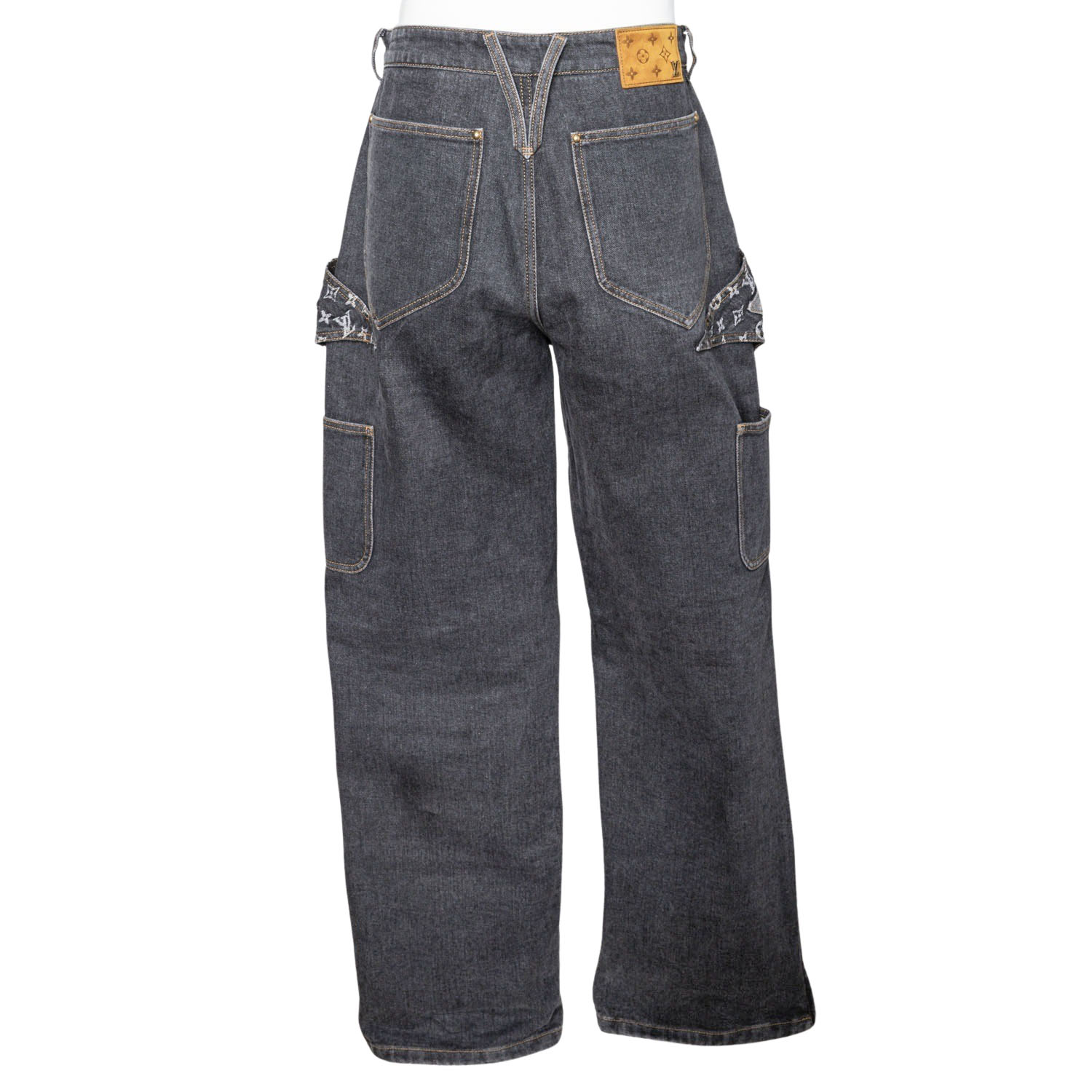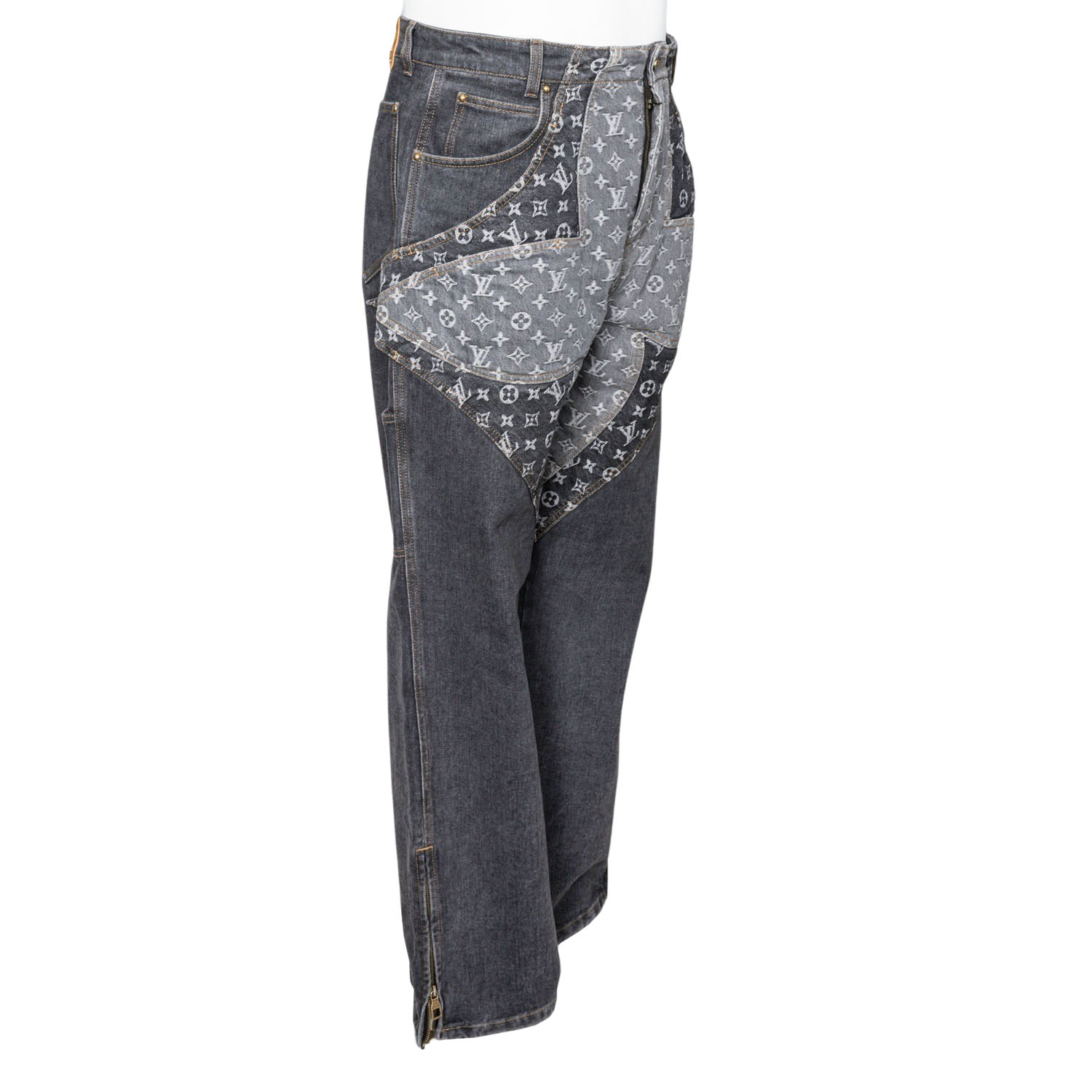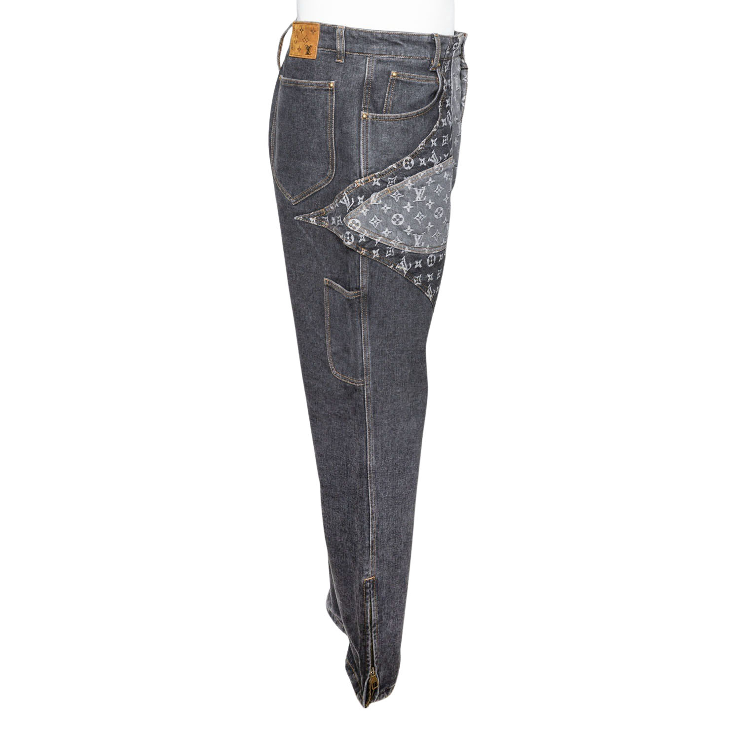 Graue Jeans mit großem Monogram Patch im Blütendesign. Seitliche Eingrifftaschen, Saum mit Reißverschlusss, Rückseite mit Leder-Patch am Bund mit Monogram. Sehr guter Erhalt.