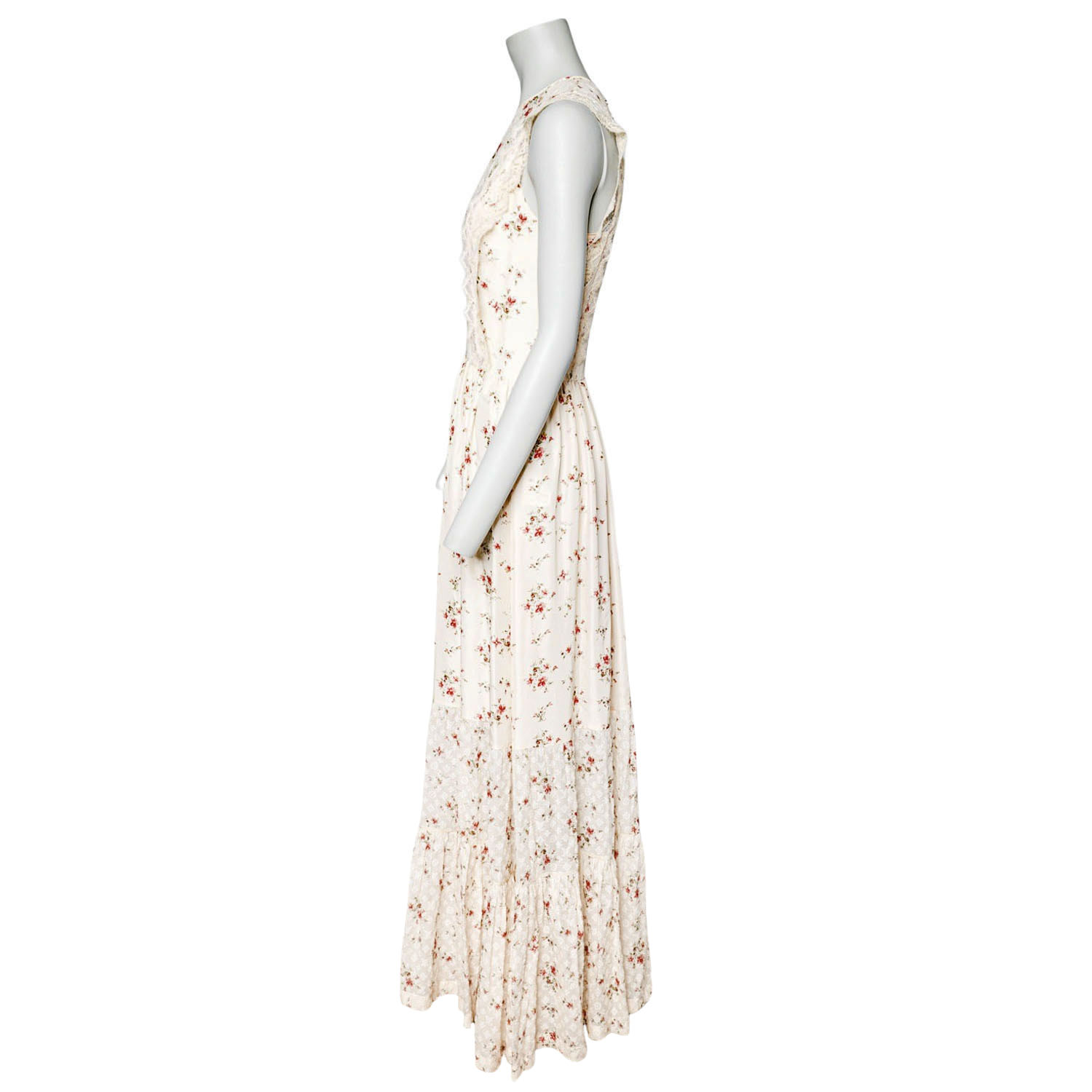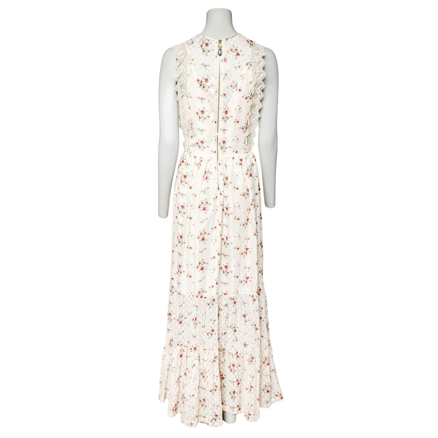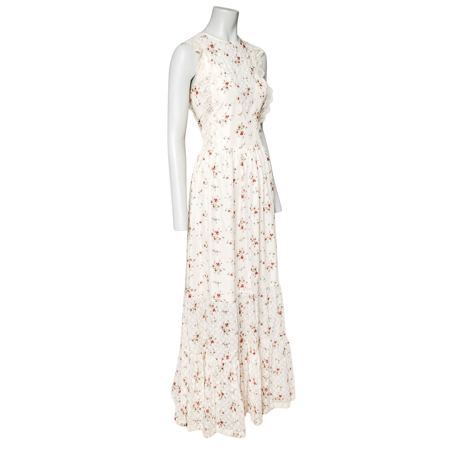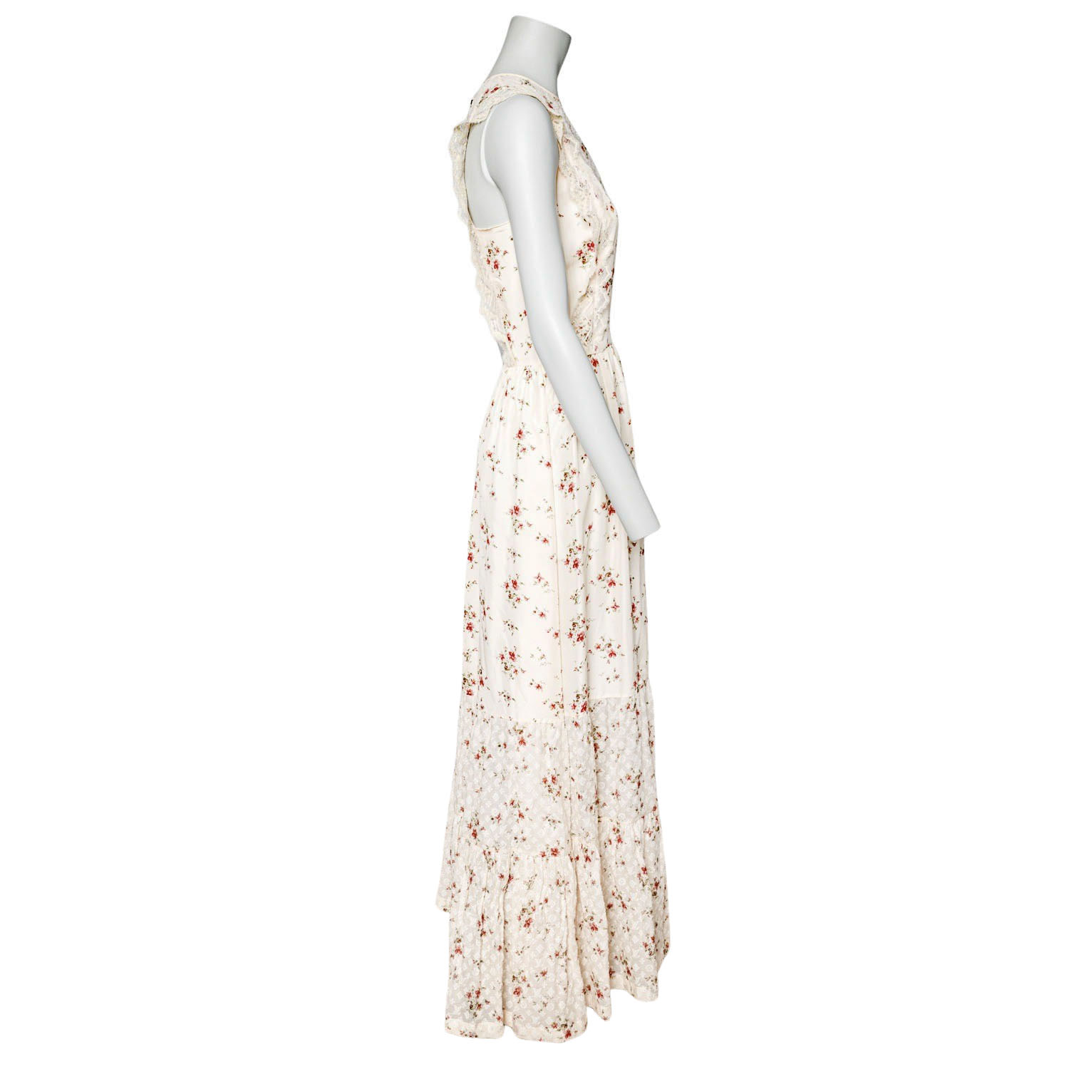 Extravagantes, langes Kleid aus feinem Seidengemisch in Creme mit floralem Muster in leichtem Rot und Grünton sowie Details aus klassischem Monogram. Sehr guter Erhalt.