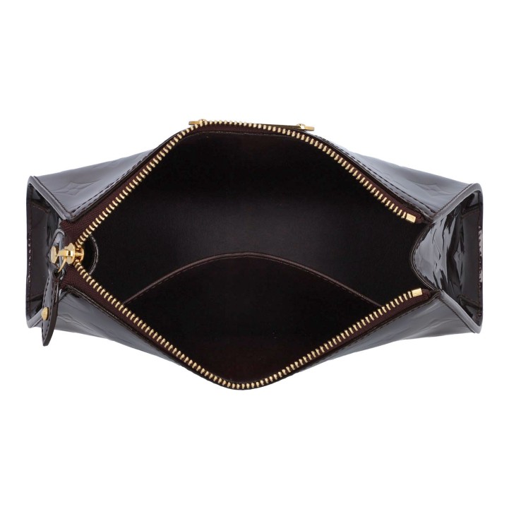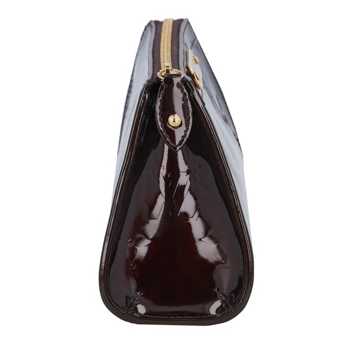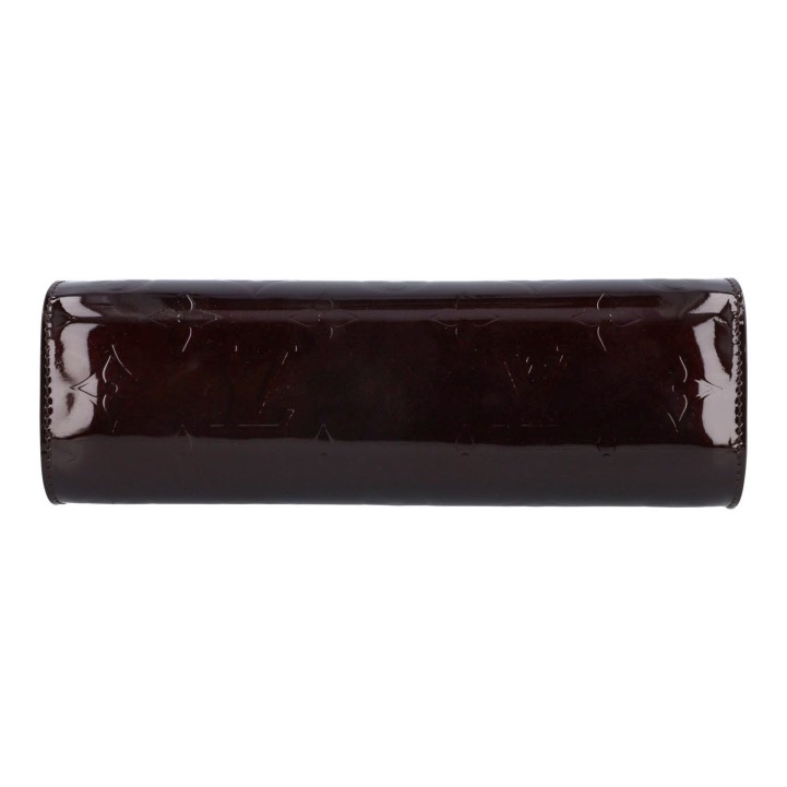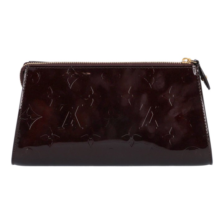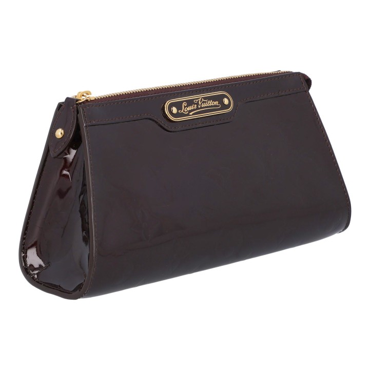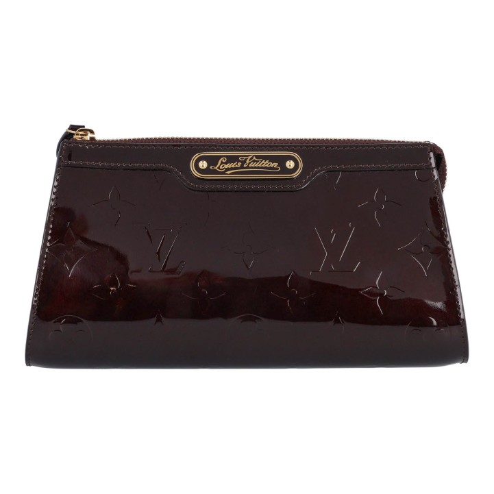 Vernis Leder Serie in Amaranth mit goldfarbener Hardware und Reißverschluss. Innenraum mit einem Einsteckfach. Rechnungskopie anbei. Sehr guter Zustand. 20 x 6,5 x 10 cm.