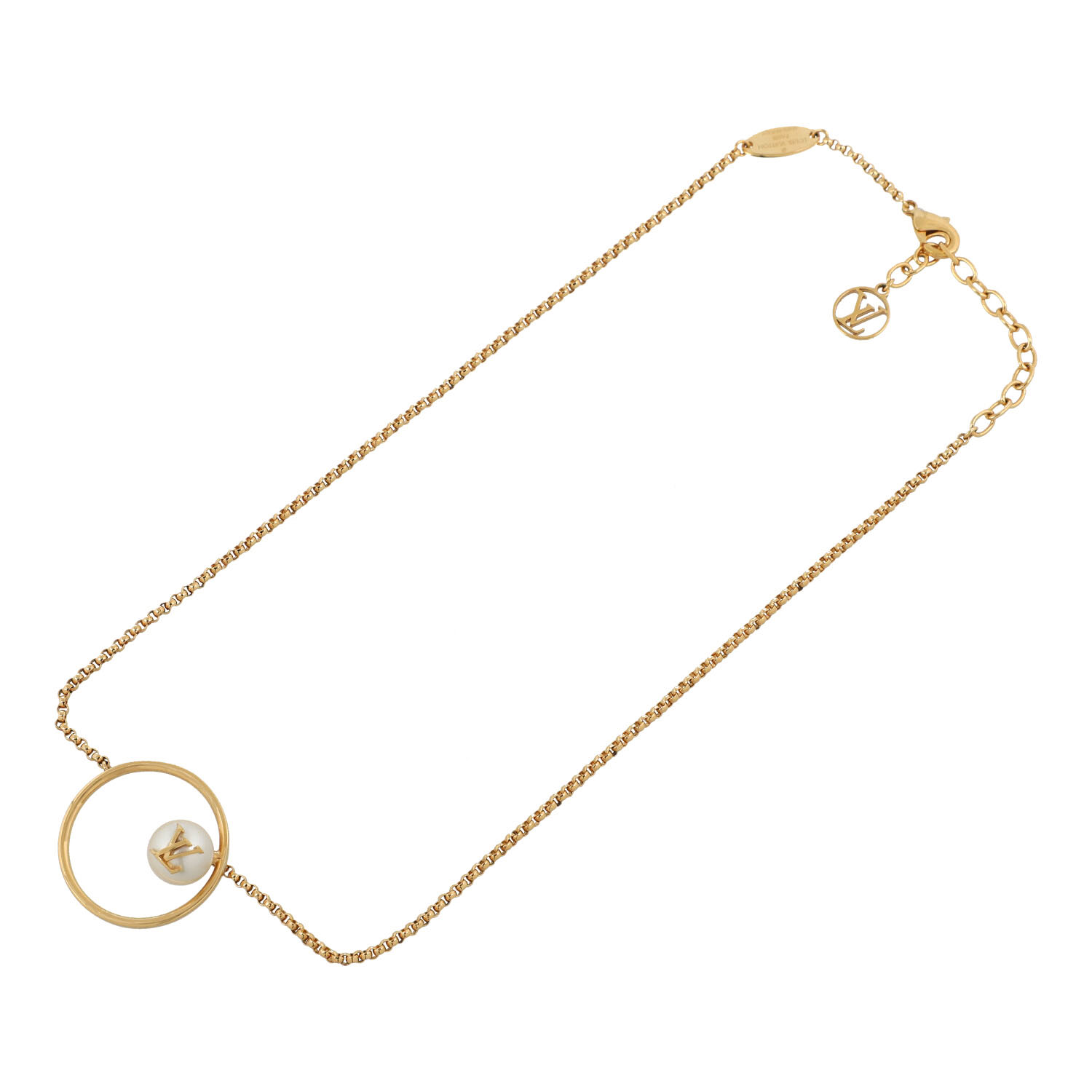 Länge ca. 42cm. Goldfarbene Gliederkette mit rundem Anhänger und Perlendekor mit Logo-Applikation. Box, Staubbeutel und Rechnung anbei. Sehr guter Erhalt.
