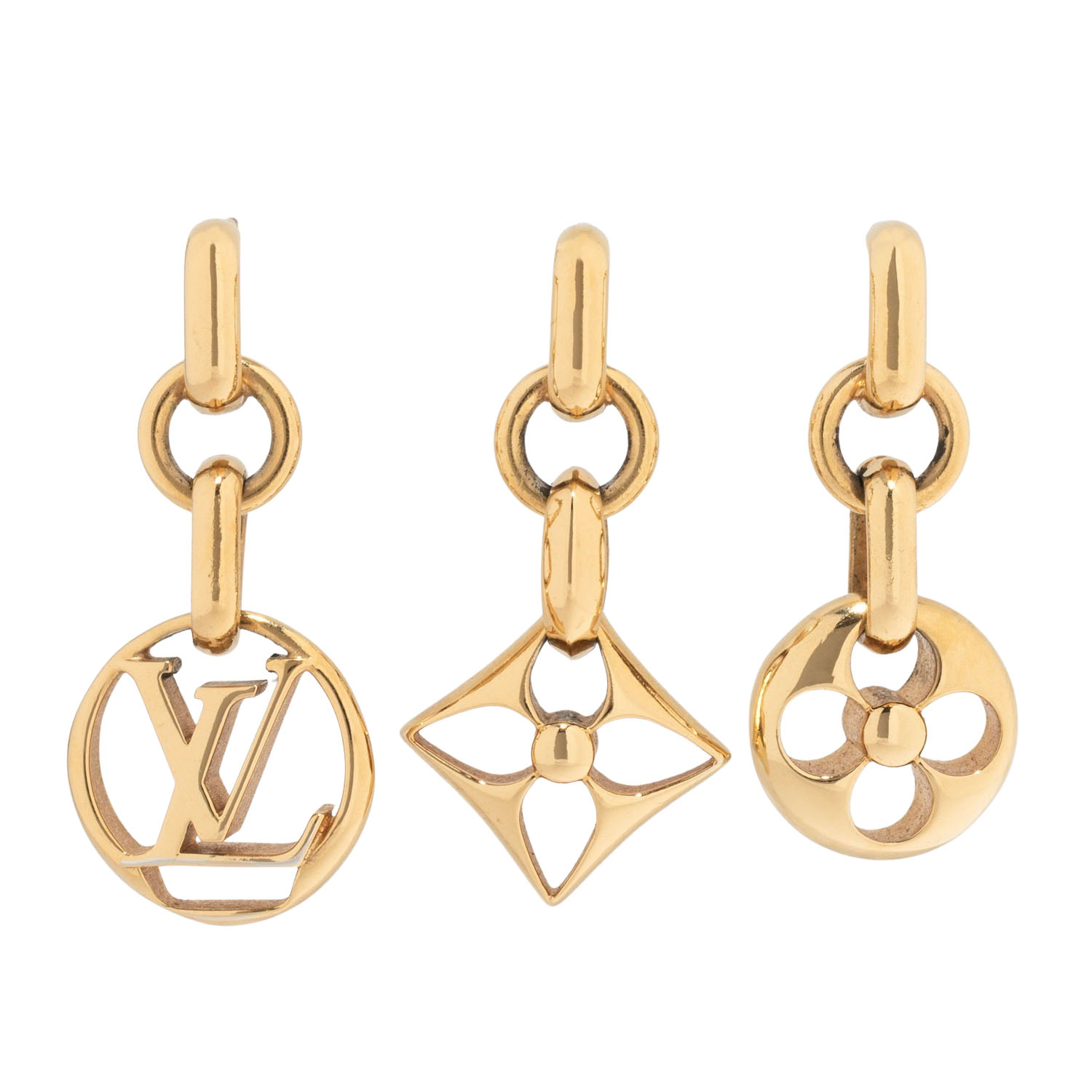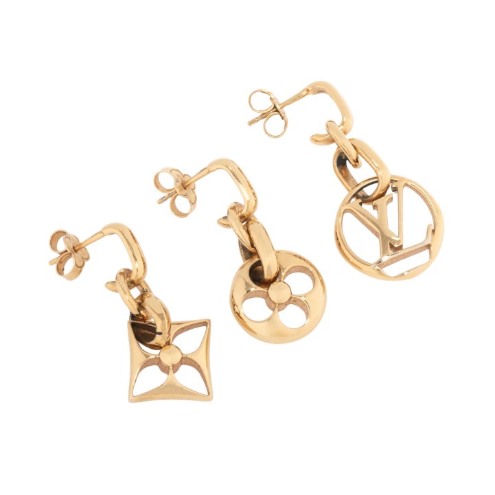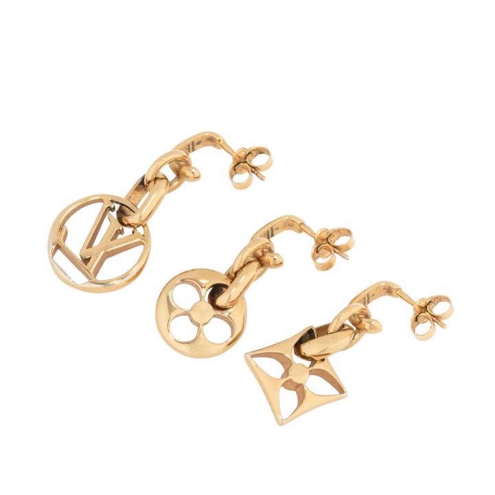 Set bestehend aus drei Ohrsteckern in Goldfarben, Anhänger in Blüten und Logo-Form. Box und Staubbeutel anbei. Tragespuren vorhanden.
