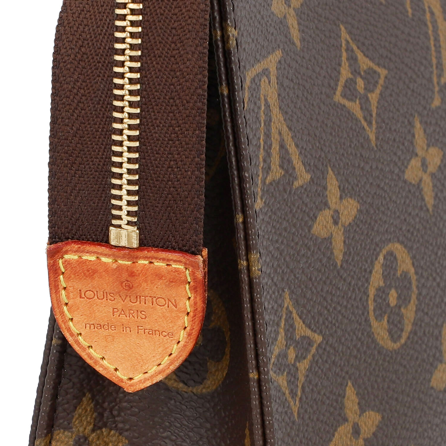 Monogram Canvas Serie mit goldfarbener Hardware, Reißverschluss. Gebrauchsspuren vorhanden, Flecken. 19 x 5,5 x 14 cm.