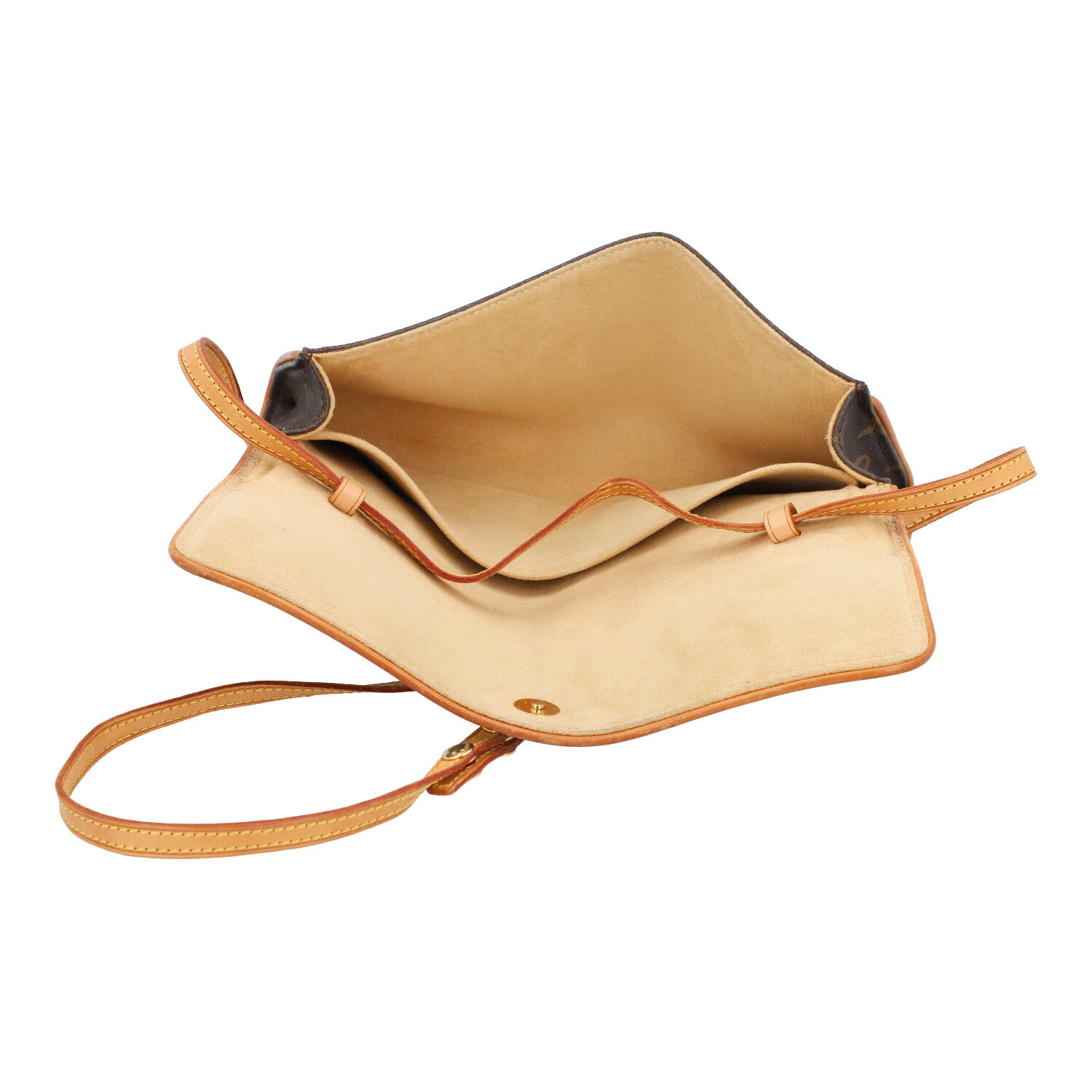 Koll. 2000. Monogram Canvas Serie mit naturbelassenem Leder und goldfarbener Hardware. Innenfutter mit kleinem Kugelschreiberfleck (seitlich). Abnehmabrer und längenverstellbarer Trageriemen. Staubbeutel anbei. Patina, Abrieb und Tragespuren vorhanden. 24x3x11,5cm.
