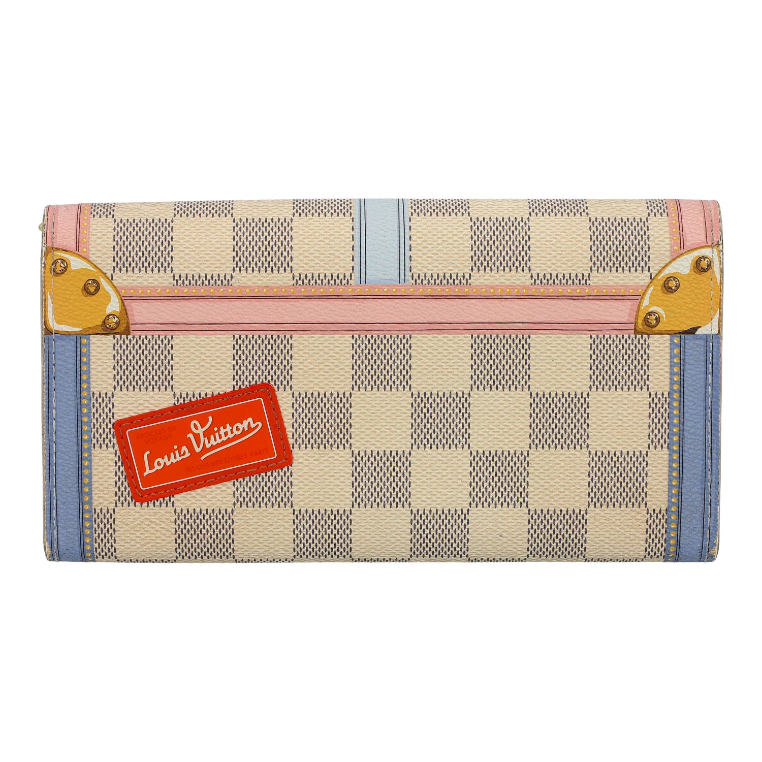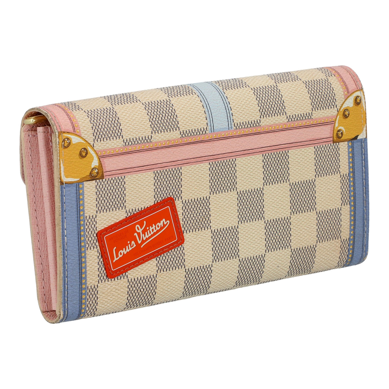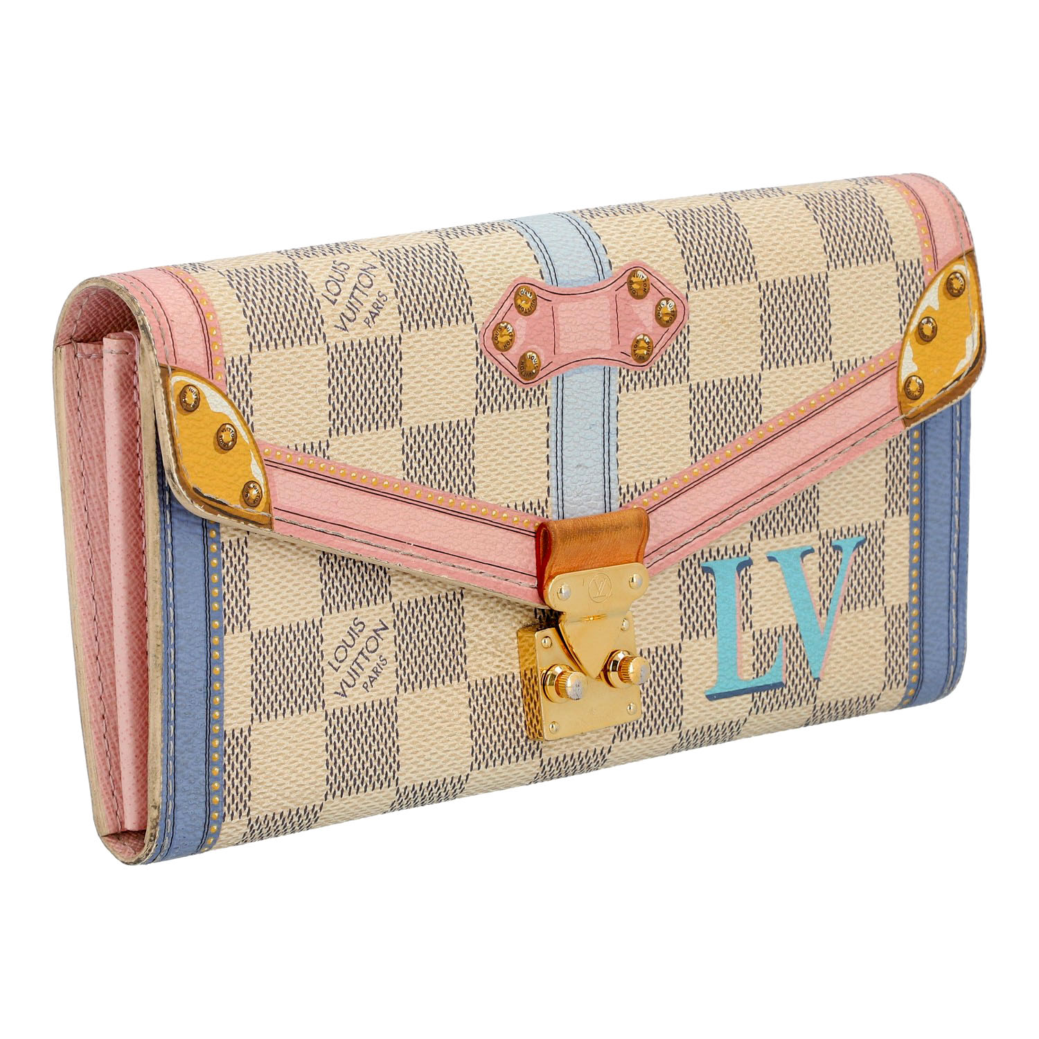 LIMITED EDITION. Damier Azur Canvas Summer Trunk mit goldfarbener Hardware, Überschlag mit Steckschließe. Innenraum in Rosa mit zwölf Kartenfächern, mehreren großen Fächern und einem Fach mit Reißverschluss. Box und Staubbeutel liegen bei. Diverse Gebrauchsspuren vorhanden.