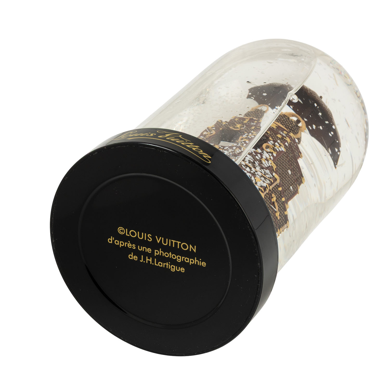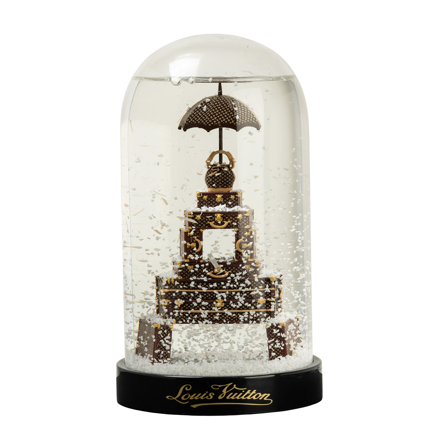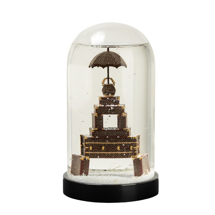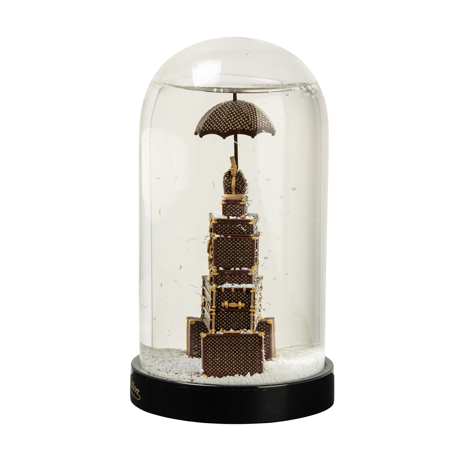 Limitierte Schneekugel mit ikonischem Eiffelturm, kunstvoll gestaltet aus gestapelten Koffern und Taschen im klassischen Monogramm-Design. Gekrönt von einem kleinen Schirm. Glaskuppel mit klarem Wasser und Schneeflocken auf elegantem schwarzem Sockel. Höhe ca. 15cm. Box anbei. Sehr guter Erhalt.