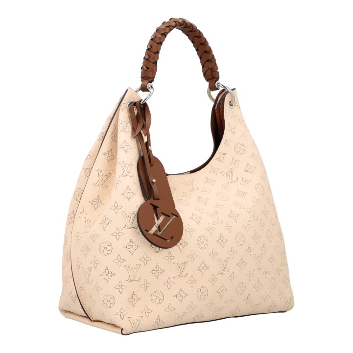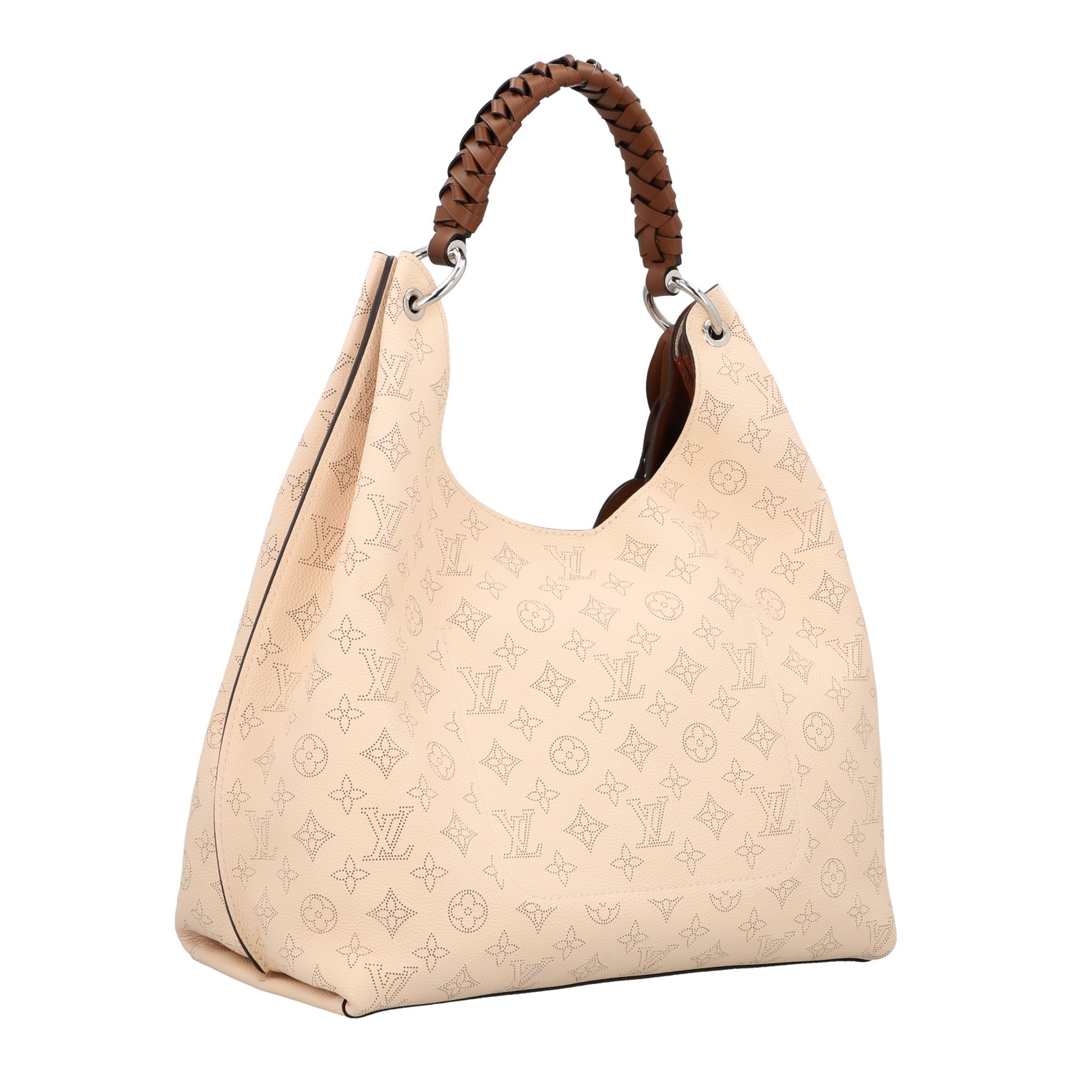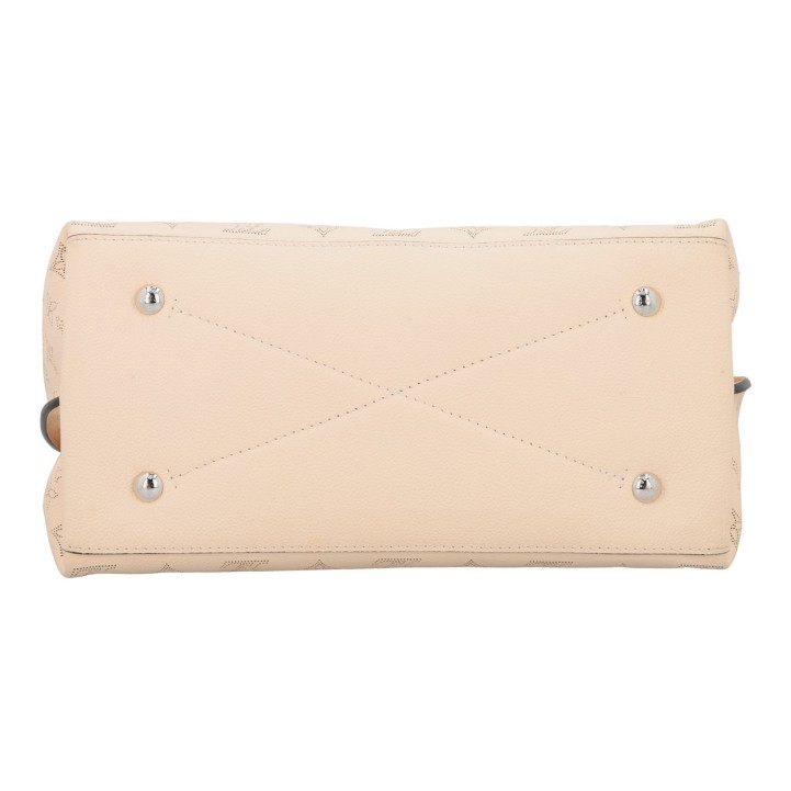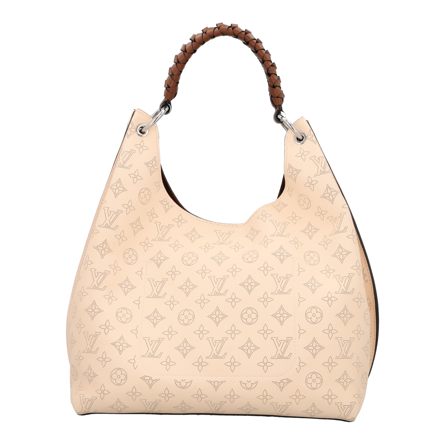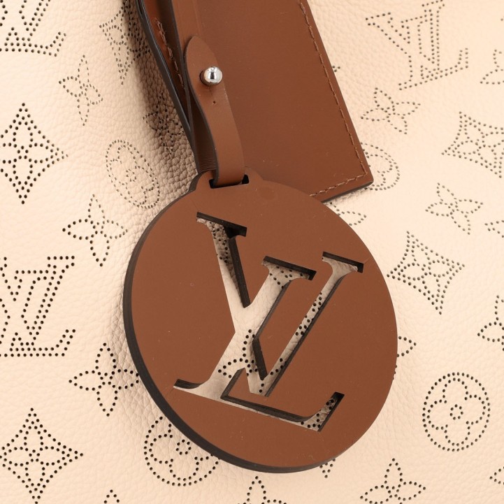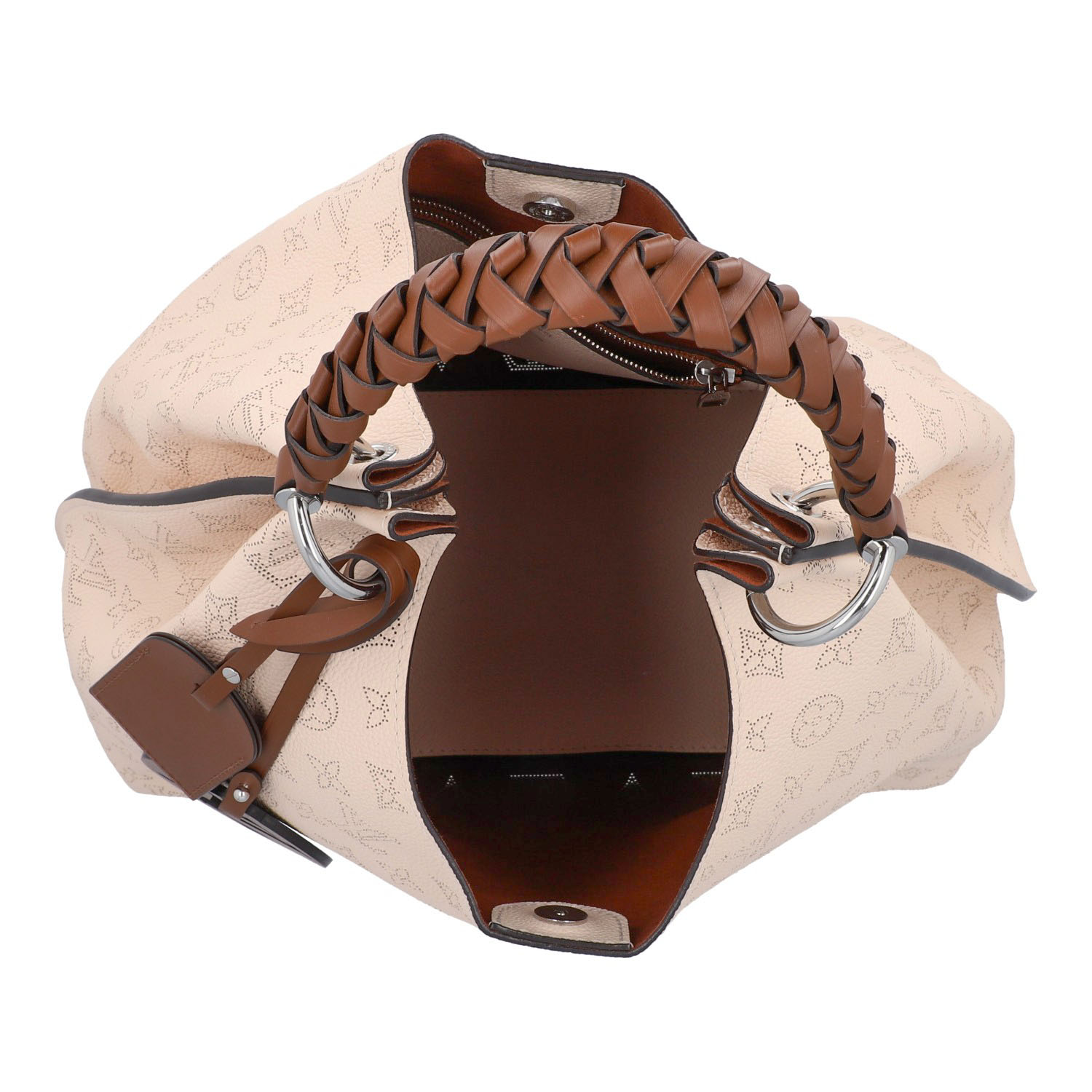 Akt. NP.: 4.200,-€. Koll. 2021. Mahina Leder Serie in Creme mit perforiertem Monogram und Details aus Leder in Braun. Hardware in Silberfarben. Klassisches Modell mit kleinem Innenfach, Hauptfach mit magnetischem Verschluss, geflochtener Henkel. Adressanhänger, Logo-Charm, Staubbeutel und Rechnung anbei. Sehr guter Erhalt.