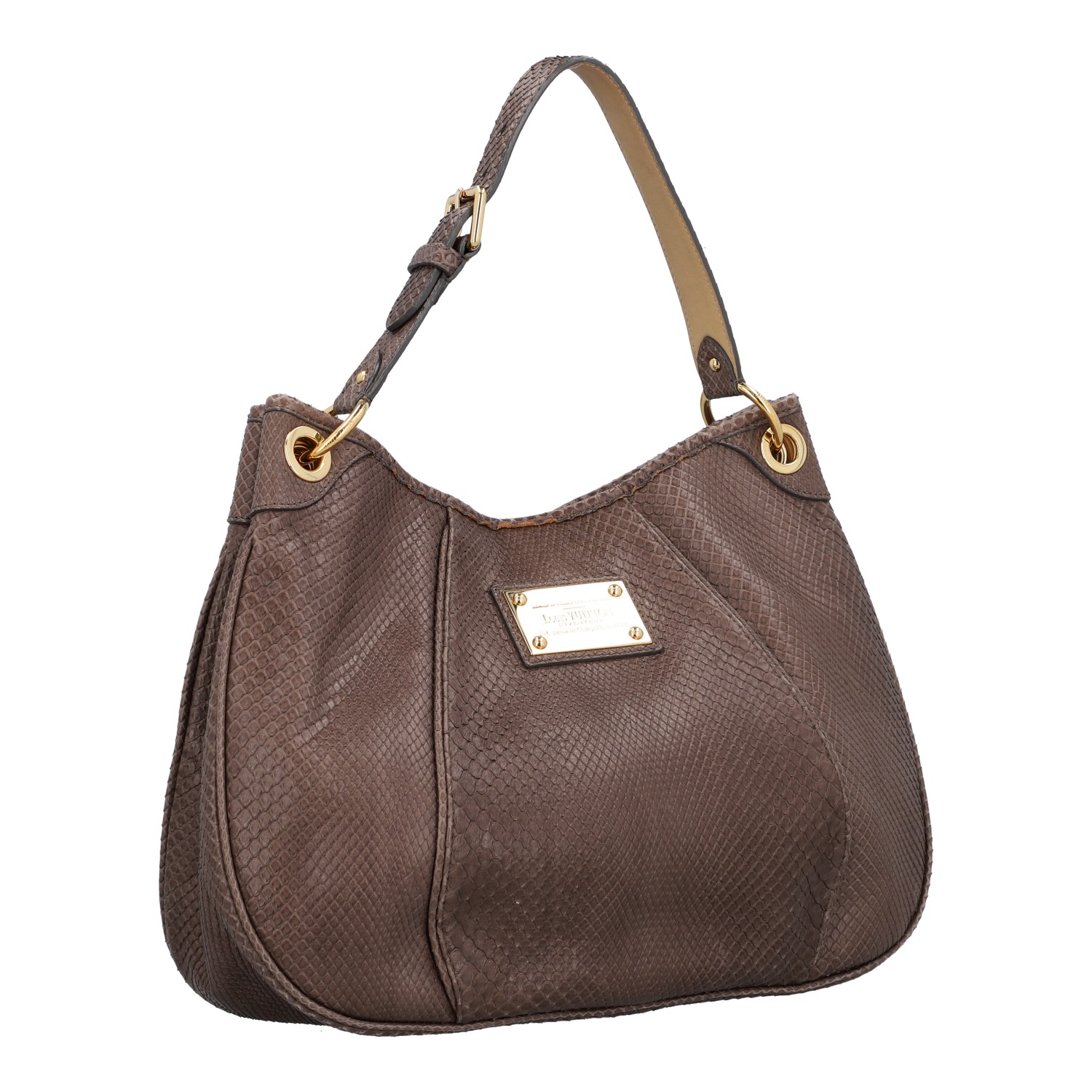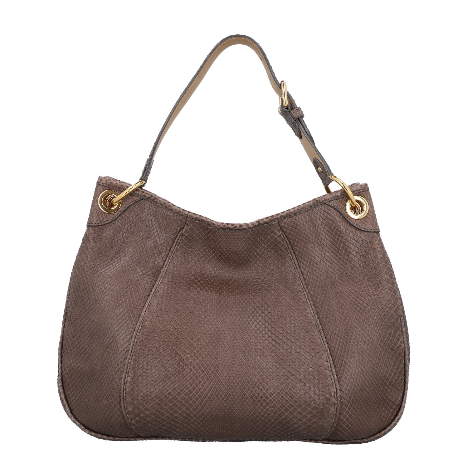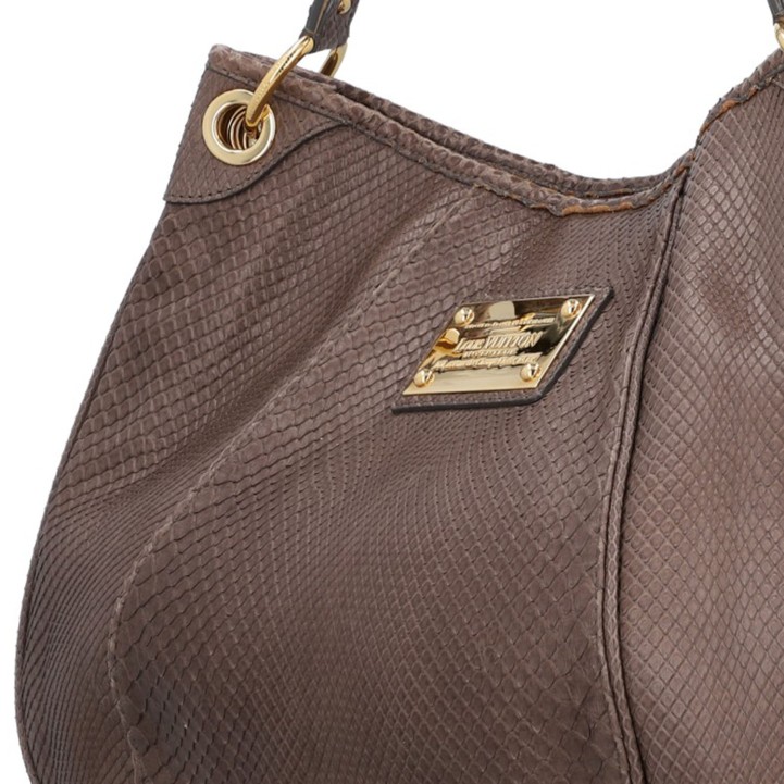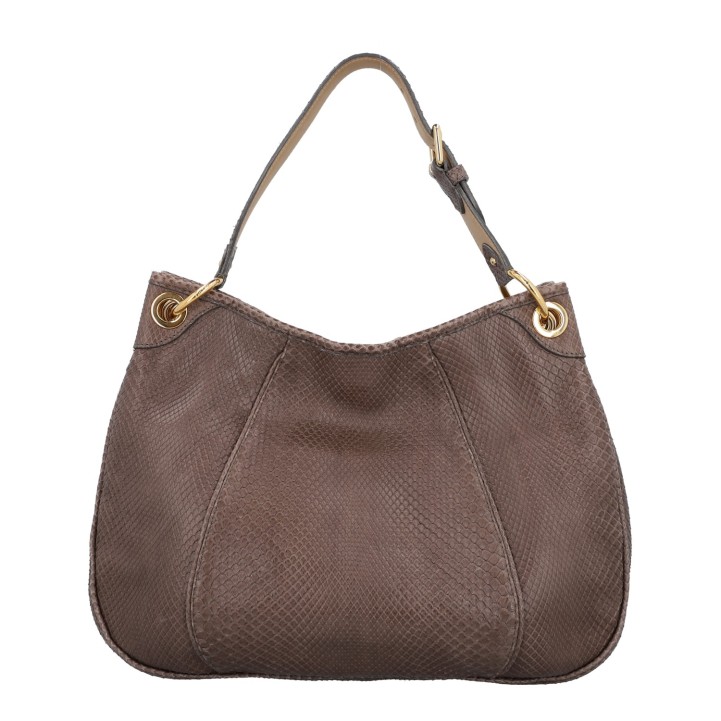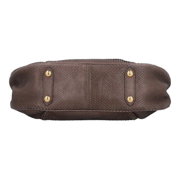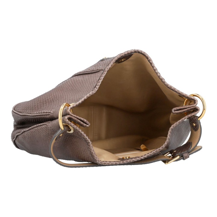 Pythonleder in Taupefarben mit goldfarbener Hardware, Schulterriemen und Logo-Plakette auf der Front. Innenraum aus Leder mit drei Fächern, eines davon mit Reißverschluss. Staubbeutel, Rechnung und CITES-Re-Export-Zertifikat anbei (Verkauf nur innerhalb der EU). Gebrauchsspuren vorhanden: Flecken und Abrieb. 41 x 12 x 30 cm.