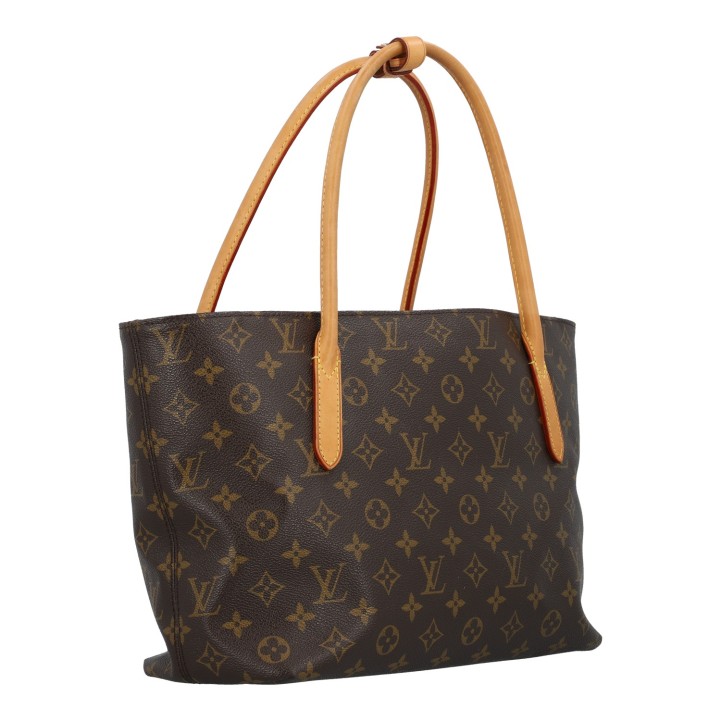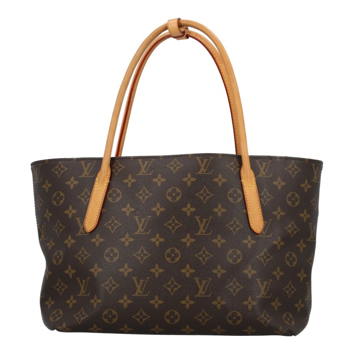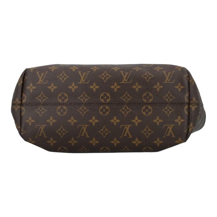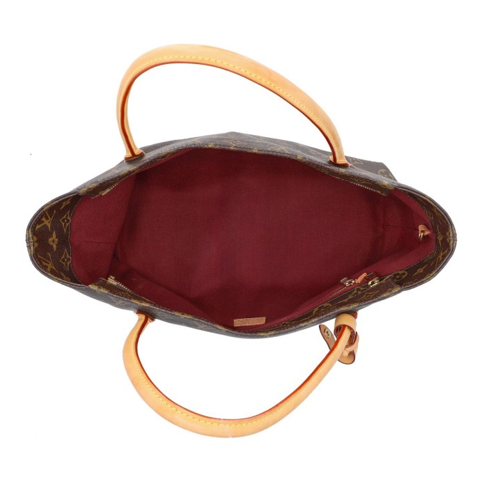 Koll. 2012. Kleine Tote Bag aus der Monogram Canvas Serie mit naturbelassenem Leder und goldfarbener Hardware. Hauptfach mit Reißverschluss, textilem Innenfutter und kleinem Innenfach. Patina, Abrieb und leichte Gebrauchsspuren vorhanden. 32x14x23cm.