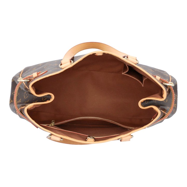 Monogram Canvas Serie mit Rindsleder-Details, goldfarbener Hardware, Doppelhenkeln und seitlichen Riemen. Innenraum aus braunem Textil mit zwei Fächern, eines davon mit Reißverschluss. Dezente Gebrauchsspuren vorhanden. 37 x 12 x 25 cm.