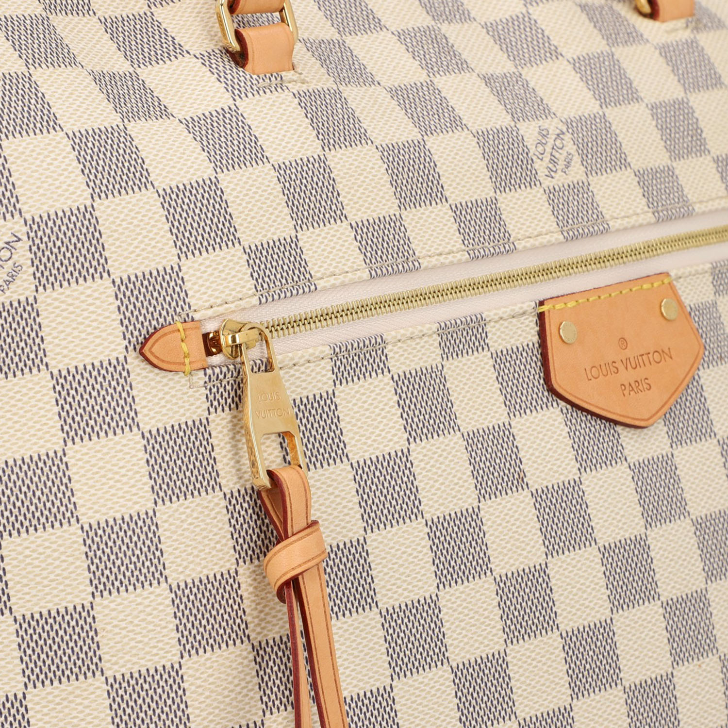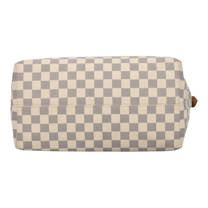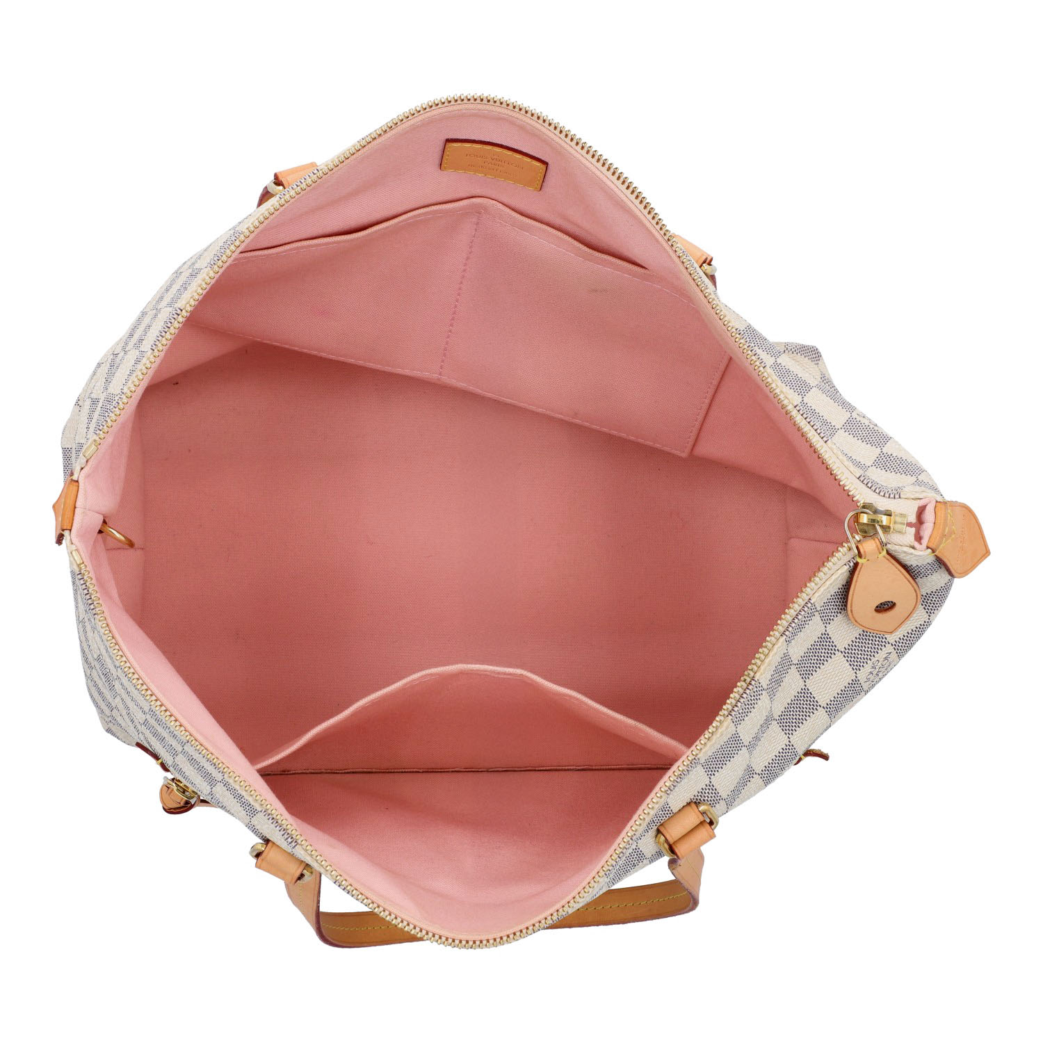 Damier Azur Canvas mit Rindsleder-Details, goldfarbener Hardware, Doppelhenkeln und Außenfach mit Reißverschluss. Innenraum in Rosa mit drei Fächern. Box, Staubbeutel, Schlüssel und Schloss anbei. Gebrauchsspuren dezent vorhanden. 31 x 16 x 26 cm.