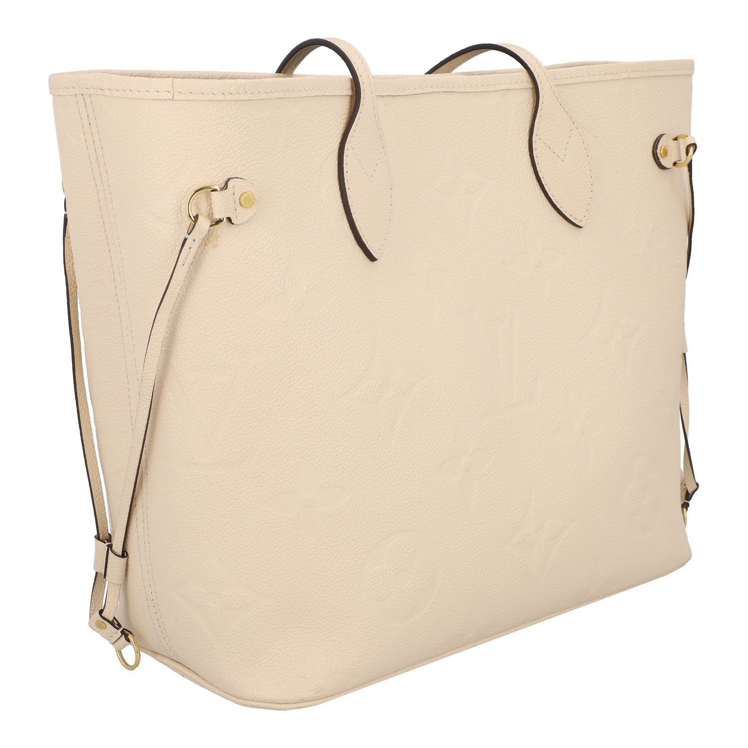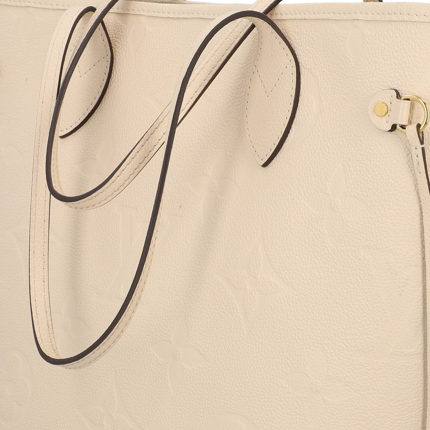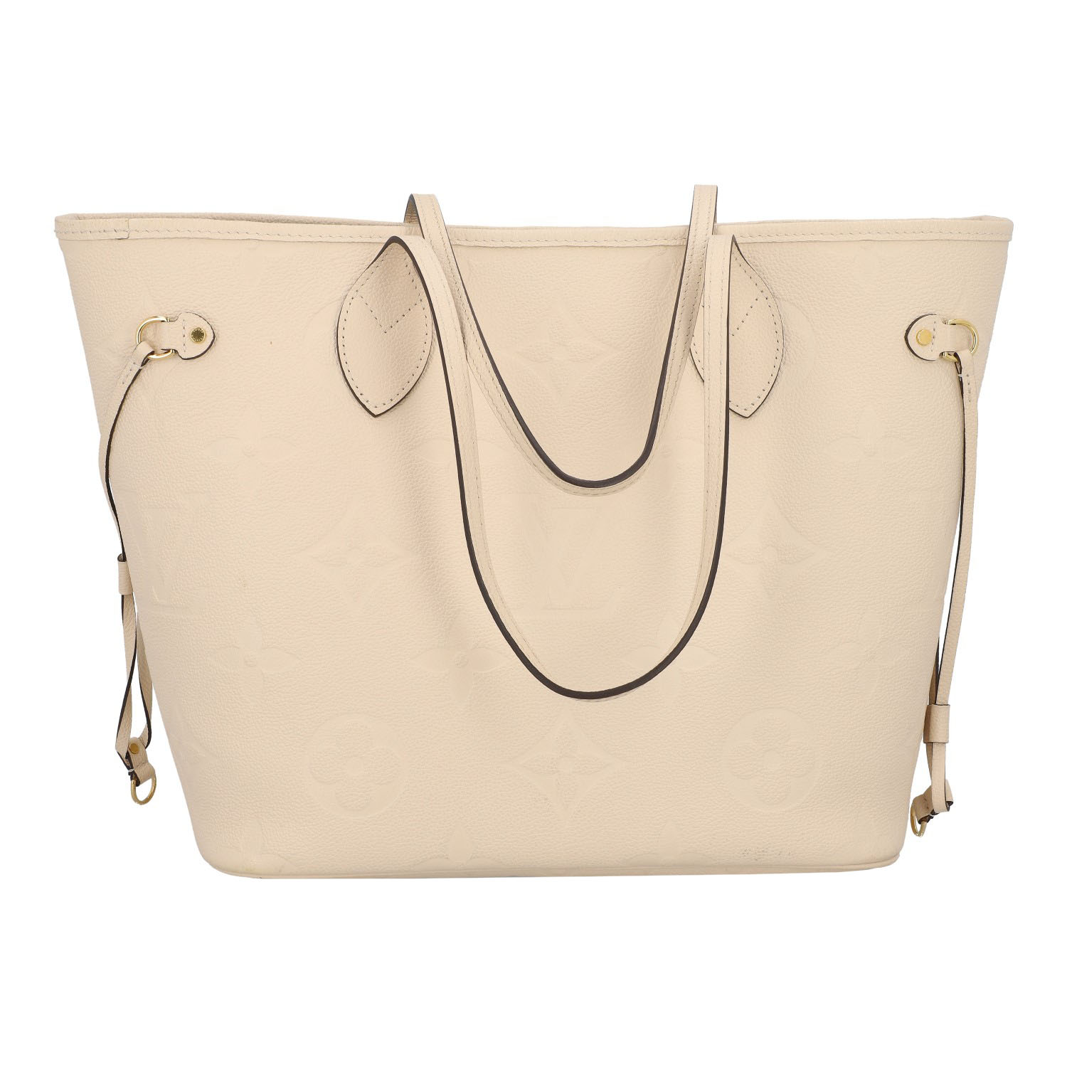 Monogram Empreinte-Leder-Serie in Creme mit goldfarbener Hardware, Doppelhenkeln und seitlichen Riemen.