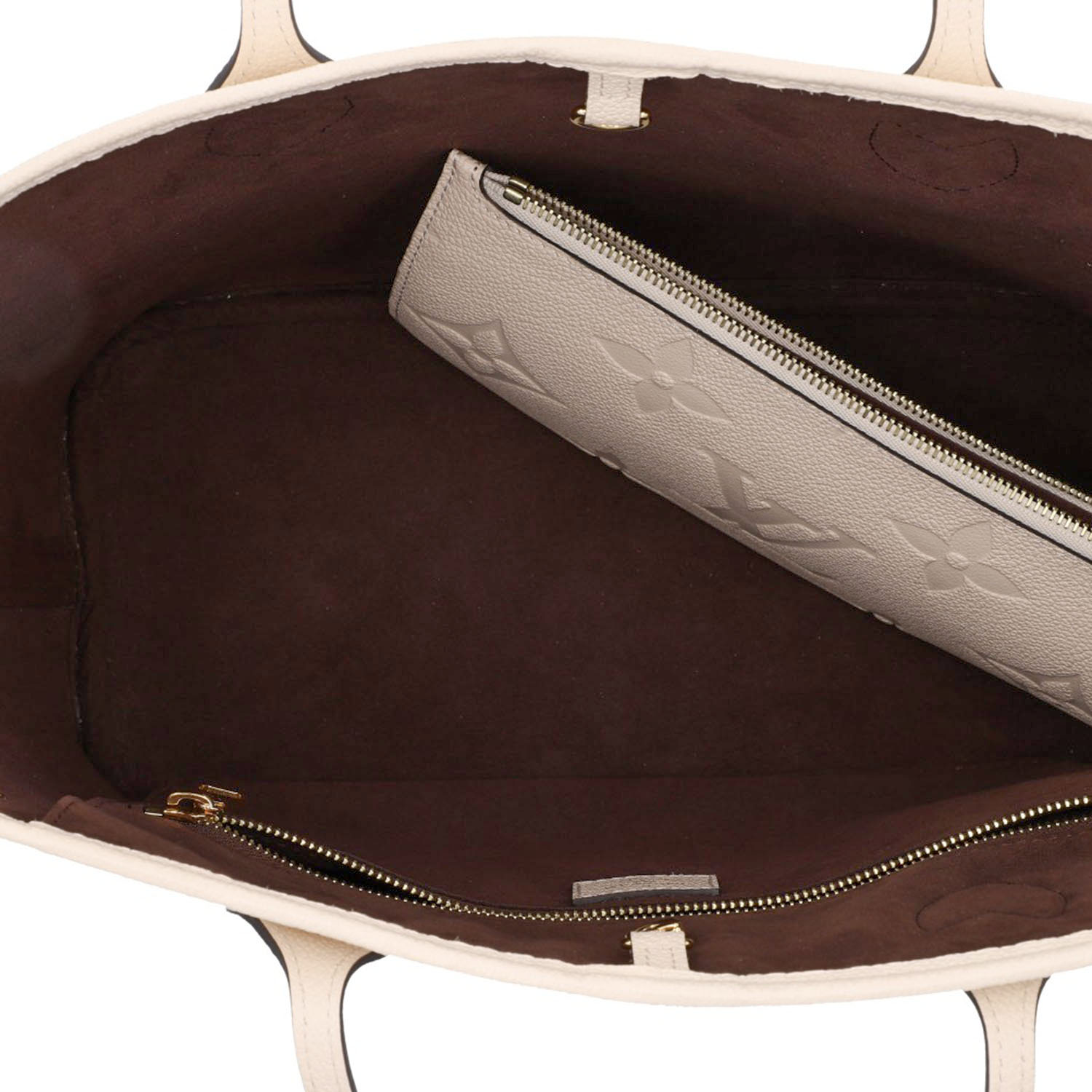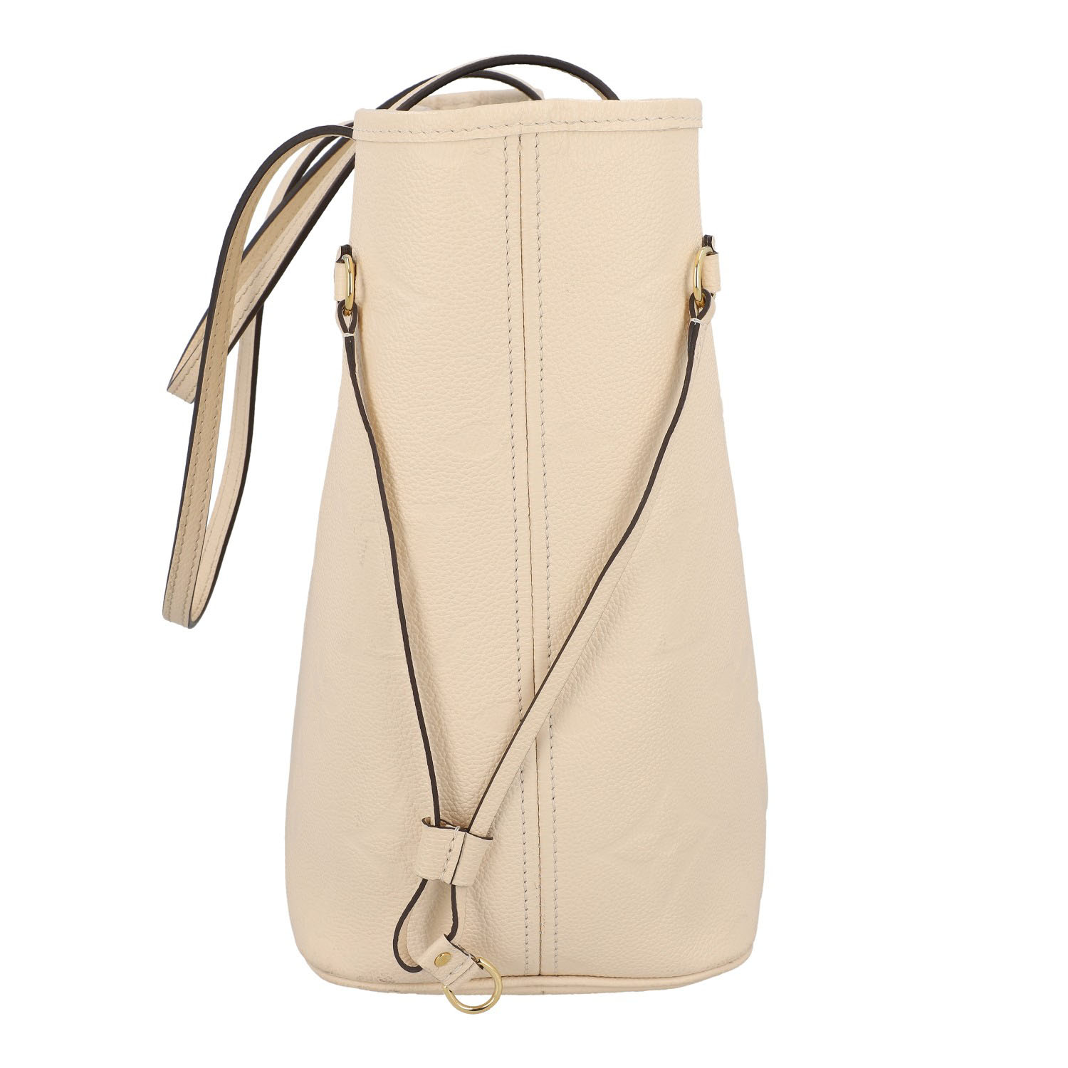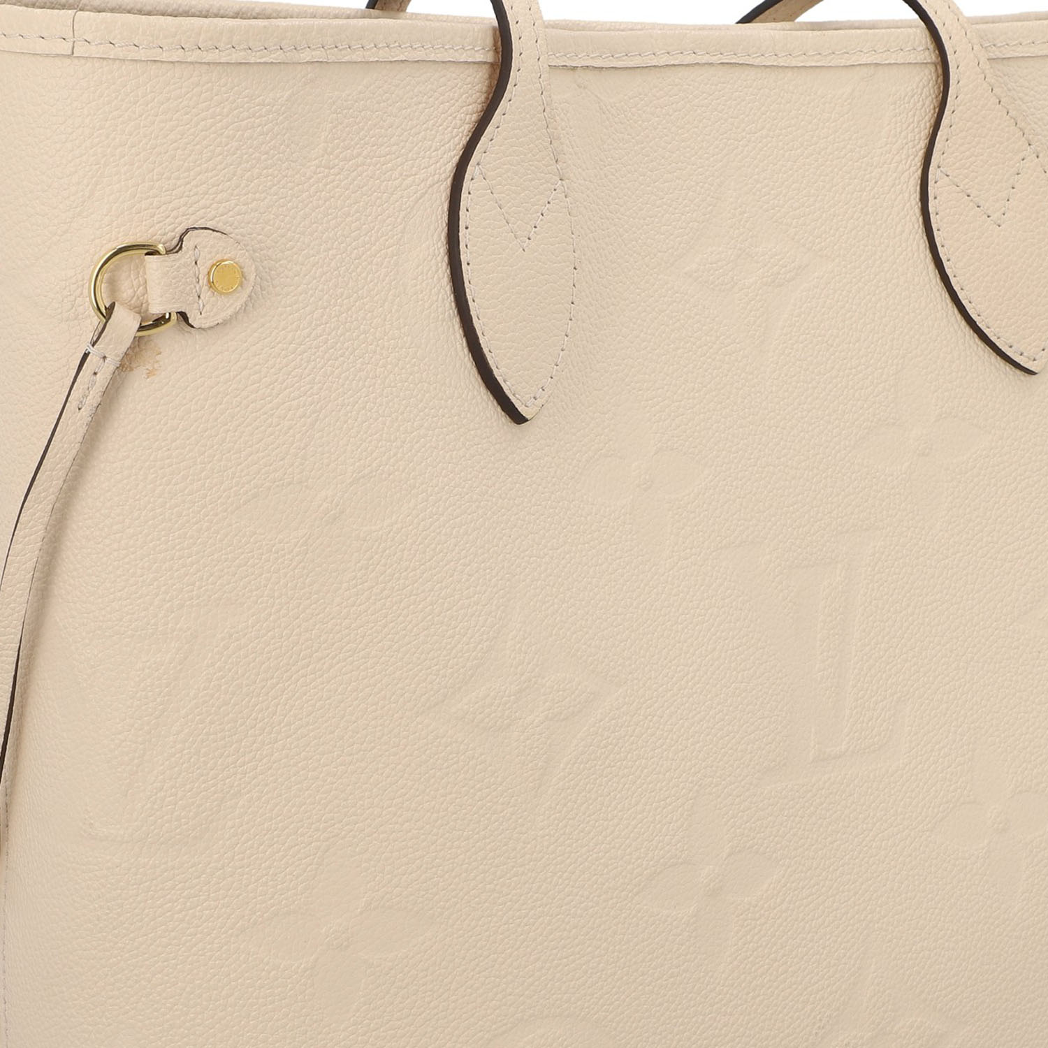 Monogram Empreinte-Leder-Serie in Creme mit goldfarbener Hardware, Doppelhenkeln und seitlichen Riemen.