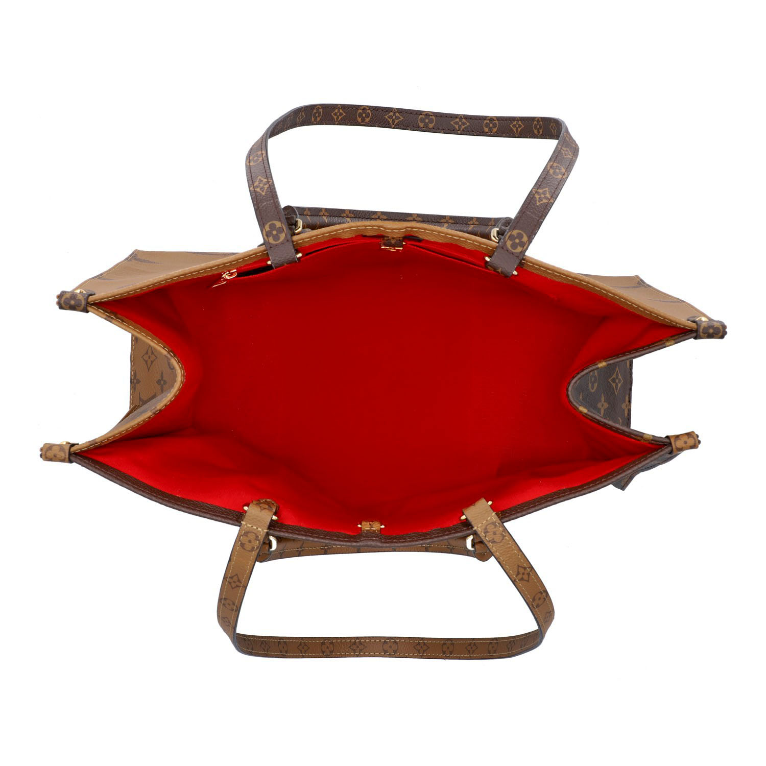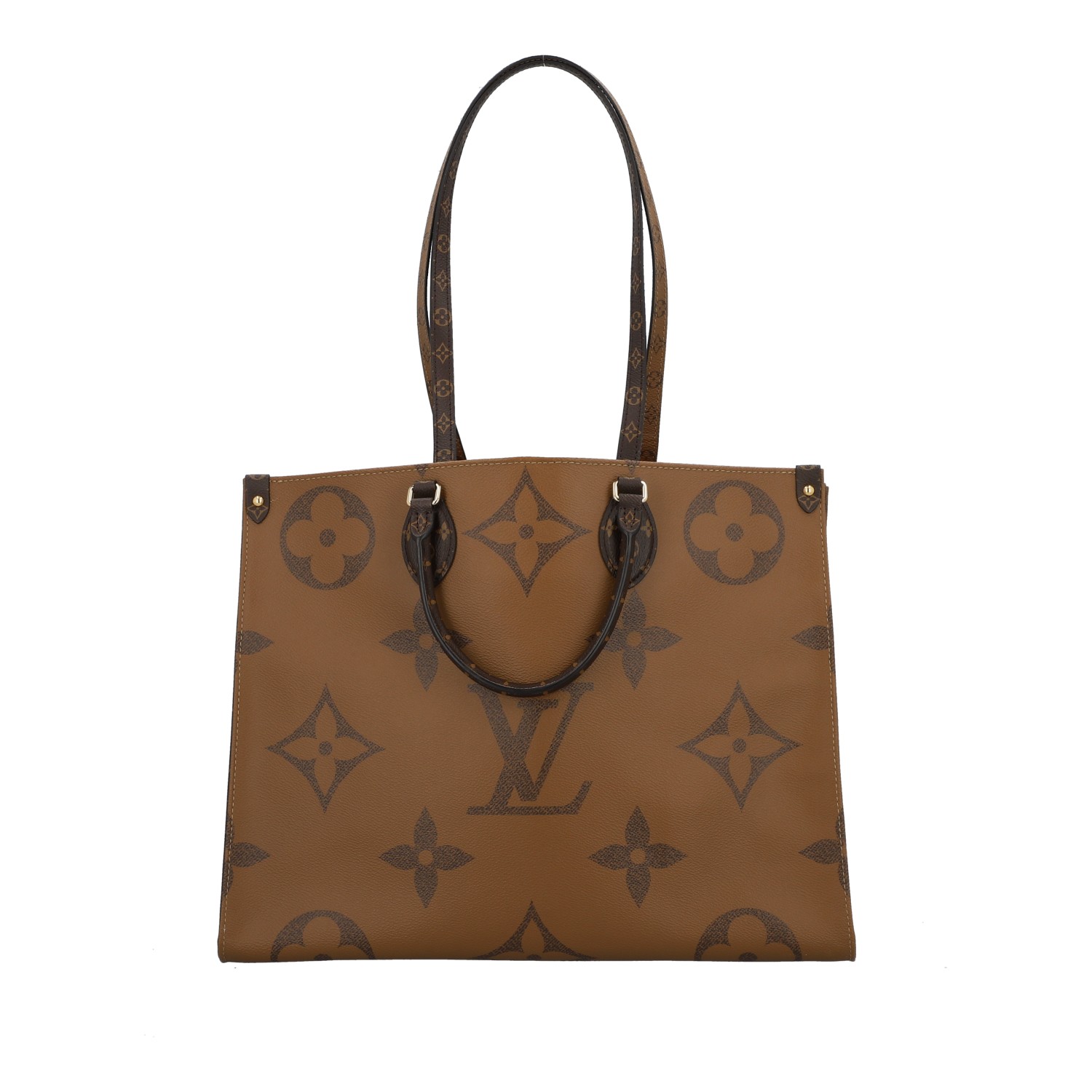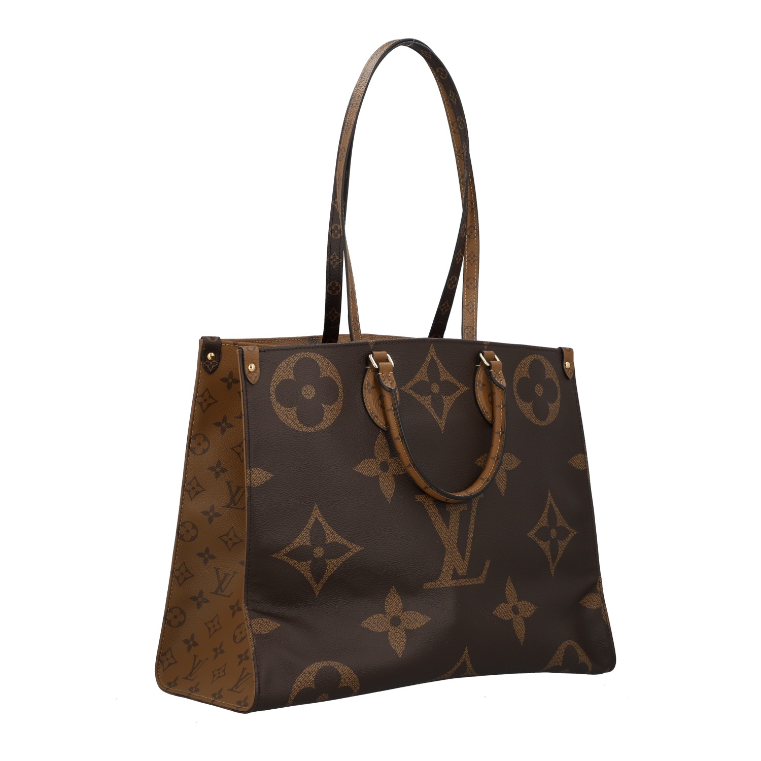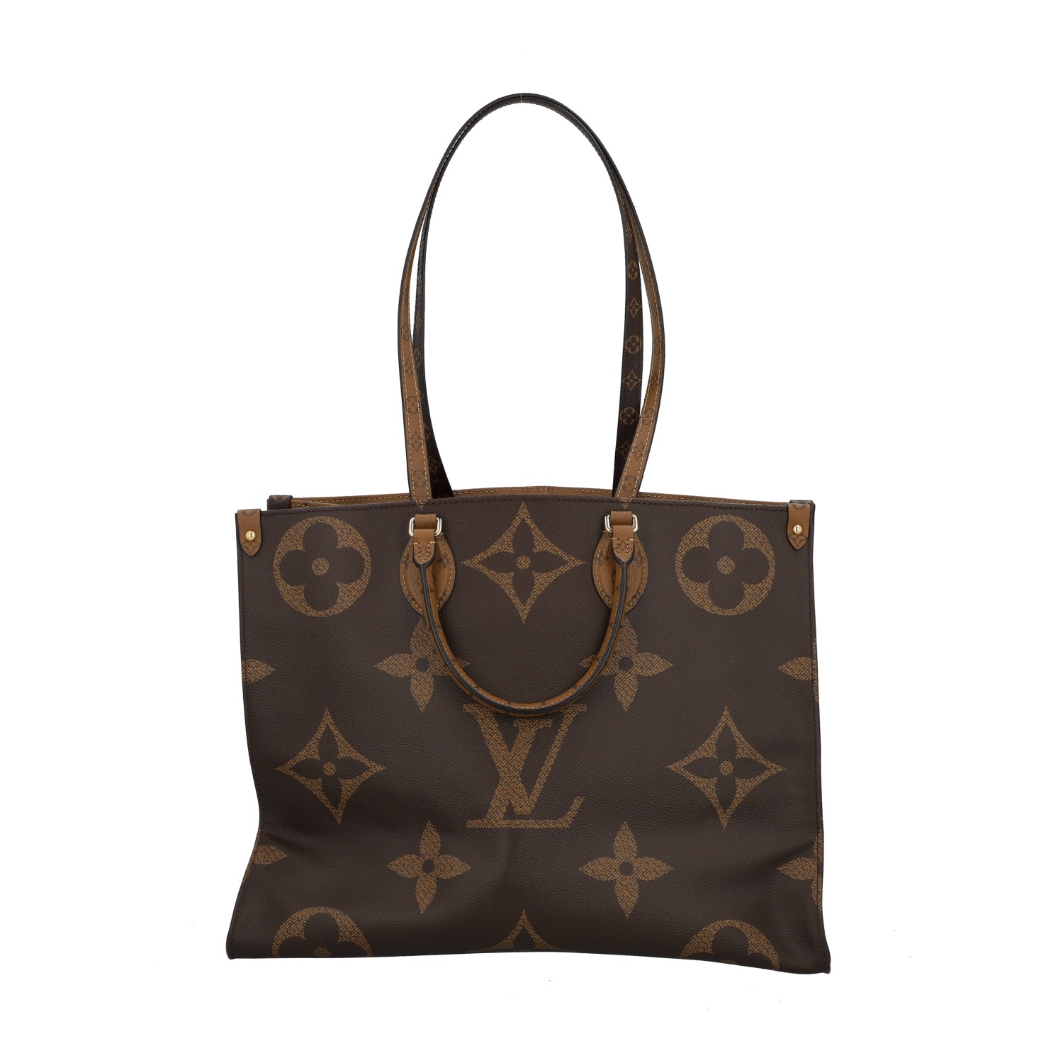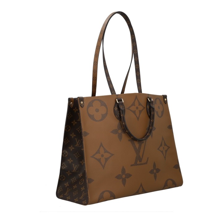Akt. NP.: 2.700,-€. Koll. 2019. Monogram Giant Canvas und Monogram Reverse mit goldfarbener Hardware. Klassisches OTG Modell mit Doppelhenkeln, rotem Innenleben und zwei längeren Trageriemen. Box und Staubbeutel anbei. Leichte Gebrauchsspuren vorhanden. 40,5x17x32cm.