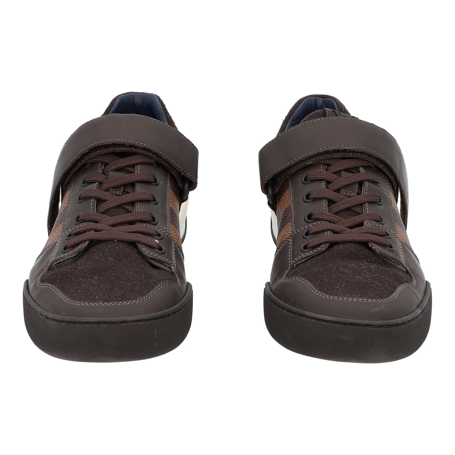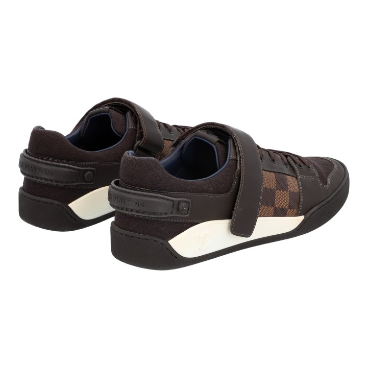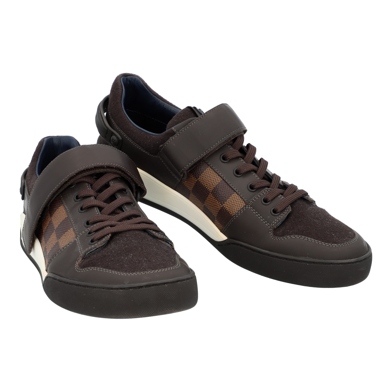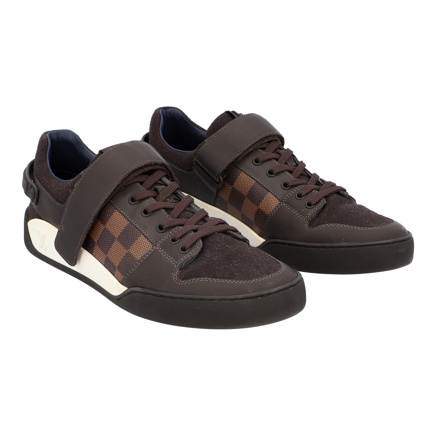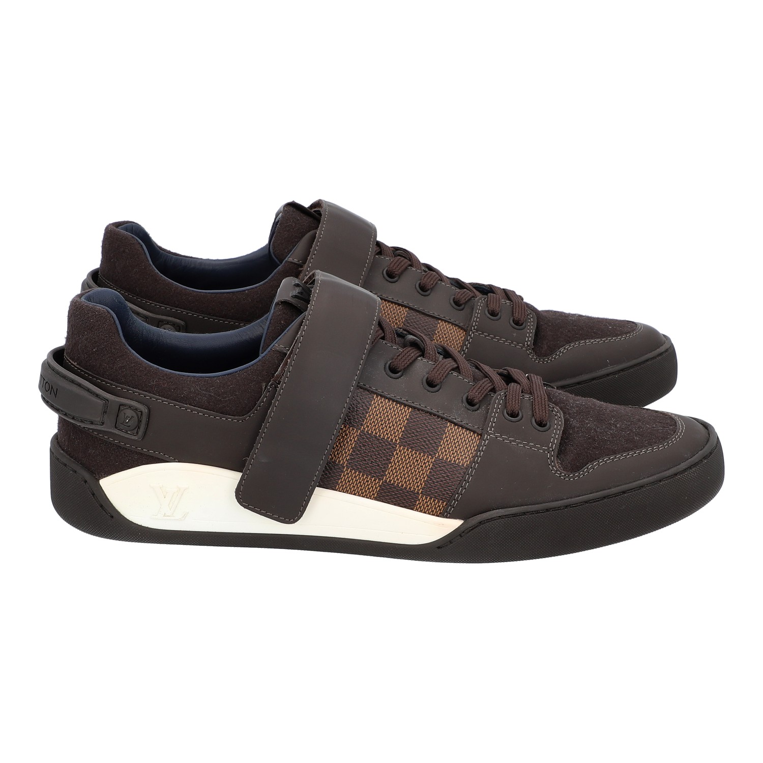 Damier Ebene Canvas Serie mit Details aus Leder und Filz, Schnürung und Klettverschlussband. Box anbei. Tragespuren vorhanden.