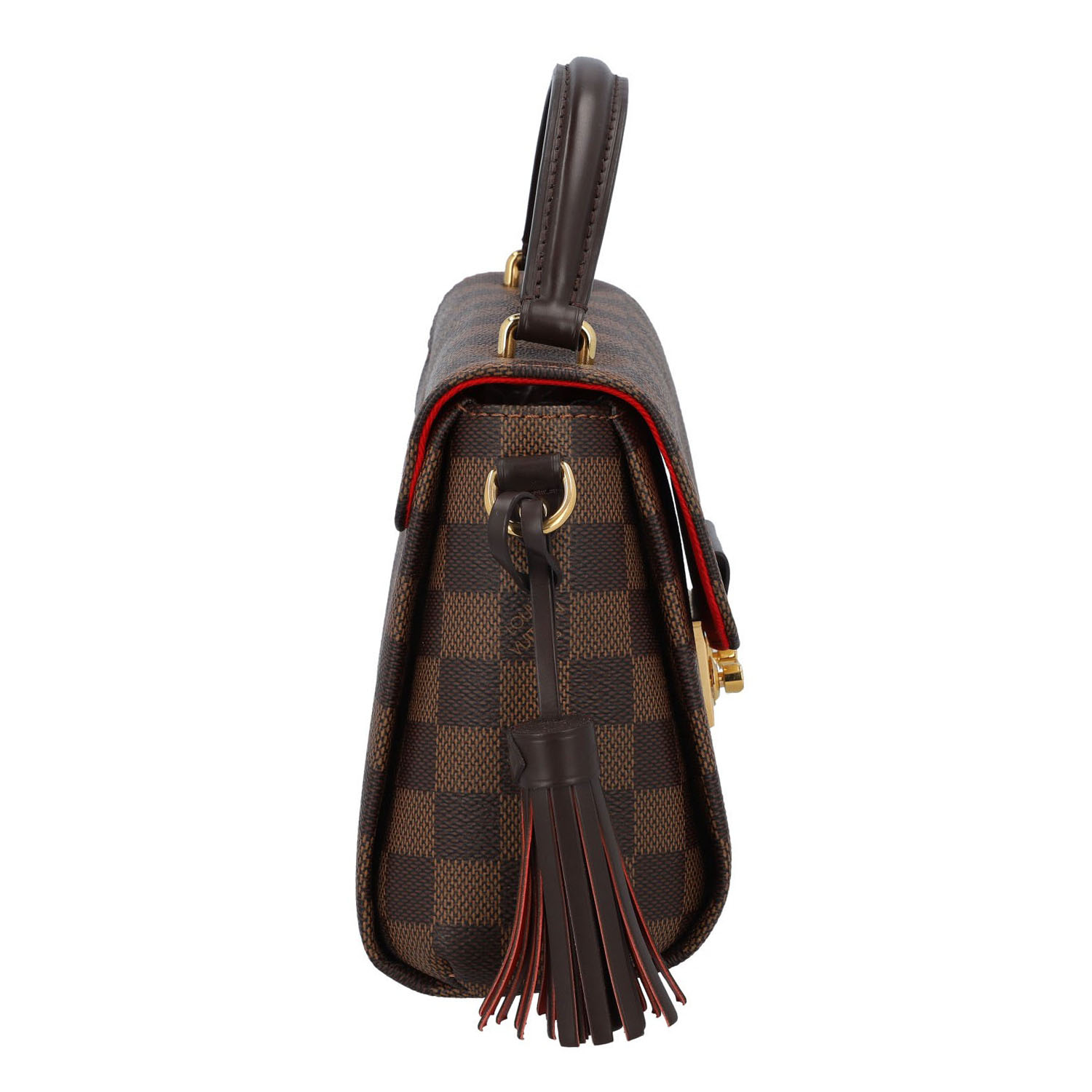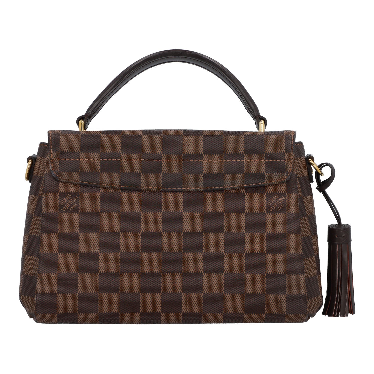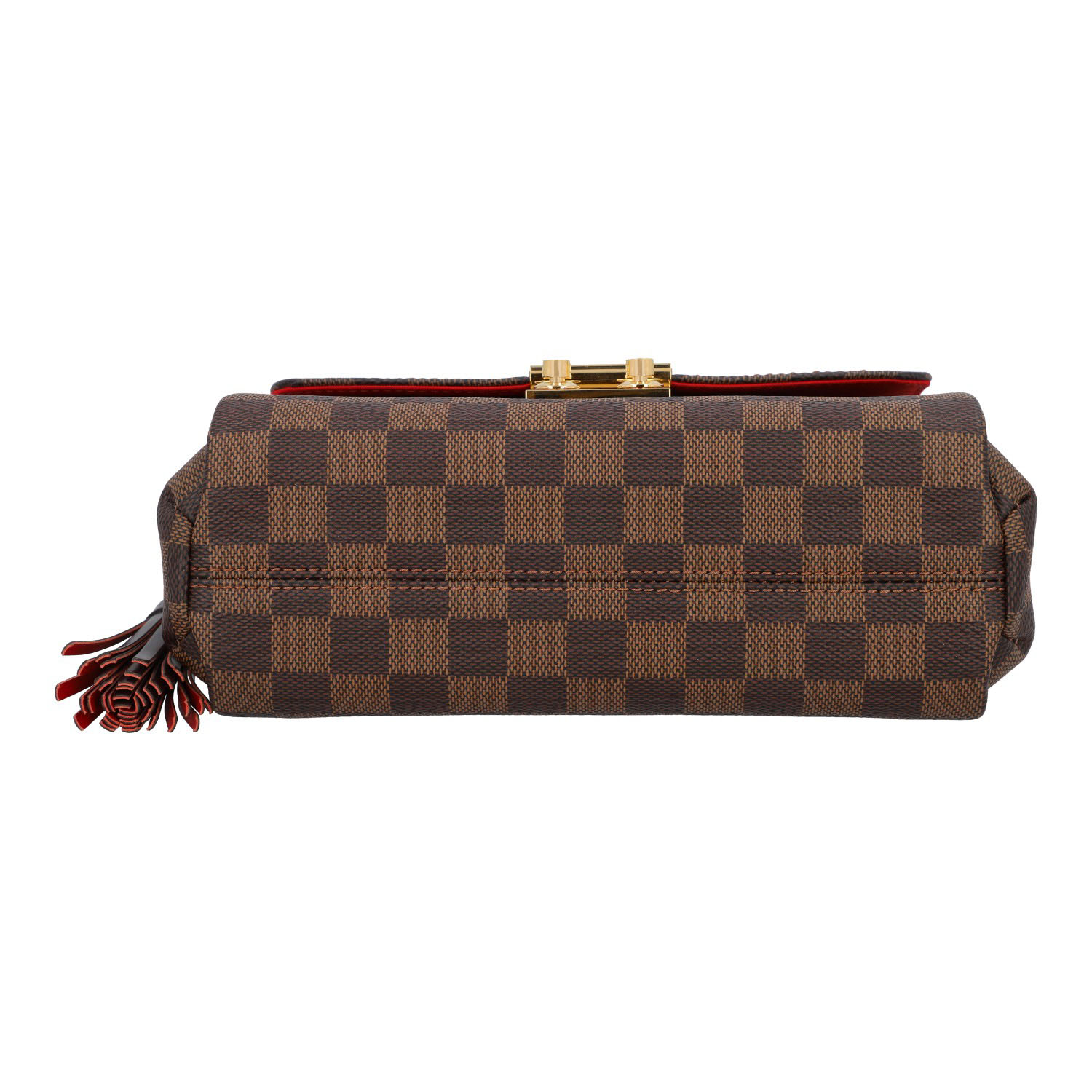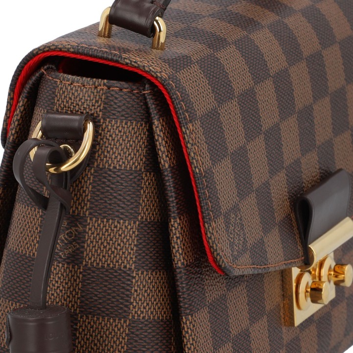 Damier Ebene Canvas-Serie mit dunkelbraunen Details aus Glattleder und goldfarbener Hardware.
