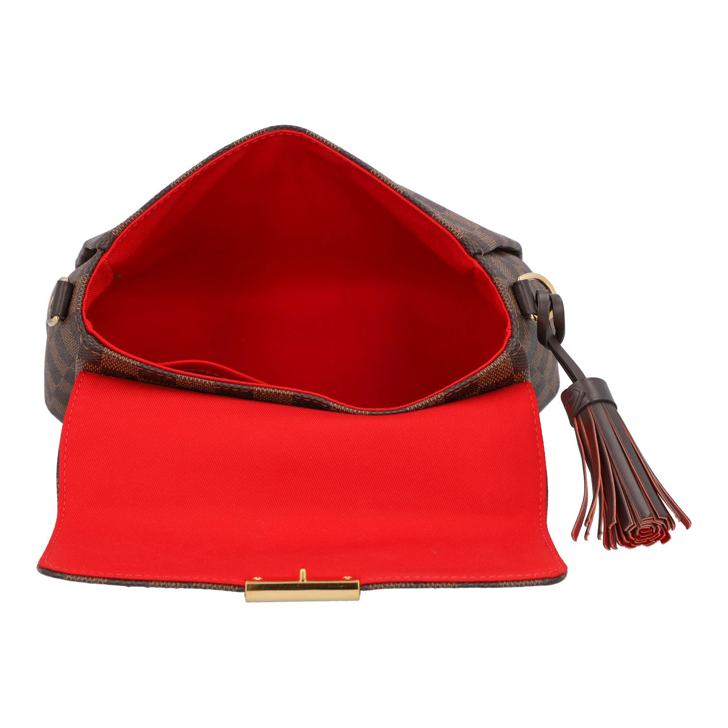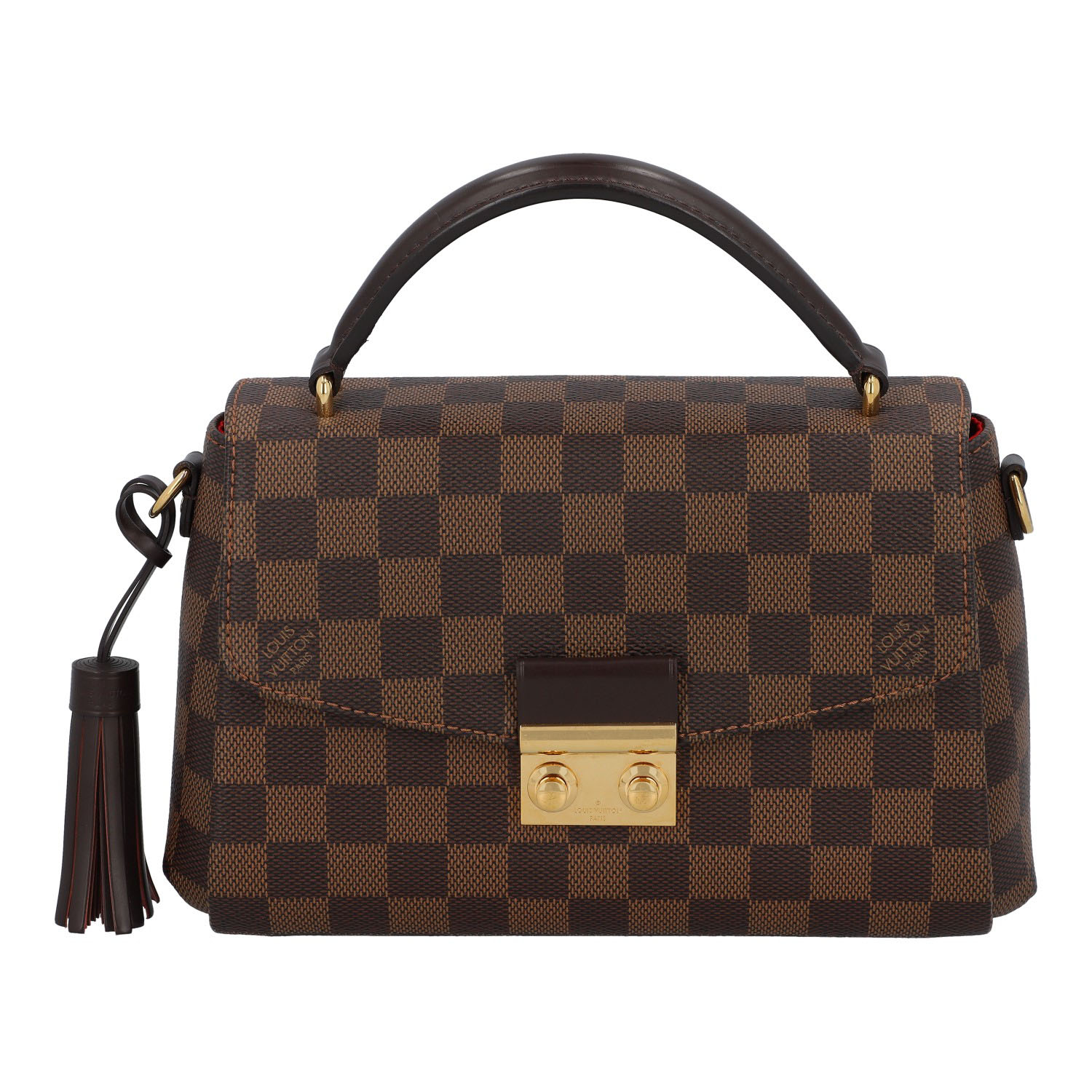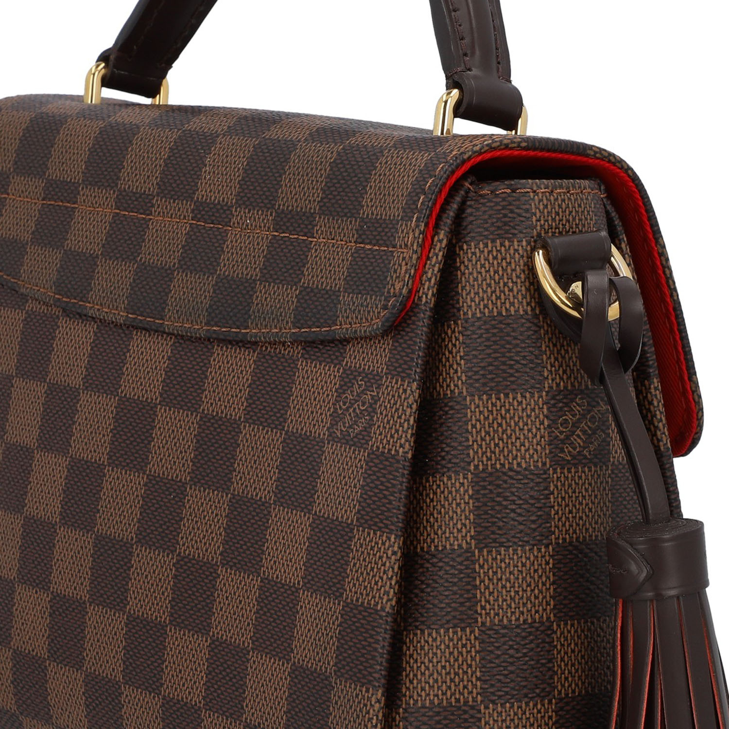 Damier Ebene Canvas-Serie mit dunkelbraunen Details aus Glattleder und goldfarbener Hardware.