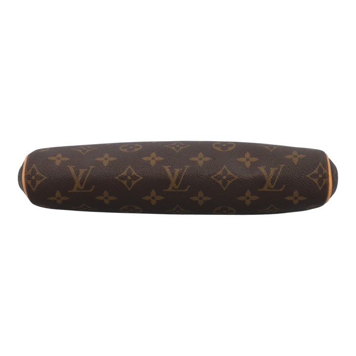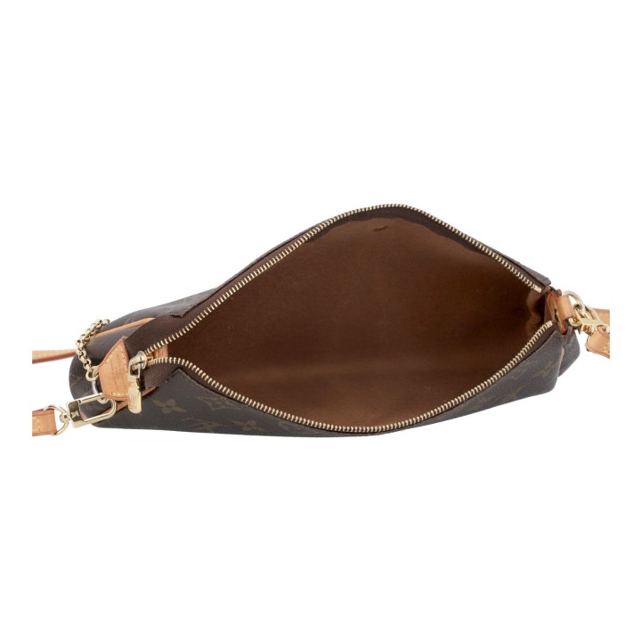 Monogram-Canvas-Serie mit Rindsleder-Details, goldfarbener Hardware, Reißverschluss sowie Ketten- und Lederriemen. Gebrauchsspuren vorhanden, Flecken im Innenraum. 27 x 11 x 5 cm.