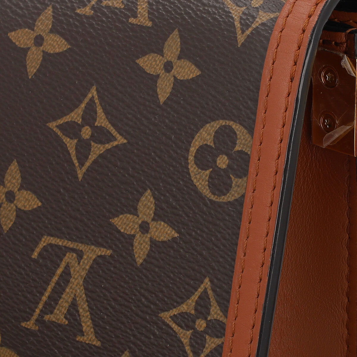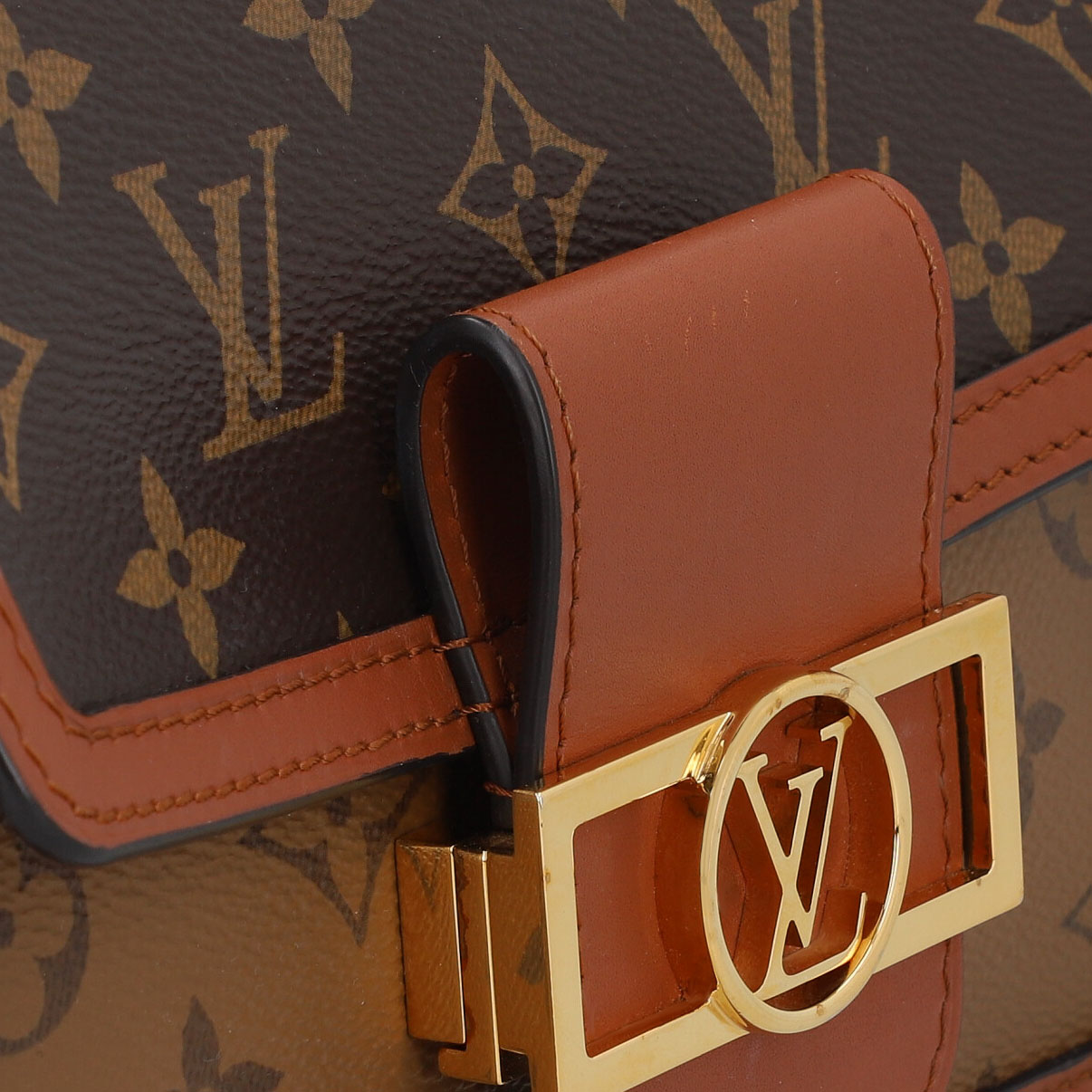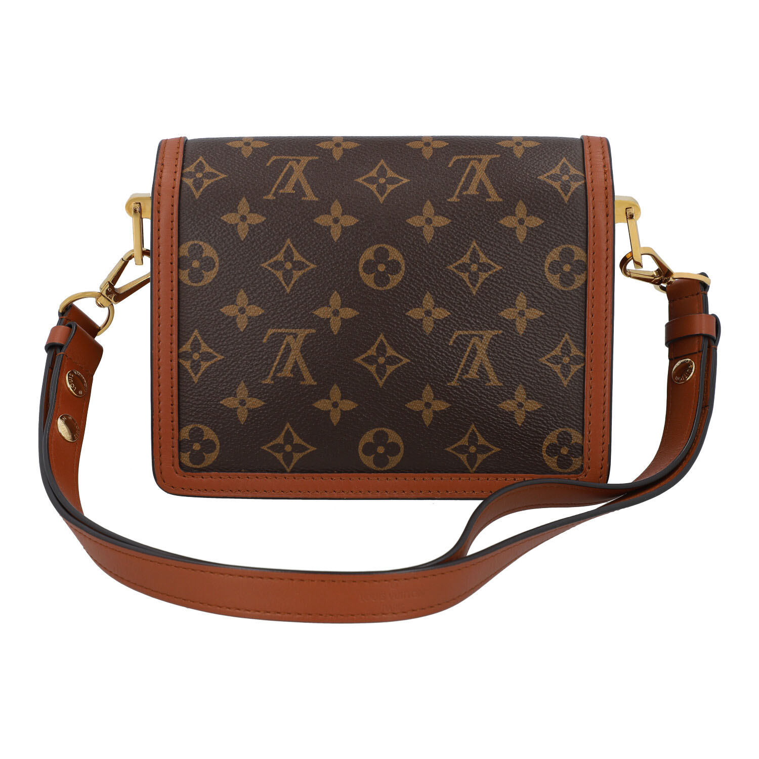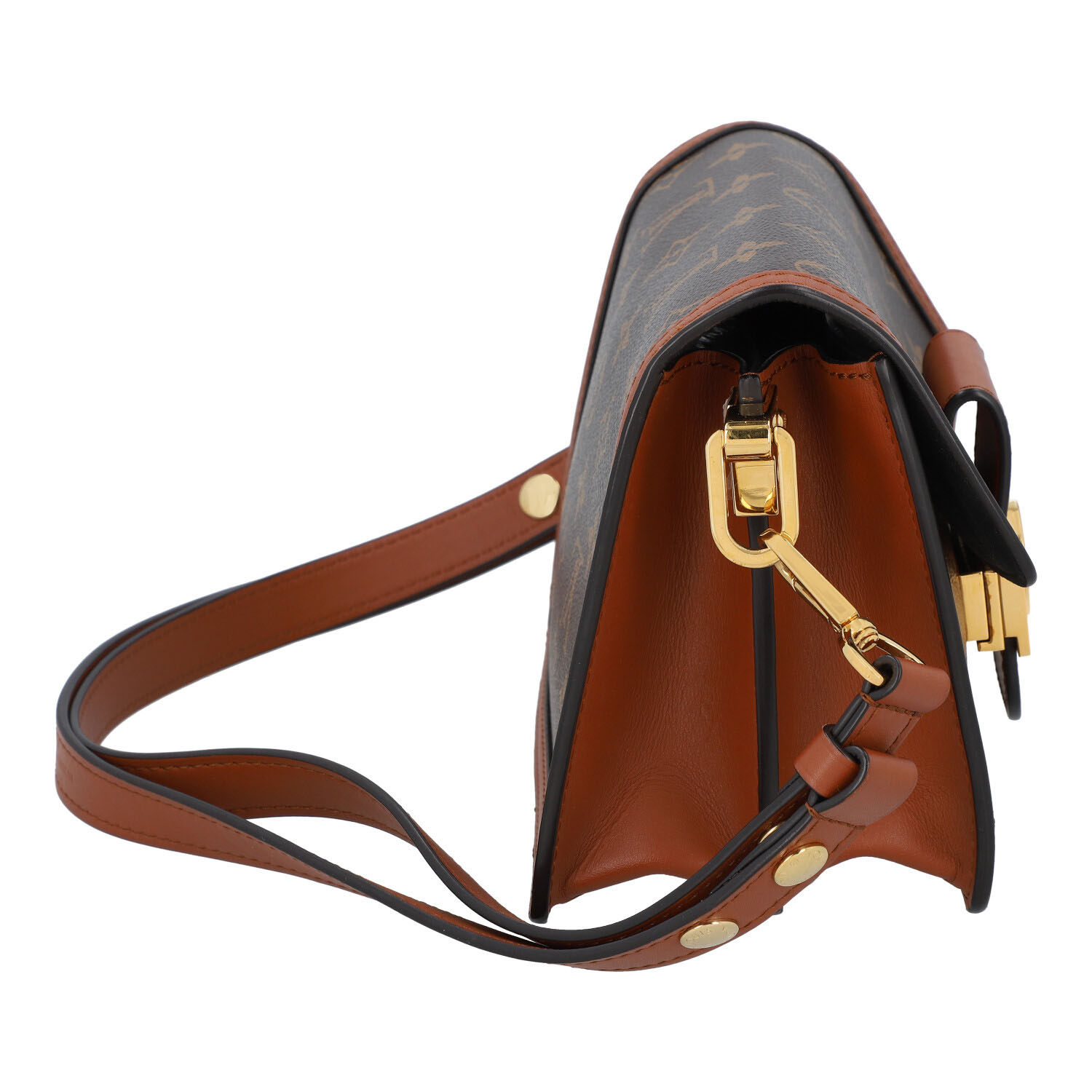Monogram Canvas und Monogram Reverse Canvas mit Besätzen aus Rindsleder, goldfarbener Hardware, Überschlag mit Logo-Dekor, abnehmbarem und längenverstellbarem Schulterriemen. Innenraum aus Microfaser in Schwarz mit zwei Abteilen und einem Fach. Staubbeutel anbei. Gebrauchsspuren vorhanden. 20 x 15 x 9 cm.