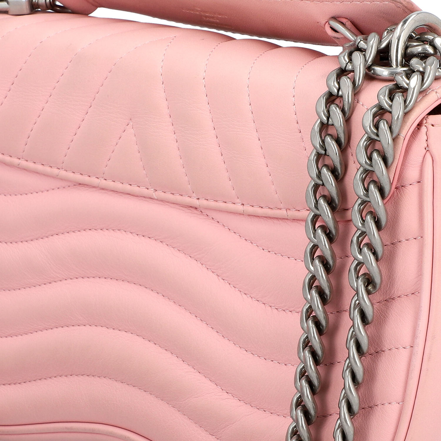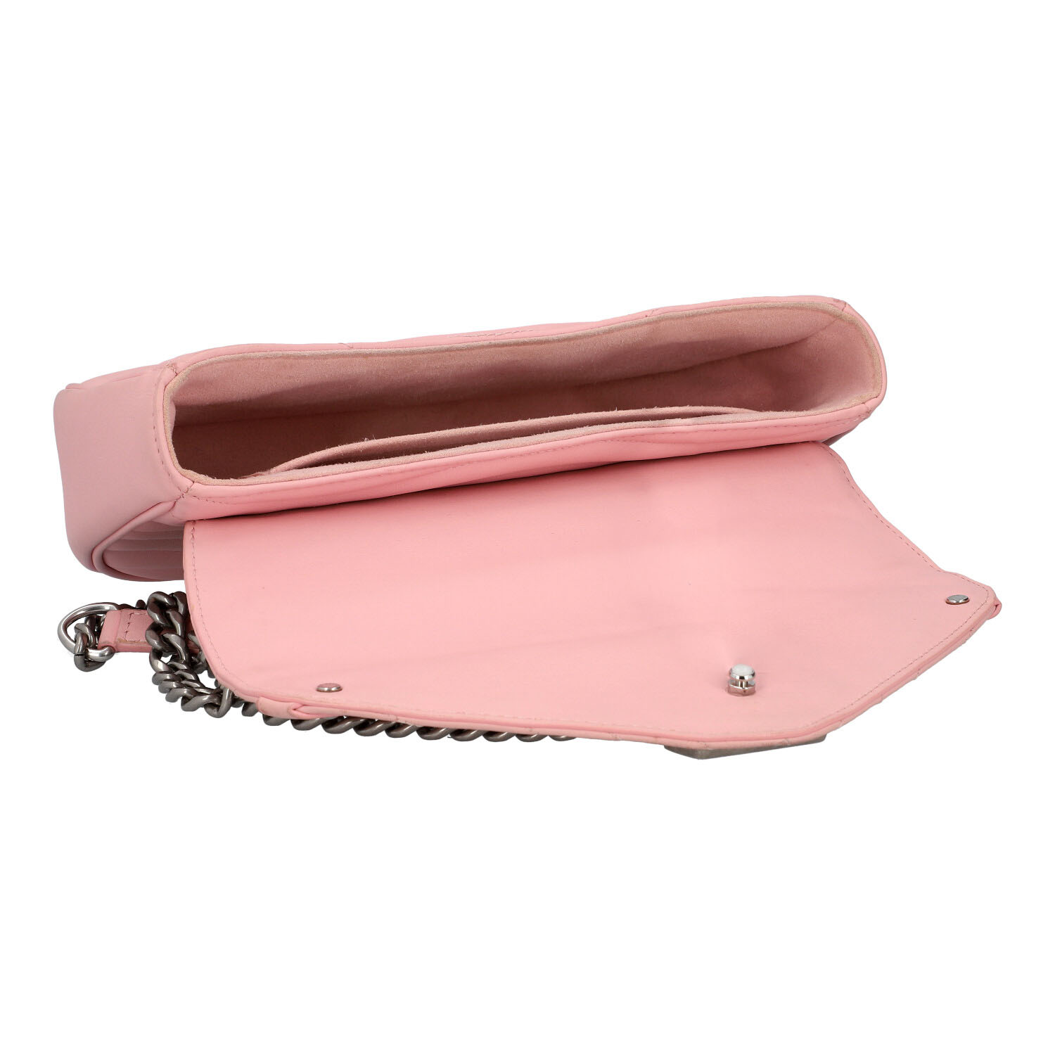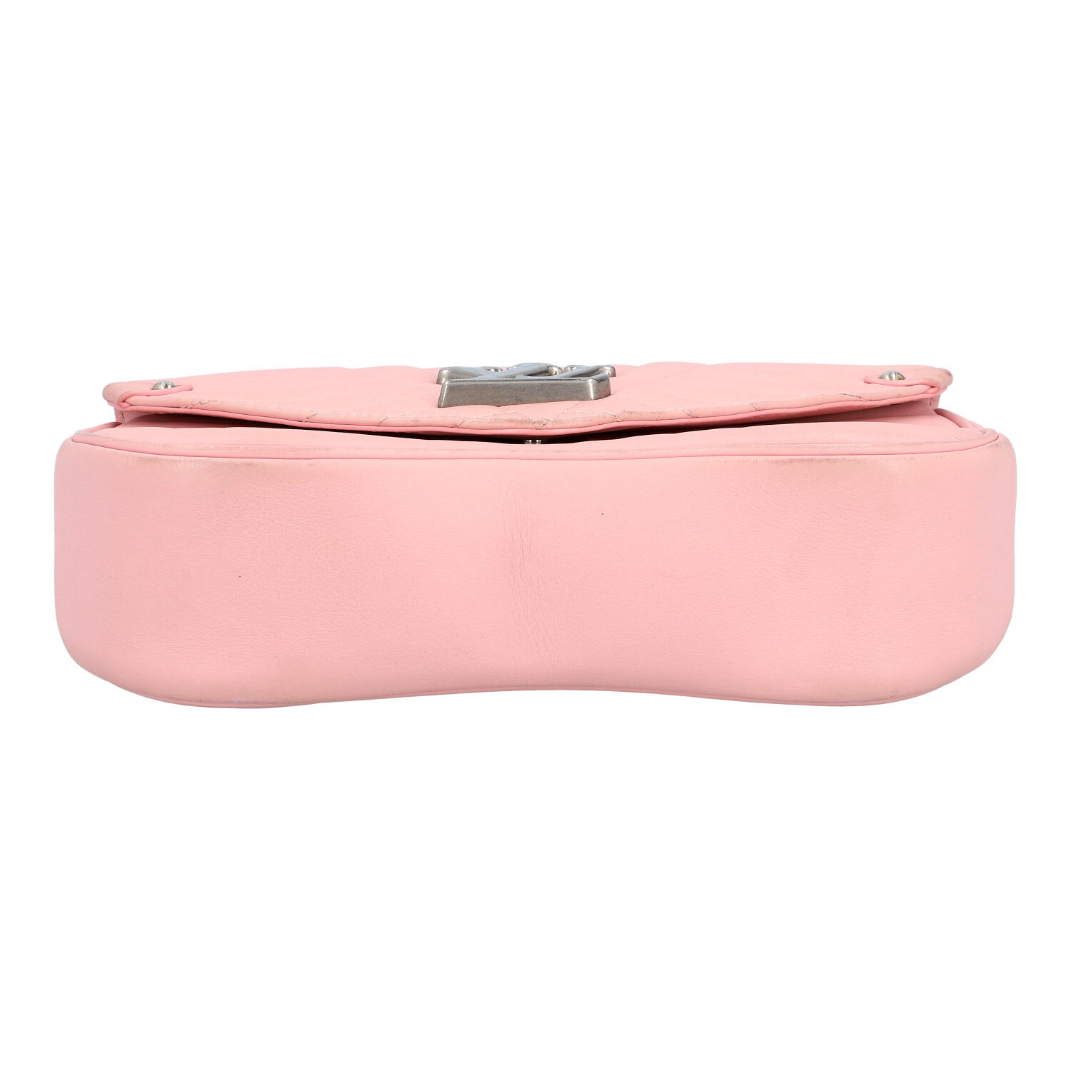 Koll. 2018. Leder in Rosa mit silberfarbener Hardware. Ein abnehmbarer Griff mit Schriftzug in Multicolor. Gliederkettenriemen, Überschlag mit Klickverschluss. Leichte Verfärbungen und Abrieb vorhanden.