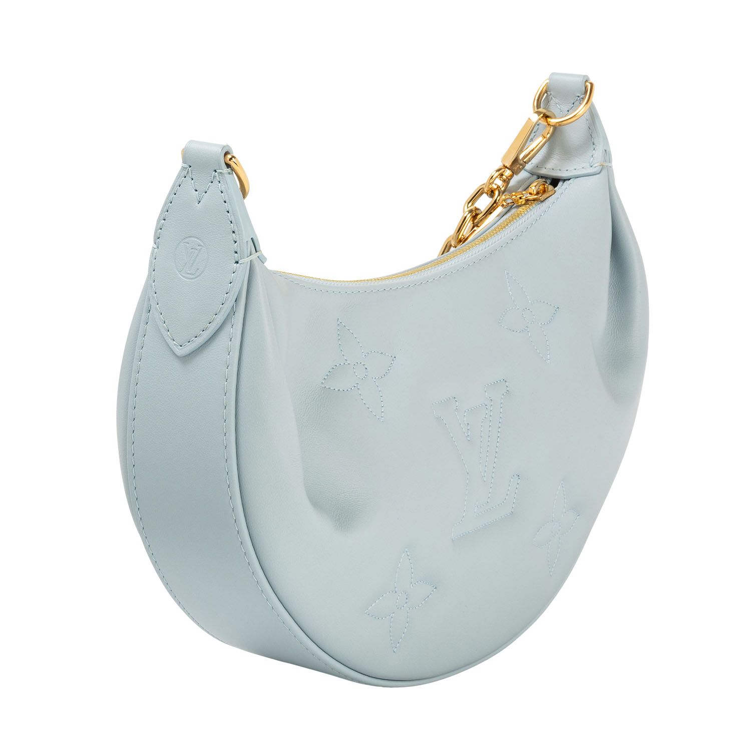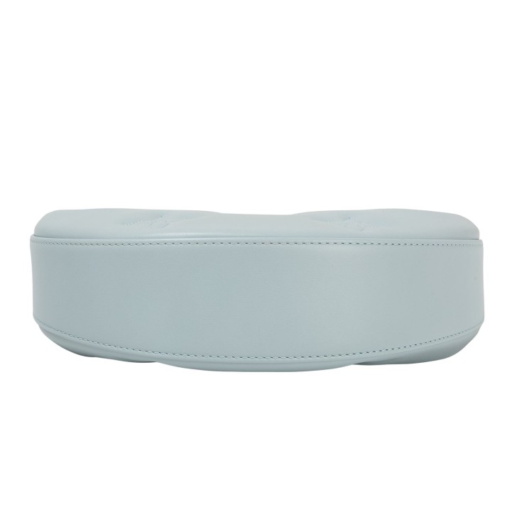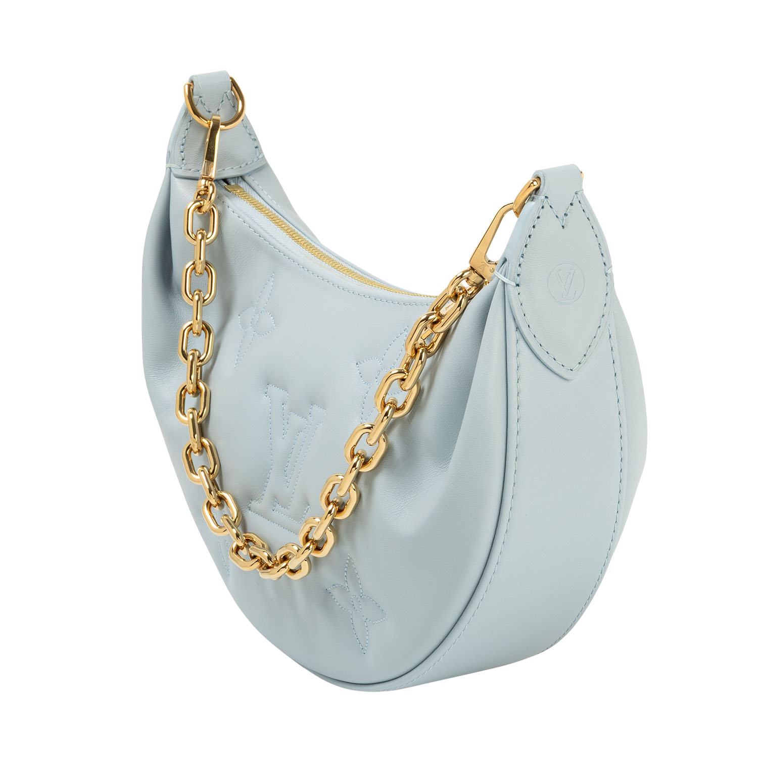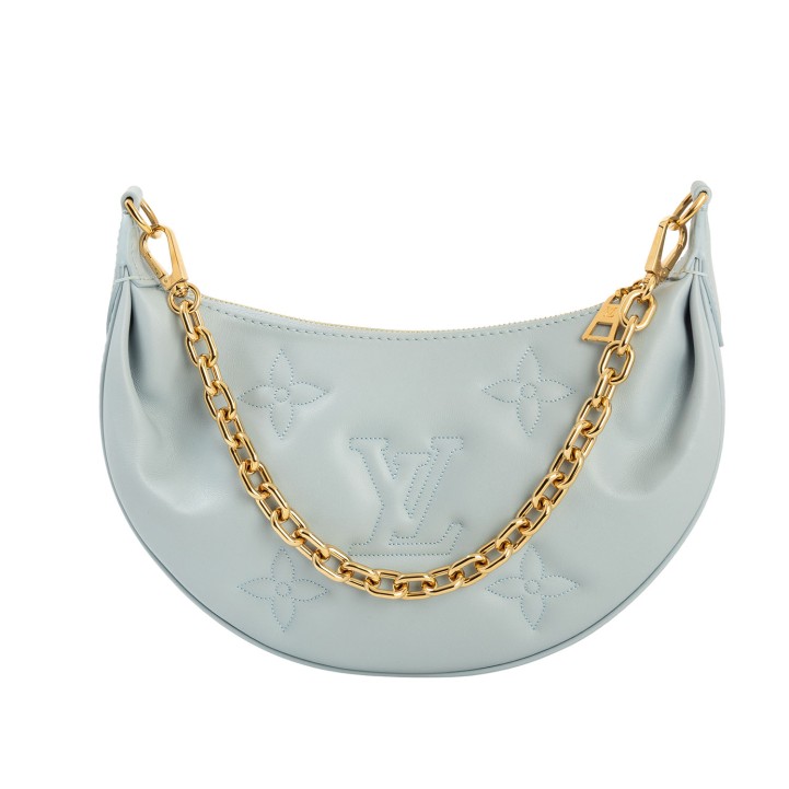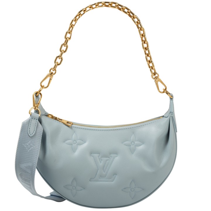 Koll. 2022. Kalbsleder in Eisblau mitaufgesticktem Monogram-Motiv. Hardware in Goldfarben. Halbmond-Form mit Reißverschluss. Kurzer Gliederkettenriemen und langer Textilgurt. Box, Staubbeutel, Schulterriemen und Papiere anbei. Leichte Flecken vorhanden.