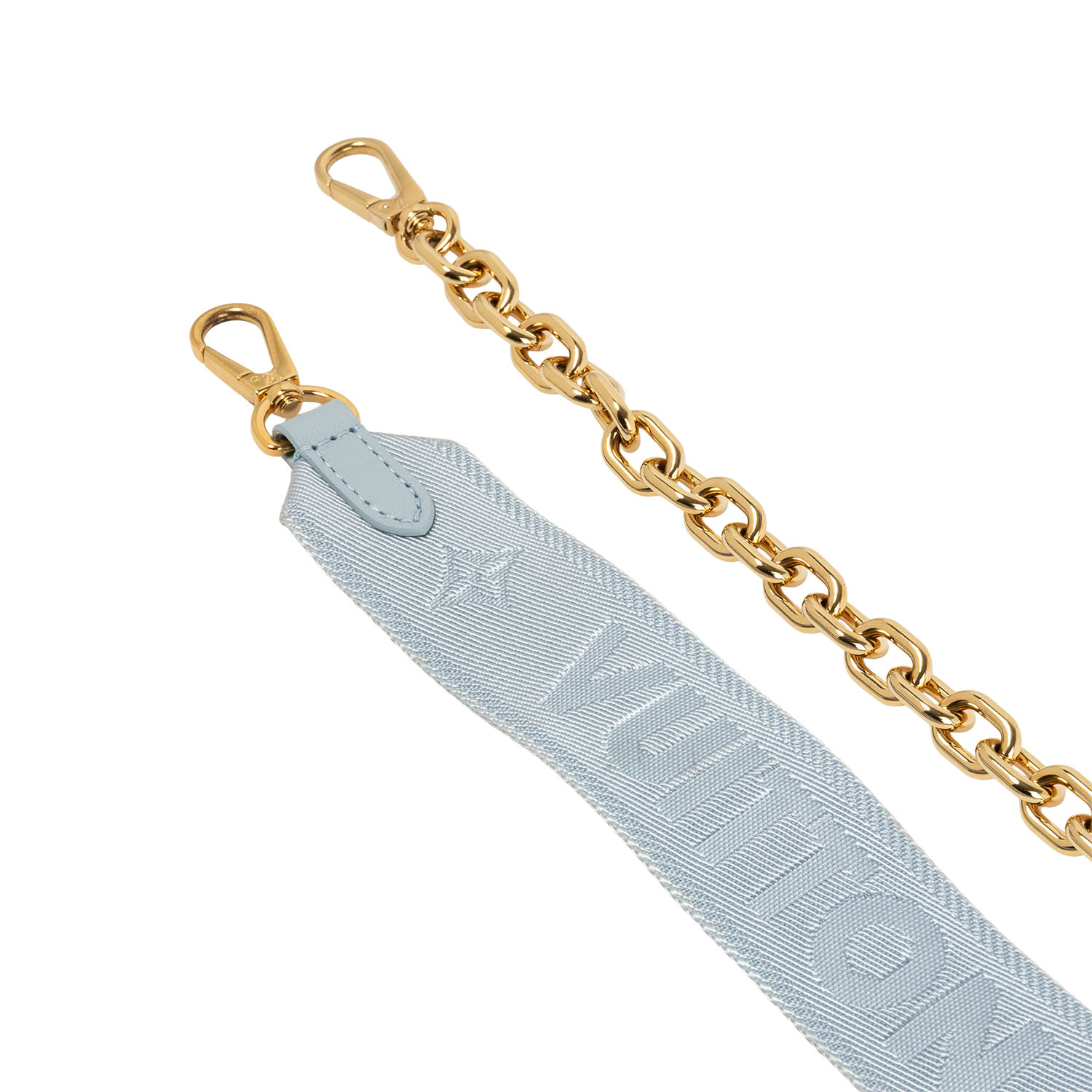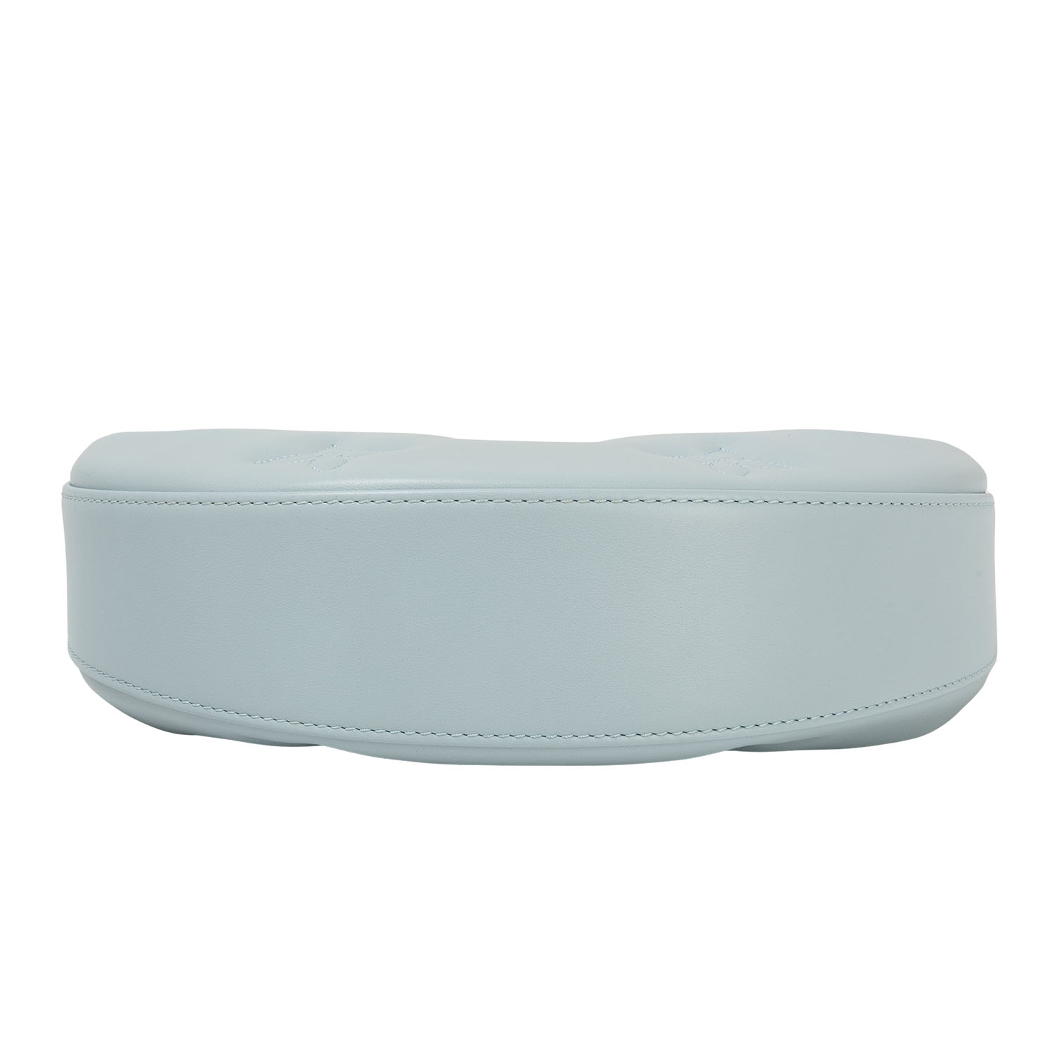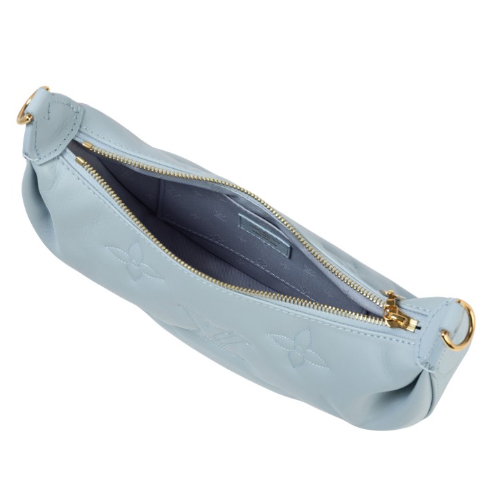 Koll. 2022. Kalbsleder in Eisblau mitaufgesticktem Monogram-Motiv. Hardware in Goldfarben. Halbmond-Form mit Reißverschluss. Kurzer Gliederkettenriemen und langer Textilgurt. Box, Staubbeutel, Schulterriemen und Papiere anbei. Leichte Flecken vorhanden.