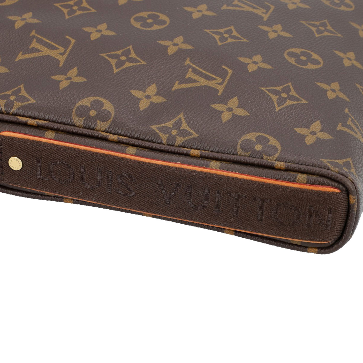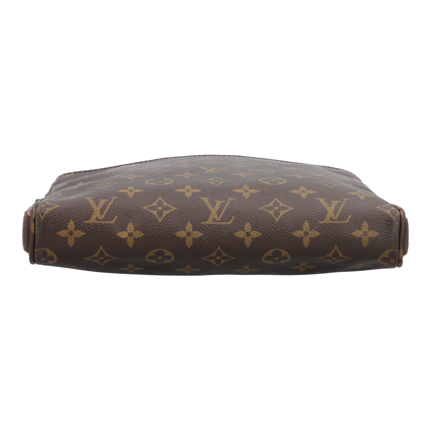 Monogram Canvas Serie mit goldfarbener Hardware, Schulterriemen, Reißverschluss und Außenfach. Innenraum aus Textil mit vier Fächern und zwei Stiftefächern. Gebrauchsspuren vorhanden. 24,5 x 4 x 27 cm.