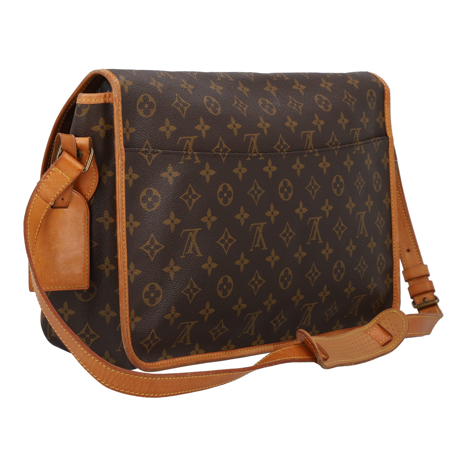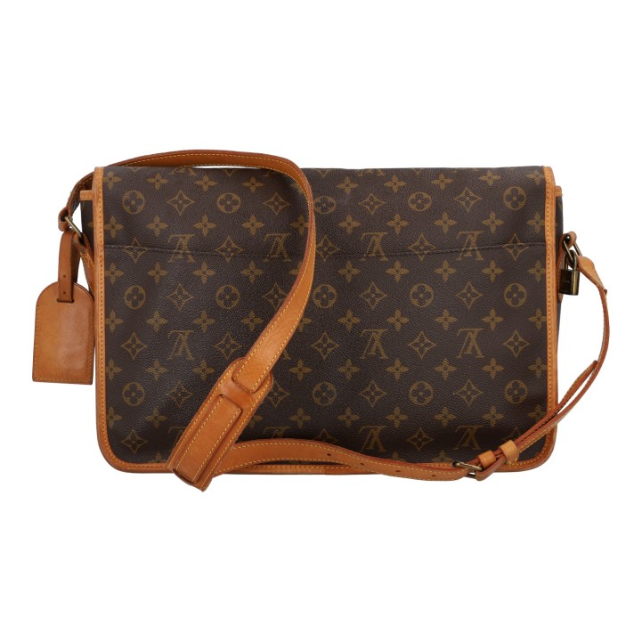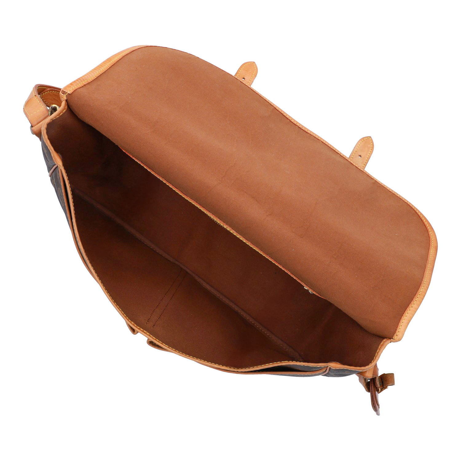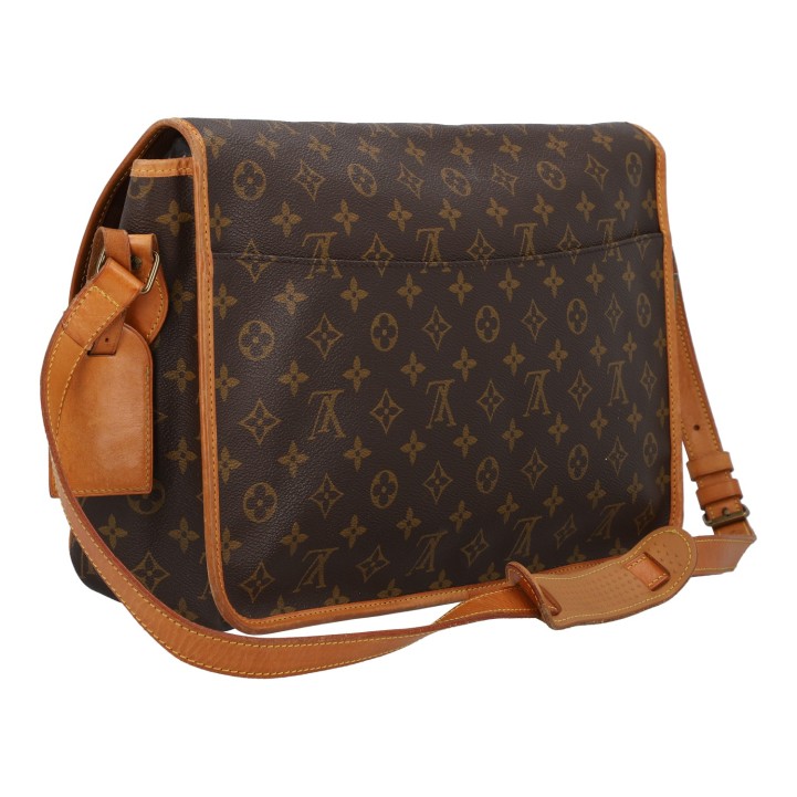 Koll. 1991. Monogram Canvas Serie mit naturbelassenem Leder und goldfarbener Hardware. Diverse Innenfächer mit Laschenverschluss und Dornschließe. Ein Außenfach, textiles Innenfutter. Längenverstellbarer Trageriemen, Adressanhänger. Starke Patina und Abrieb vorhanden. 37x10x27cm.