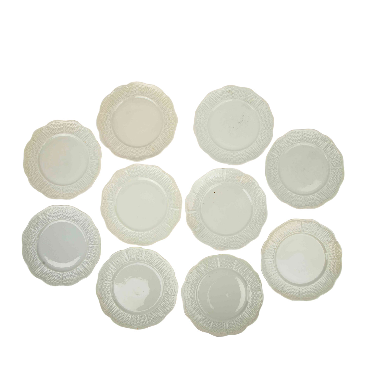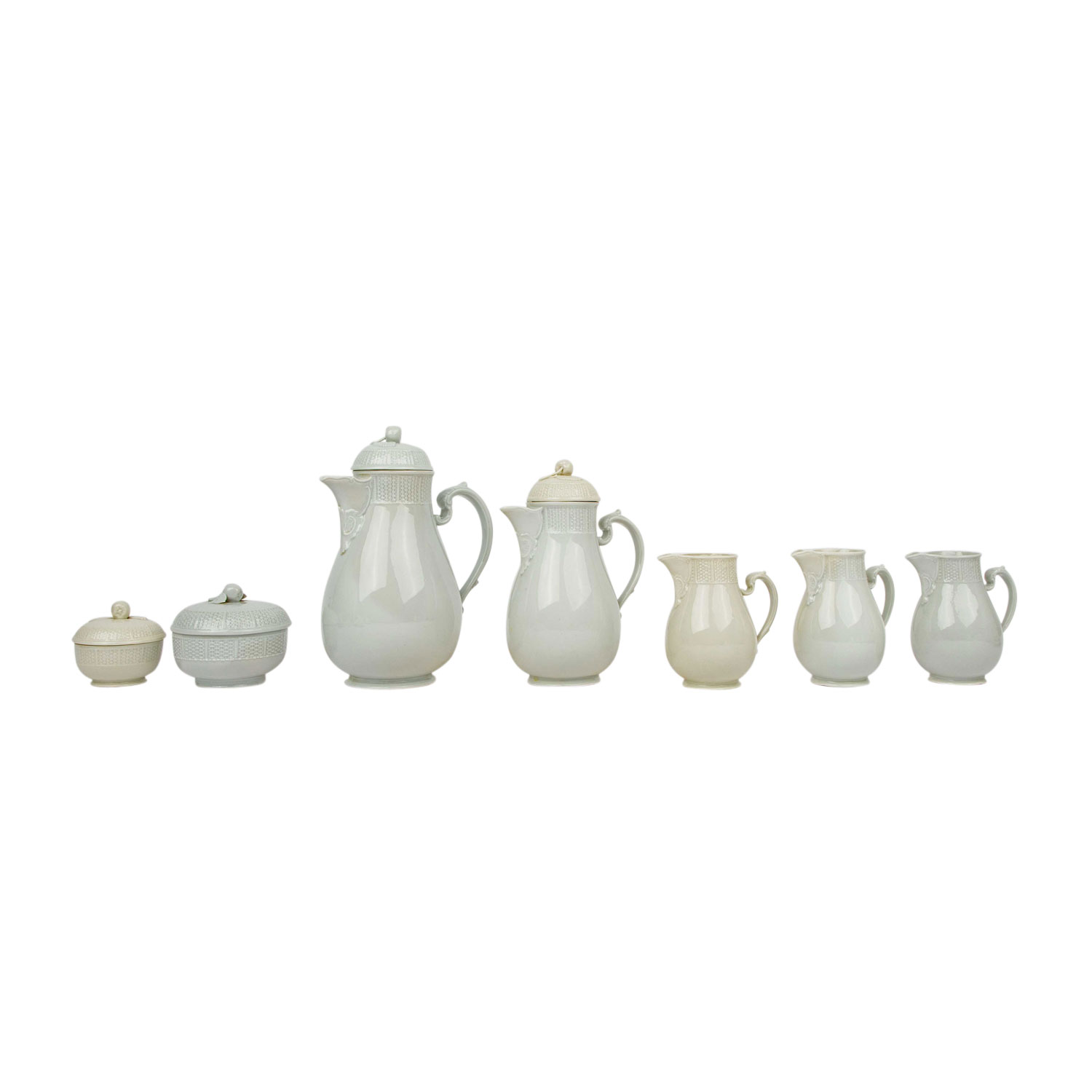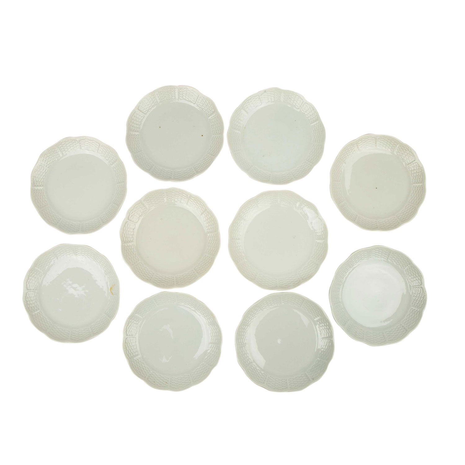 Weißporzellan, 'Flechtrand': 9 Kaffeetassen, 10 Untertassen, 10 Kuchenteller, 1 Kaffeekanne, 1 Mokkakanne, 3 Milchkännchen, 2 unterschiedlich große Zuckerdosen und 4 geschweifte Schälchen (3x mit Kordelrand, 1x glatt, L. ca. 17 cm). Alters- und Gebrauchsspuren, teilweise mit kleinen Bestoßungen, Glasurfehler, Einschlüsse, verschiedene Weißtöne.