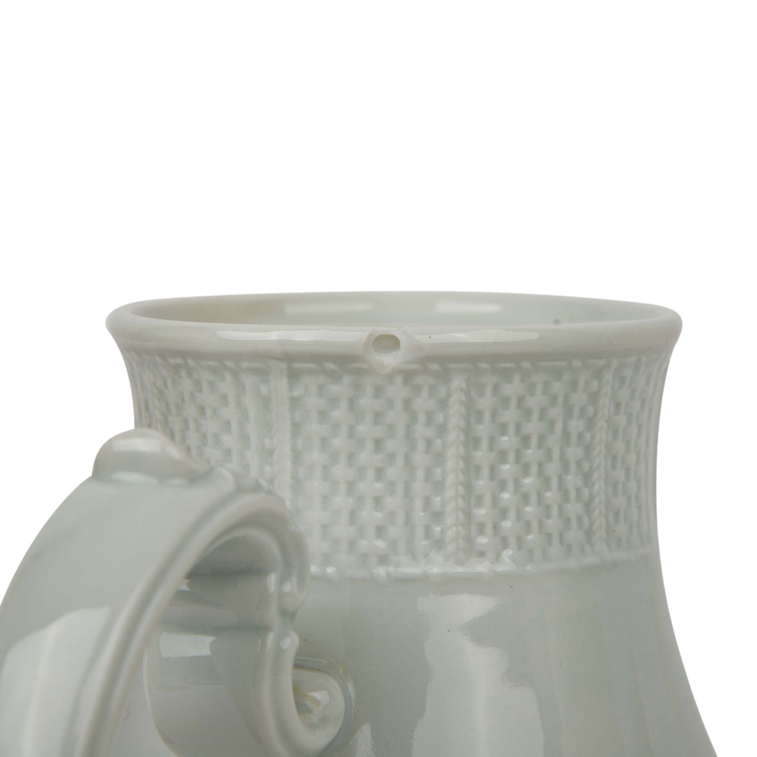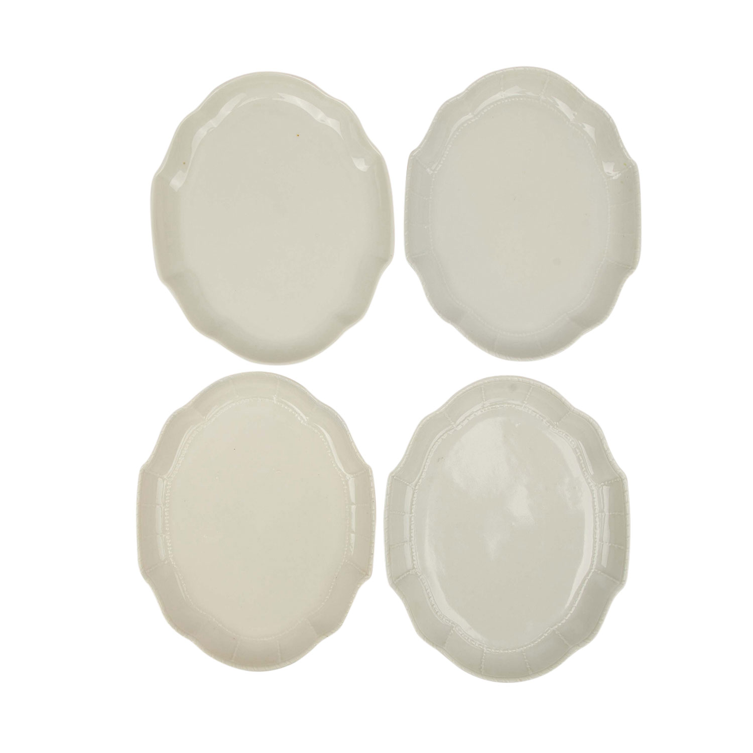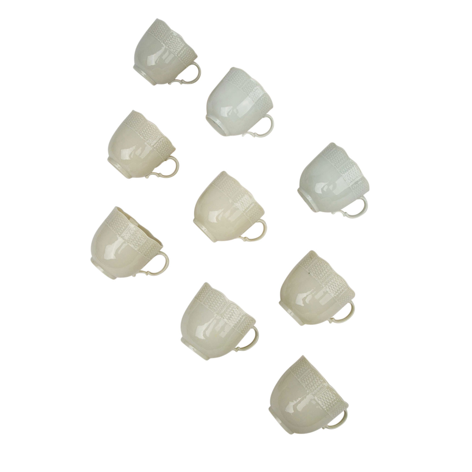 Weißporzellan, 'Flechtrand': 9 Kaffeetassen, 10 Untertassen, 10 Kuchenteller, 1 Kaffeekanne, 1 Mokkakanne, 3 Milchkännchen, 2 unterschiedlich große Zuckerdosen und 4 geschweifte Schälchen (3x mit Kordelrand, 1x glatt, L. ca. 17 cm). Alters- und Gebrauchsspuren, teilweise mit kleinen Bestoßungen, Glasurfehler, Einschlüsse, verschiedene Weißtöne.