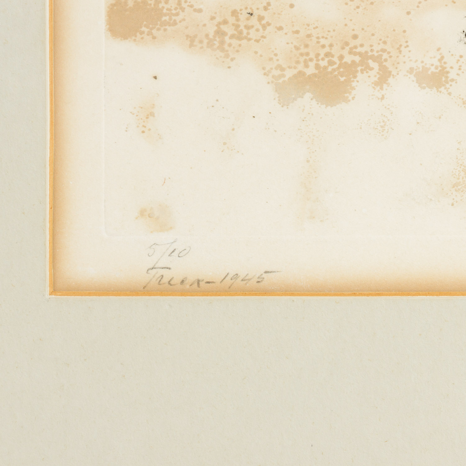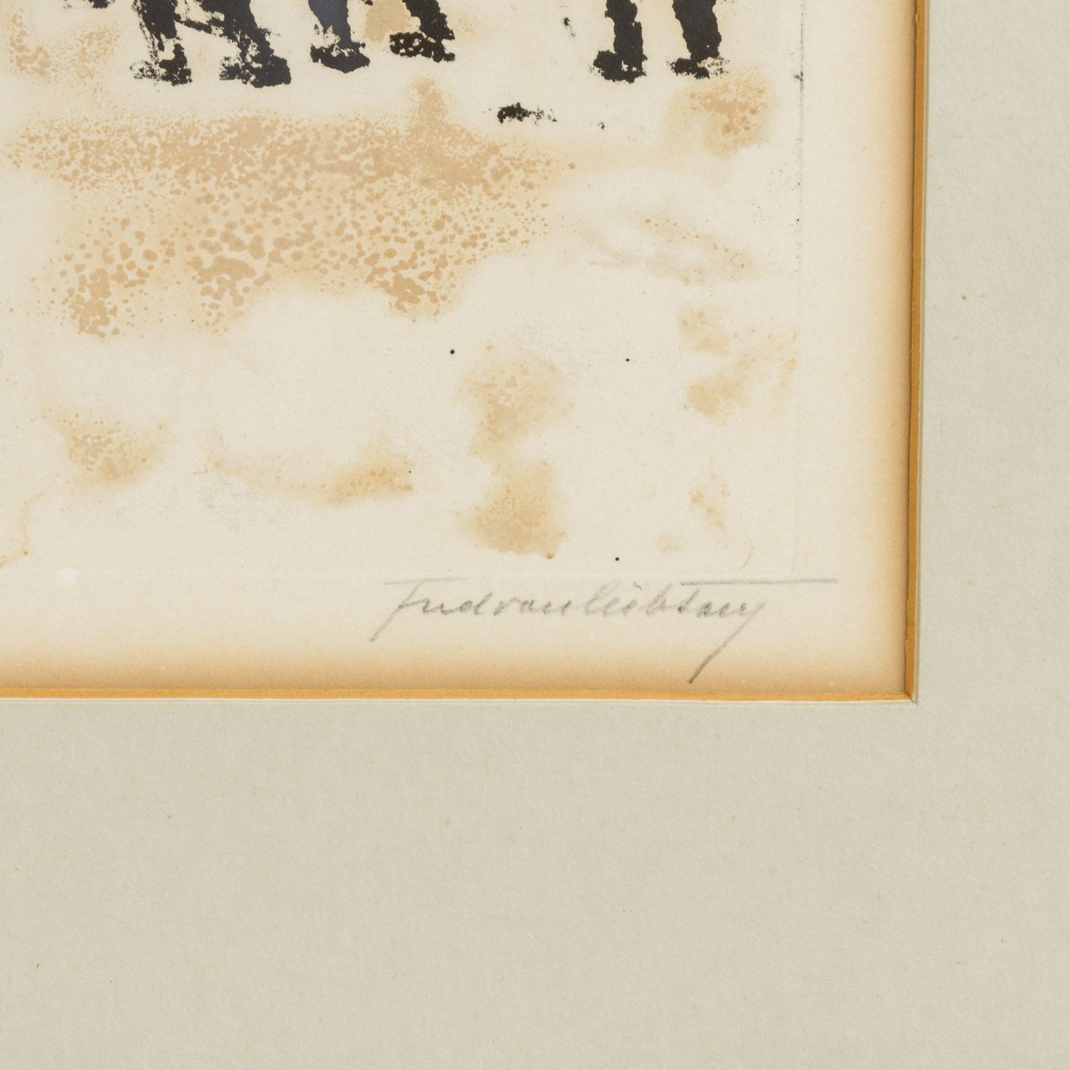 | LÜBTOW, FRED von (1908-1994), 2 graphics, 1x 'Streiterei', aquatint etching / paper, numbered below with pencil by hand. 10/20, titled and signed, HxW: plate approx. 50x33 cm, external dimensions frame approx. 72x52 cm; 1x 'Treck 1945', lithograph / paper, underneath numbered by hand in pencil. 5/20, titled and signed, HxW: plate approx. 25x32 cm, external dimensions frame approx. 44.5x54.5 cm. Each browned and light edge, 1x stained. Each framed in a passe-partout behind glass.