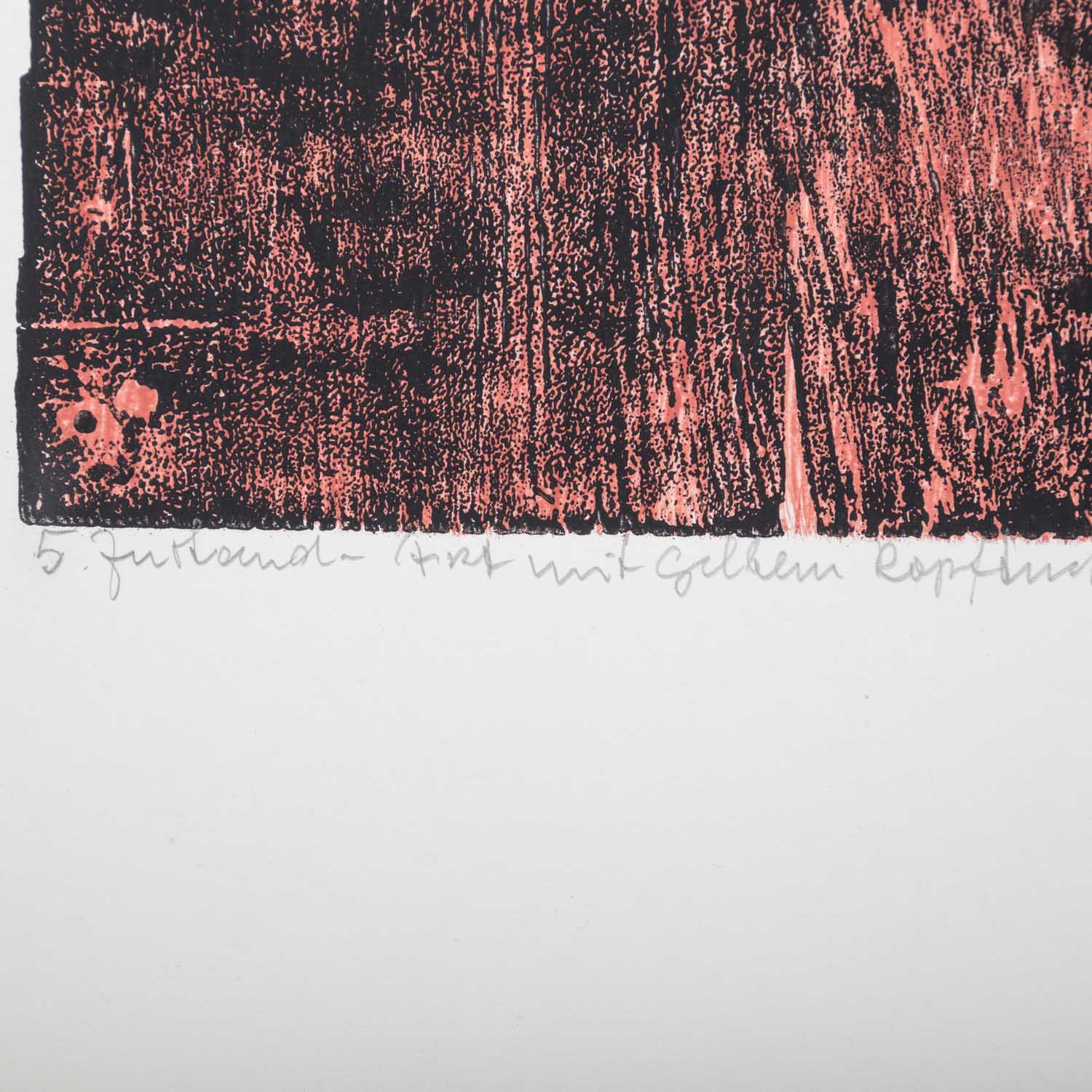 Farbholzschnitt/Karton, je mit Bleistift von Hand bezeichnet, betitelt und signiert, 3., 5. und 6. Zustand und Blatt 7/10, je Eigendruck, HxB: Platte je ca. 75x55 cm, Blatt je ca. 91x68 cm. Gebräunt, äußeren Blattränder part. leicht beschädigt.