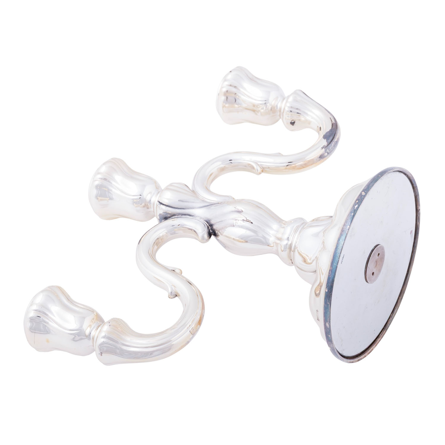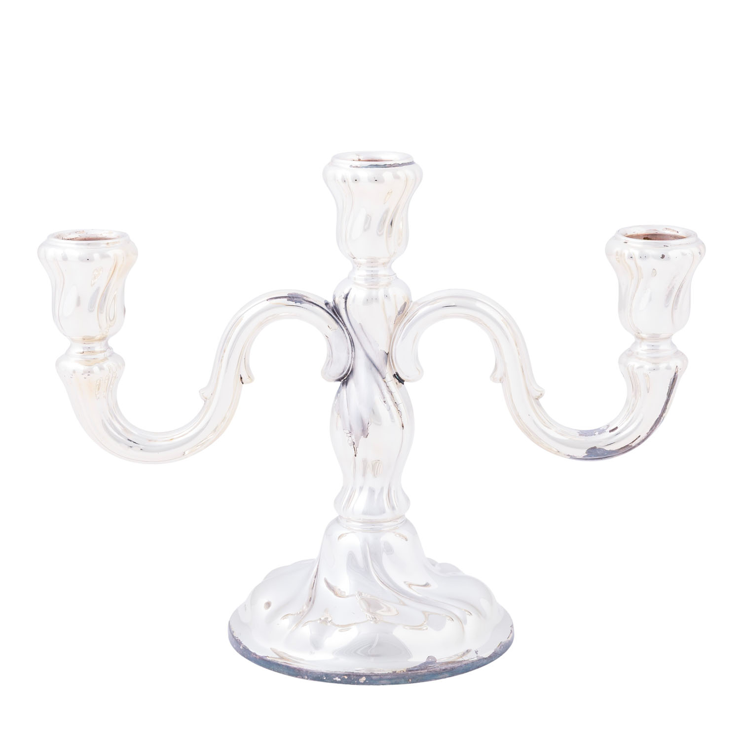 Silber gestempelt Halbmond Krone 835, dreiflammig, in gedreht gerippter Barockform, Balusterschaft, ausschwingender Fuß, feststehende Tüllen, Fuß beschwert, H: ca. 19 cm. Alters- und Gebrauchsspuren.