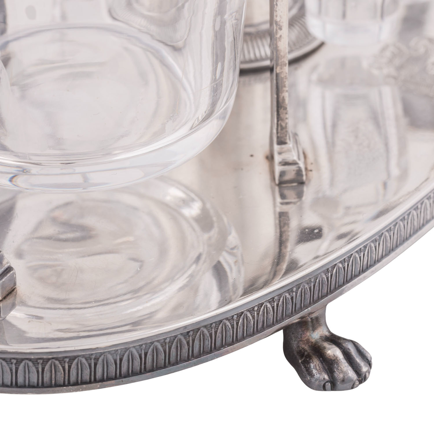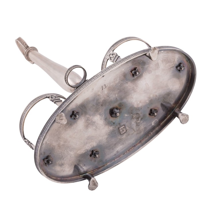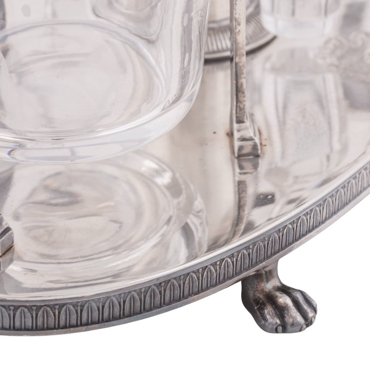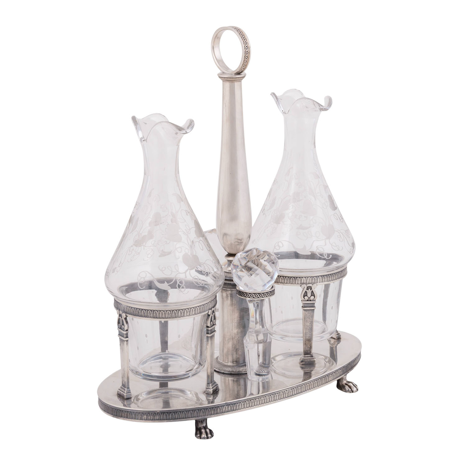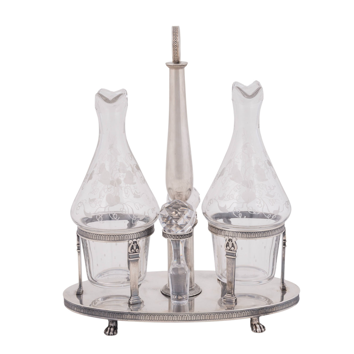 auf vier Tatzenfüßen, ovaler Stand mit Palmettenfries und Wappengravur, vier Halterungen für zwei geschliffene Glasgefäße für Essig und Öl, sowie deren Stopfen, mit der Standplatte verschraubt, balusterförmiger Haltegriff in der Mitte, LxBxH: ca. 22,5x11x5x27 cm, Gewicht (ohne Glaseinsätze) ca. 697 g. Alters- und Gebrauchsspuren. Anbei Schriftstück von 'Werner Maas, Juwelier-Kunsthändler, Stuttgart von Januar, 1996'.