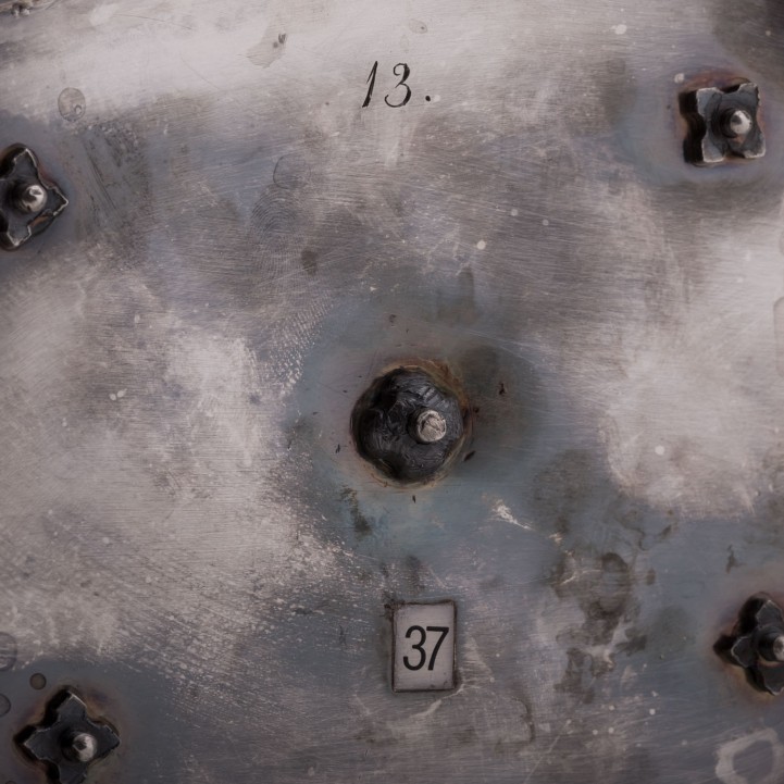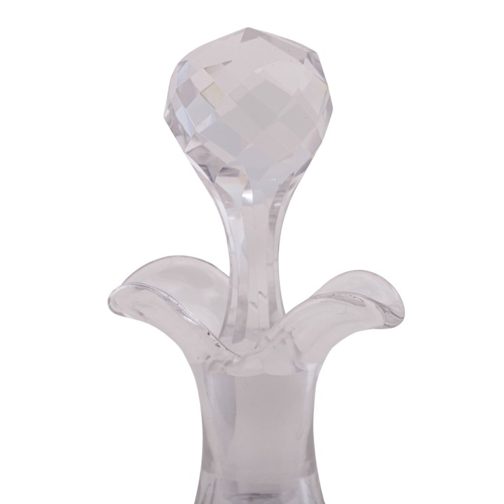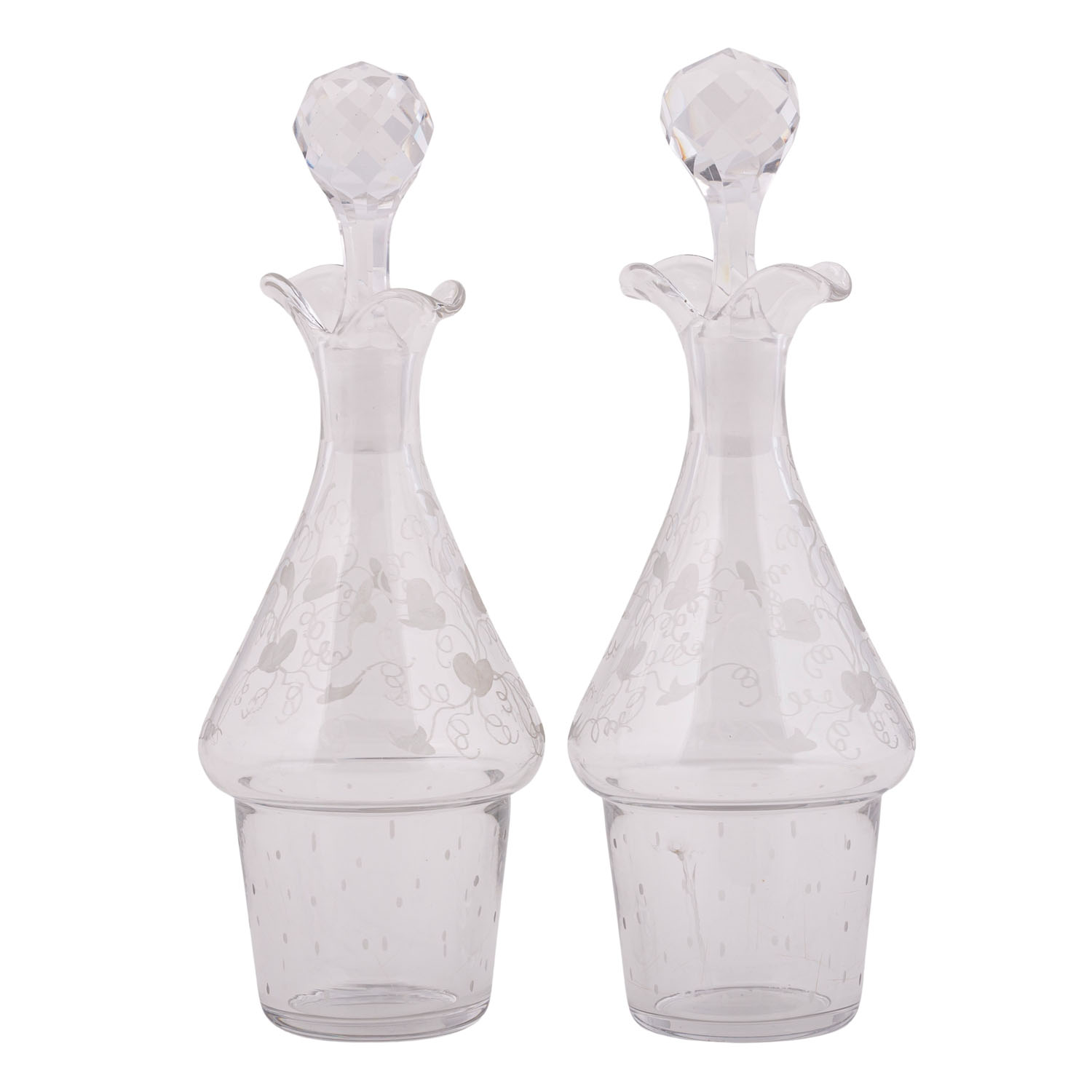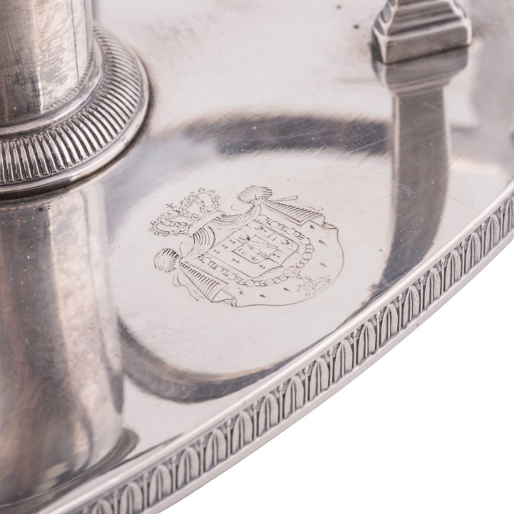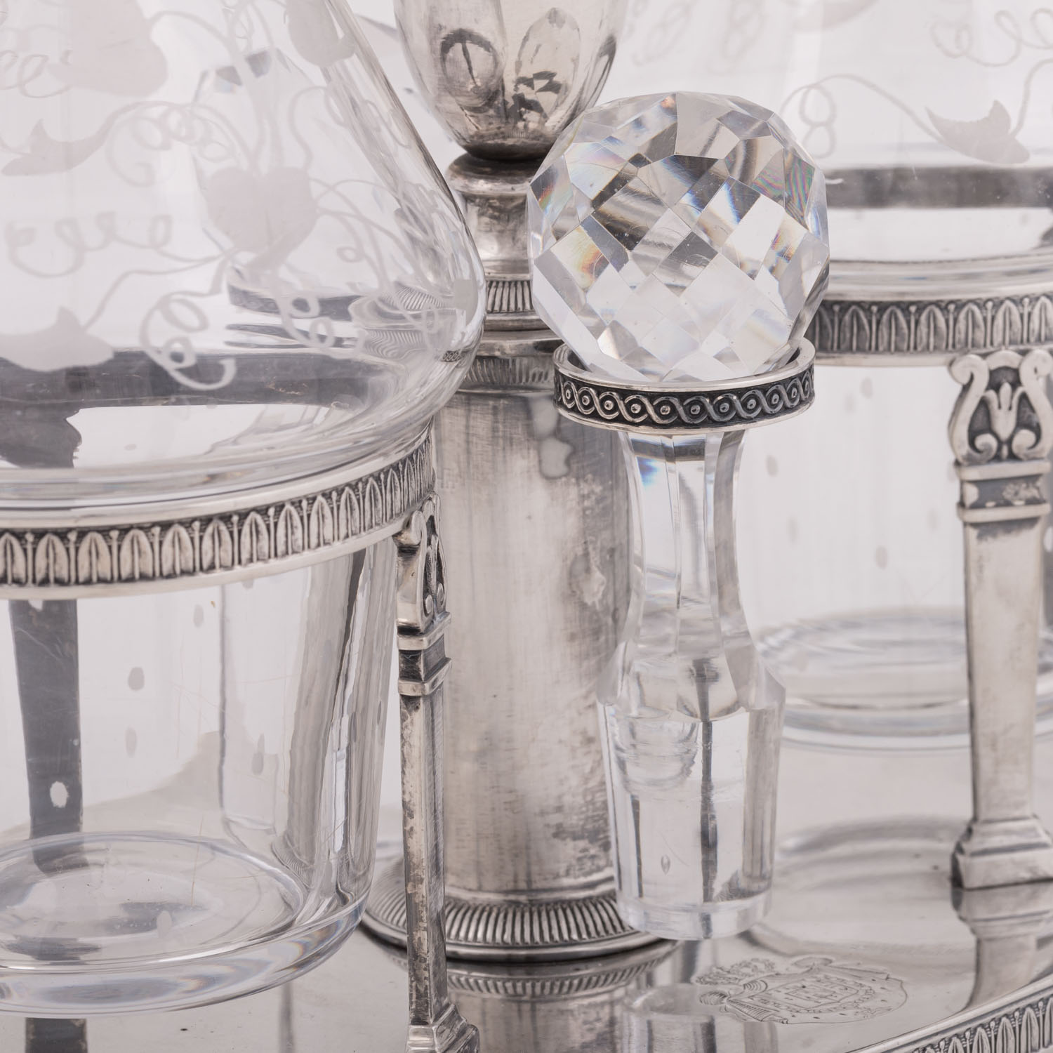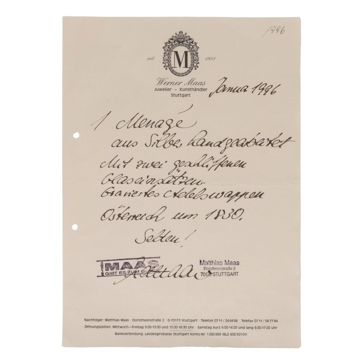 auf vier Tatzenfüßen, ovaler Stand mit Palmettenfries und Wappengravur, vier Halterungen für zwei geschliffene Glasgefäße für Essig und Öl, sowie deren Stopfen, mit der Standplatte verschraubt, balusterförmiger Haltegriff in der Mitte, LxBxH: ca. 22,5x11x5x27 cm, Gewicht (ohne Glaseinsätze) ca. 697 g. Alters- und Gebrauchsspuren. Anbei Schriftstück von 'Werner Maas, Juwelier-Kunsthändler, Stuttgart von Januar, 1996'.