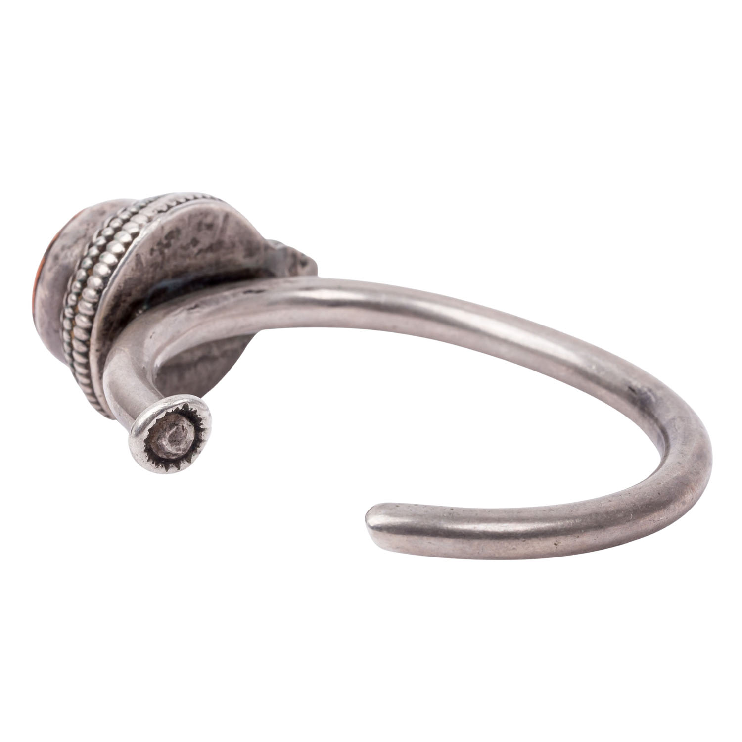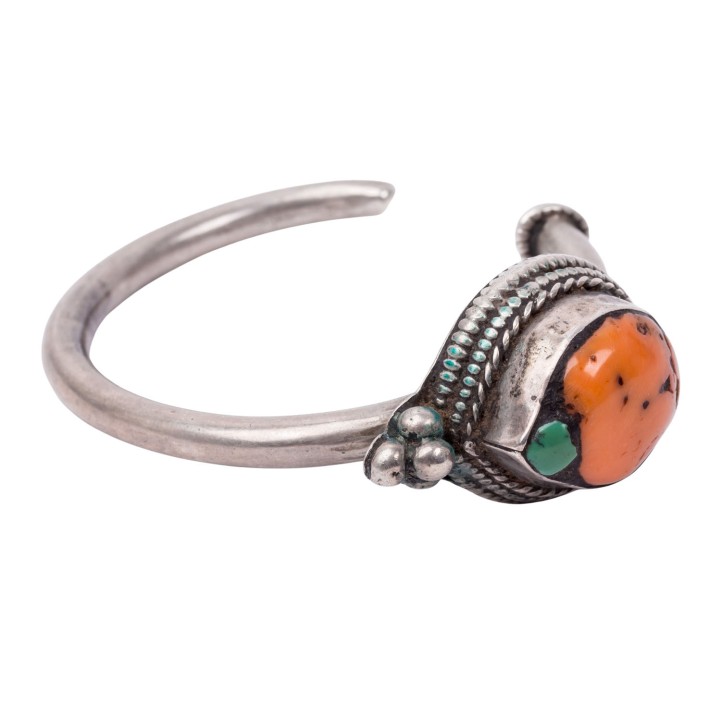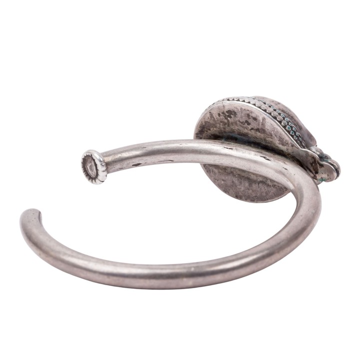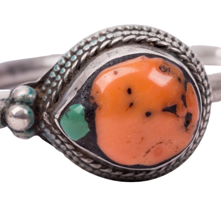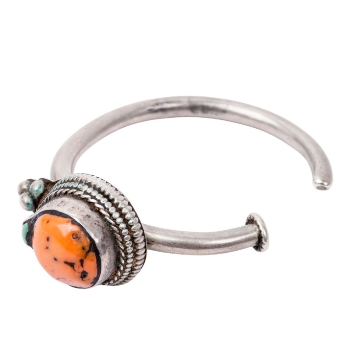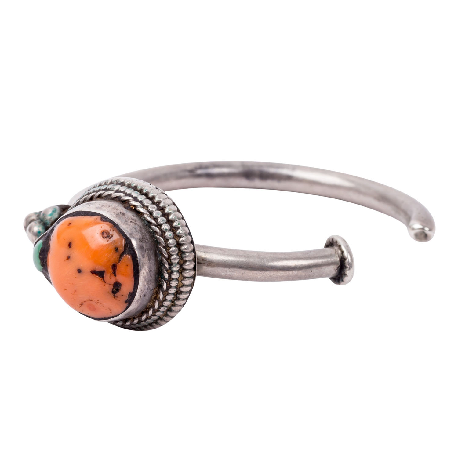 Verziert mit einer Koralle und einem Türkis. Altersspuren.