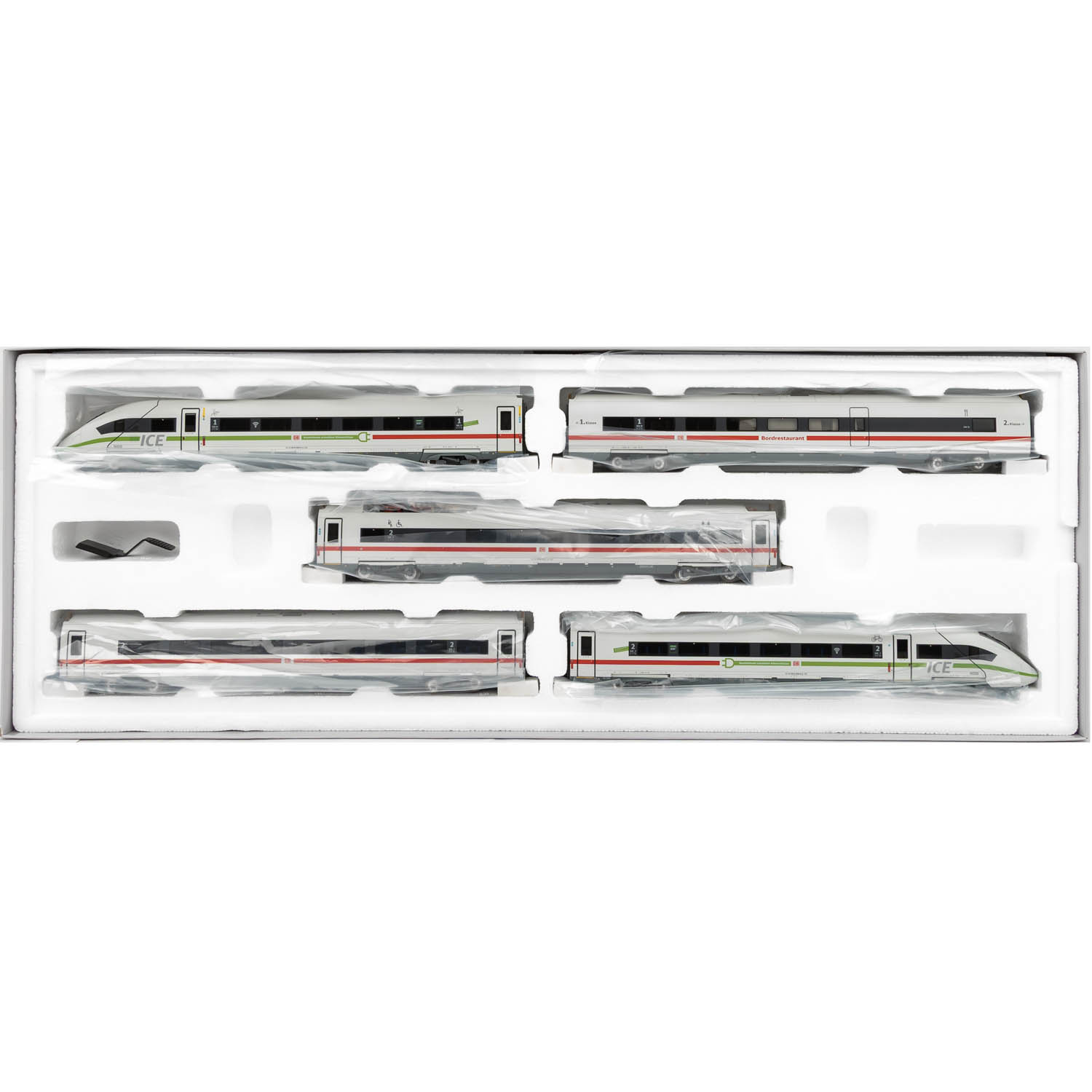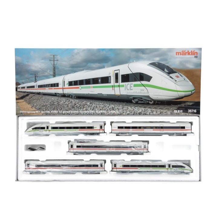 der 5-tlg Hochgeschwindigkeitszug BR 412/812 beinhaltet 2 Endwagen mit grünem Streifen und Steckersymbol als Zeichen für die Fahrt mit 100% Ökostrom, 1 Speisewagen, 1 Servicewagen und 1 Mittelwagen, unbespielt im Orig.-Karton mit Anleitung, Fkt. nicht geprüft.