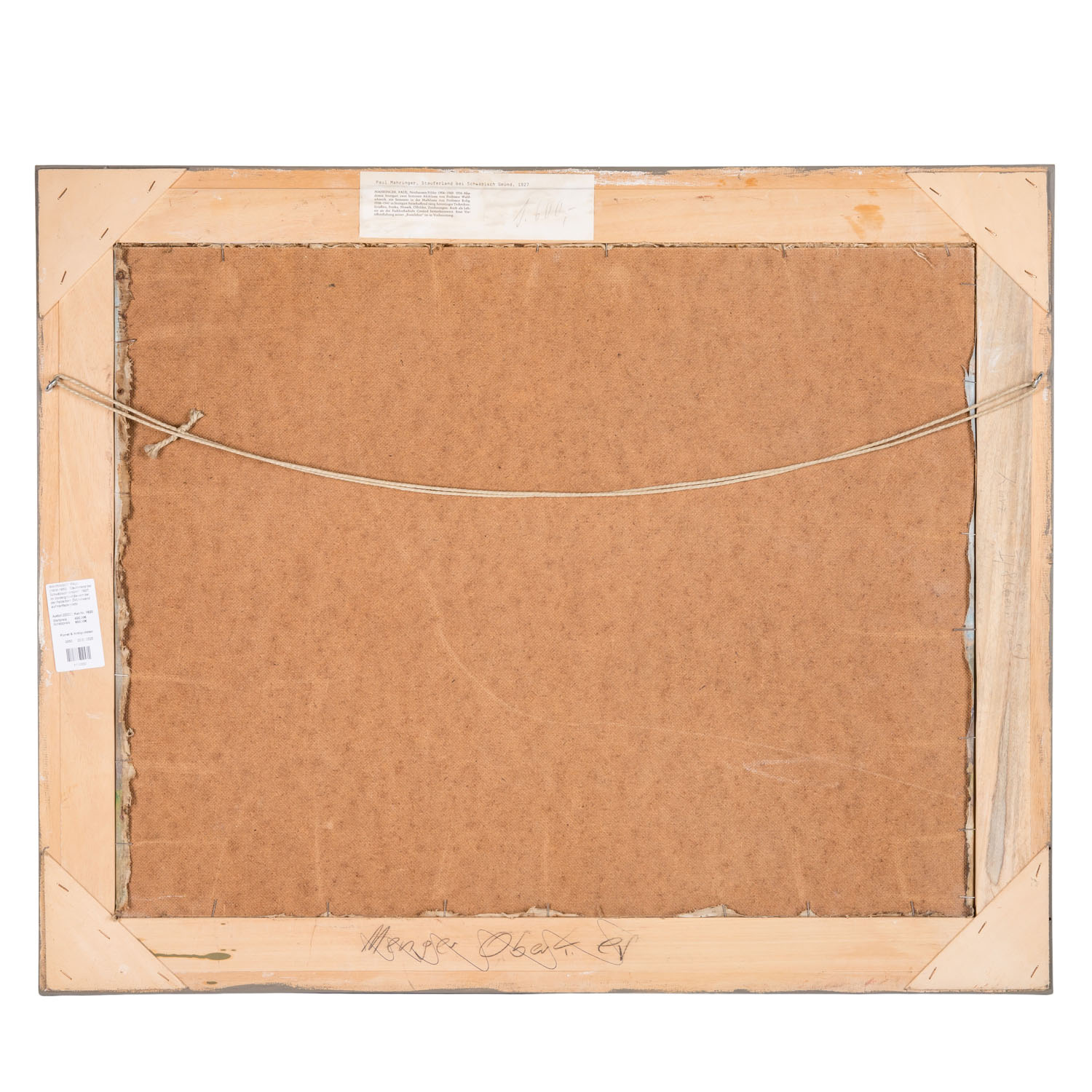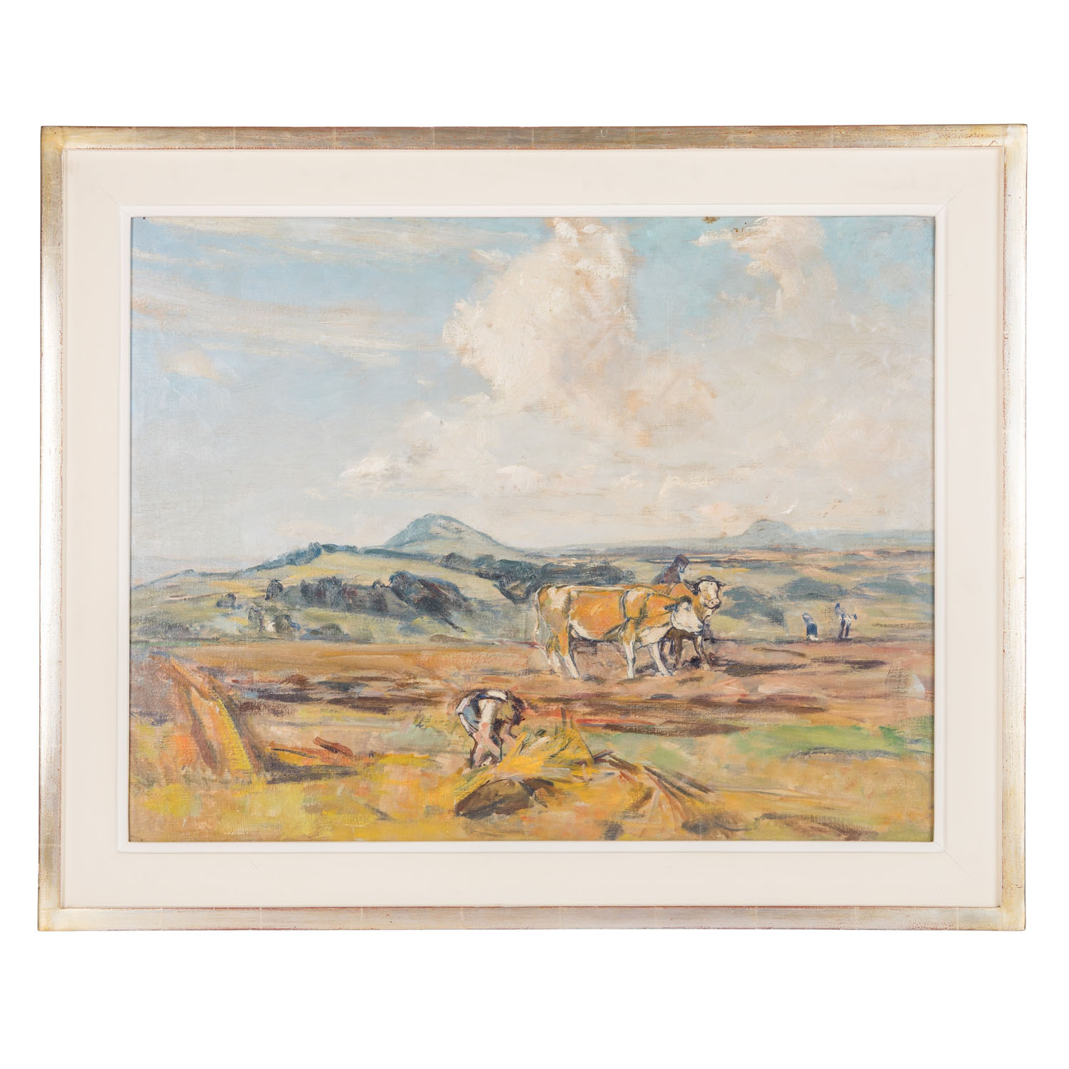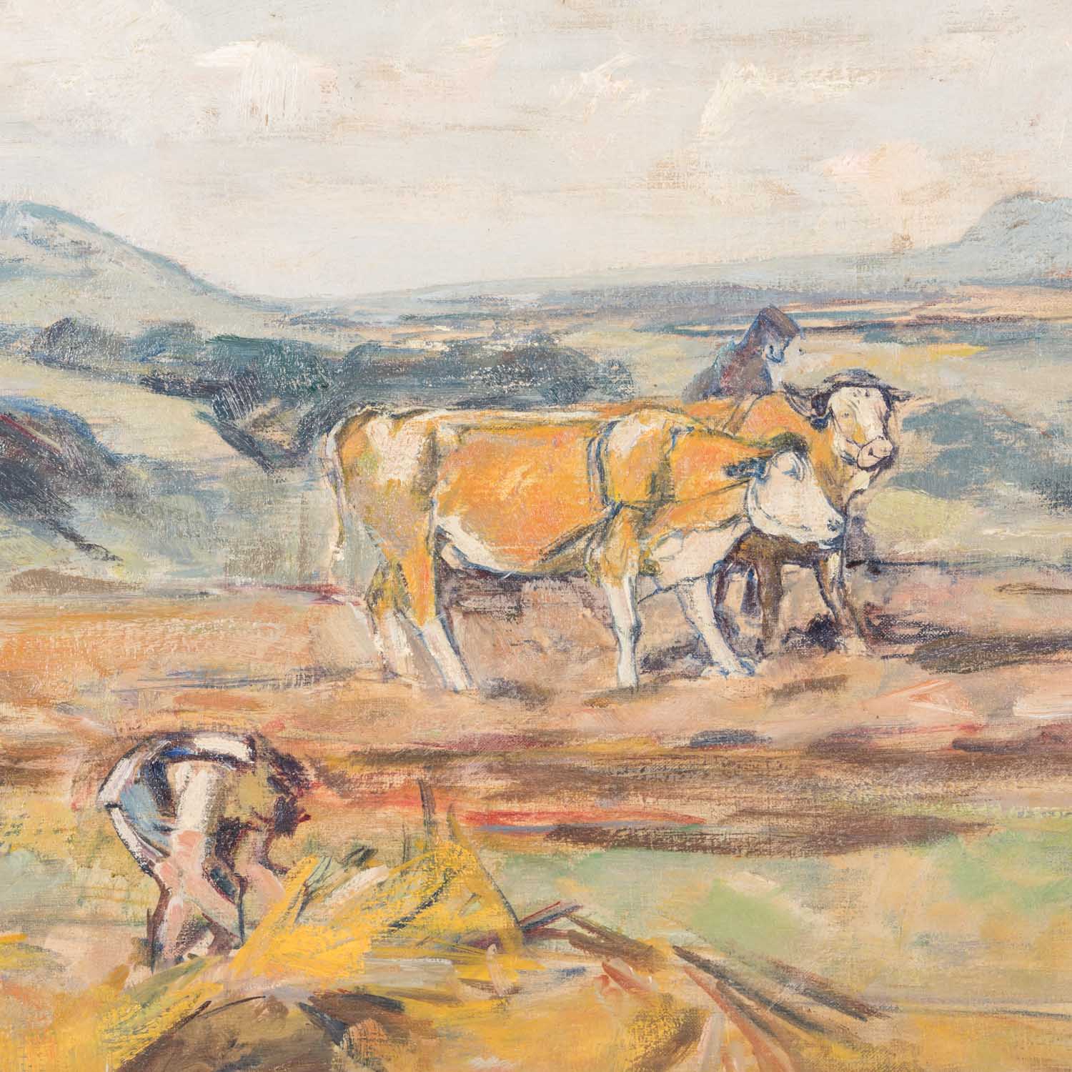 im Vordergrund Bauern bei der Feldarbeit, Öl/Leinwand auf Hartfaserplatte aufgezogen, HxB: ca. 61x77,5 cm (75x92 cm mit Rahmen). Alters- und Beriebspuren, part. fleckig. Mit Rahmen (Kanten minim. bestoßen). VERSO Etikett mit Bezeichnung und Künstlervita.