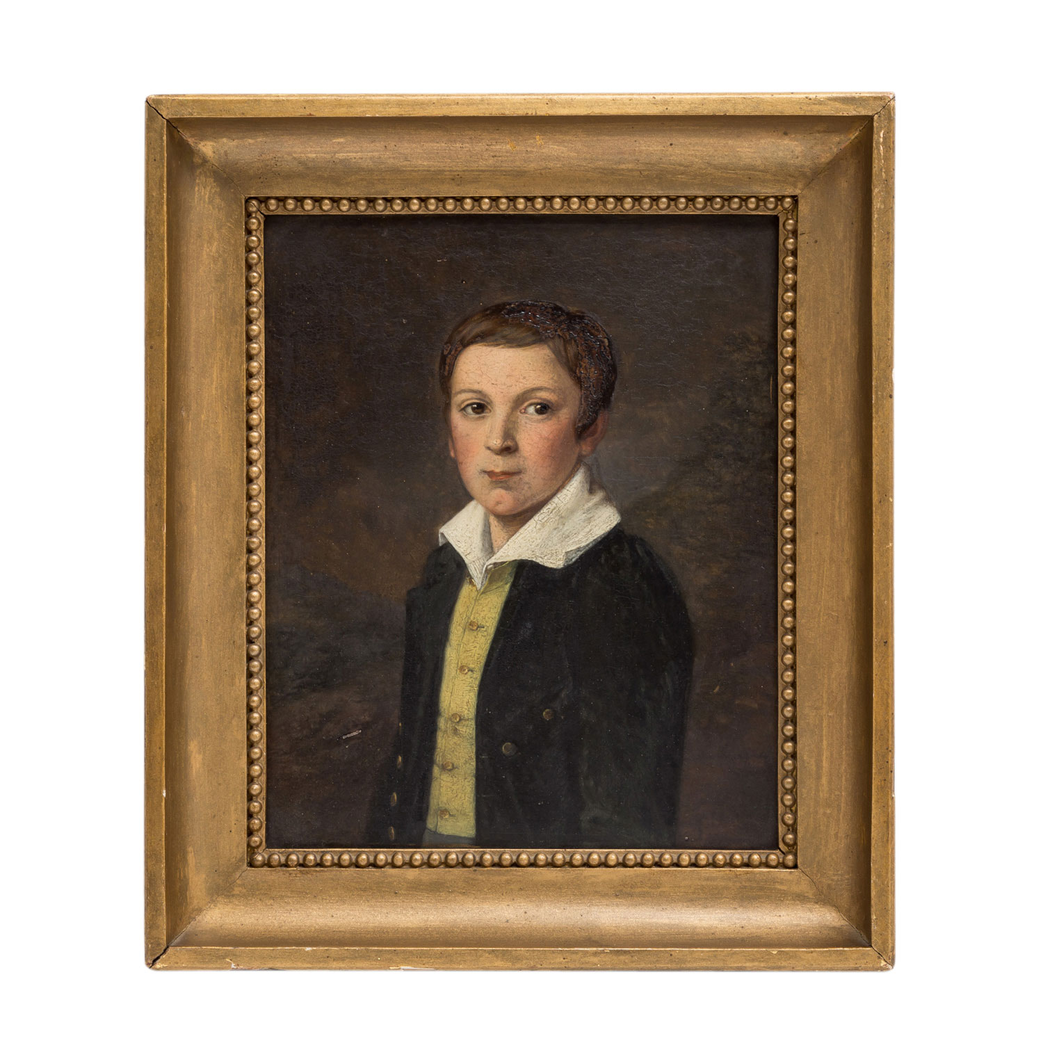Maler 18./19. Jh., ""Portrait eines Knaben"", wohl der Sohn des F. B. OSIANDER, Halbbildnis in schwarzer Jacke über gelber Weste und weißem Hemd, unsigniert, Öl/Blech, HxB: ca. 22,5x18 cm (29,5x25,5 cm mit Rahmen). Craquelé, Berieb- und Kratzspuren, Farbveränderung im Bereich des Haares. Mit Rahmen. Altersspuren.
