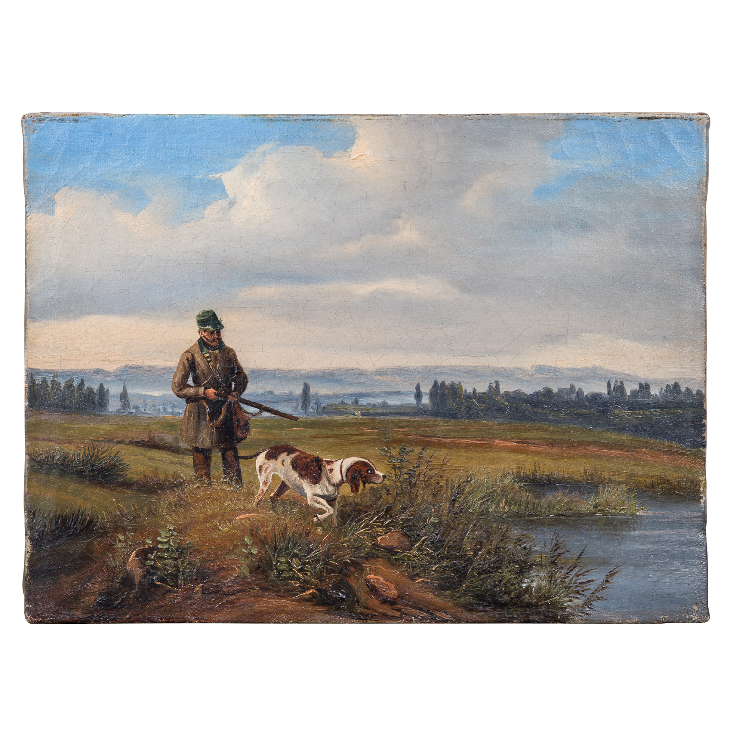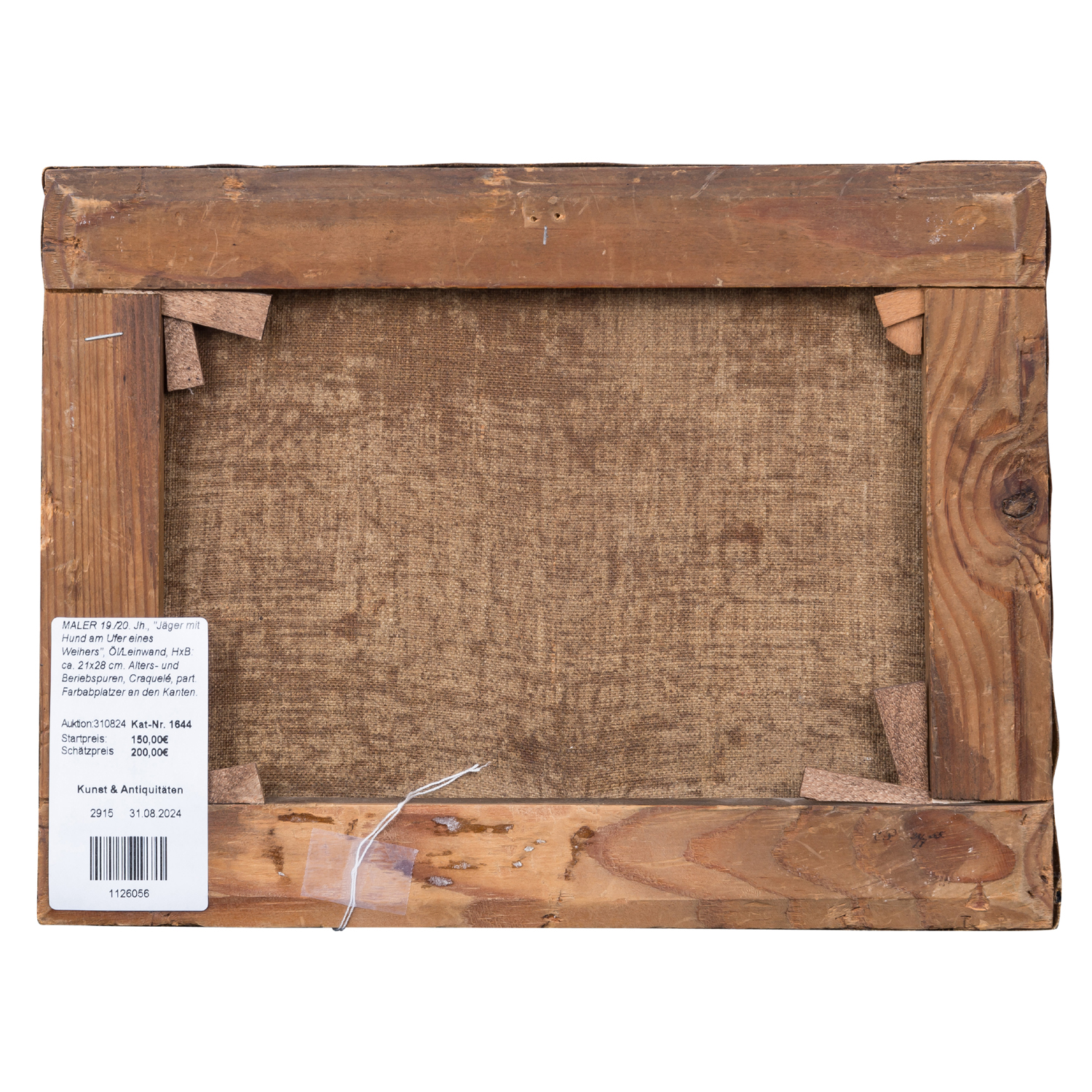 MALER 19./20. Jh., 'Jäger mit Hund am Ufer eines Weihers',