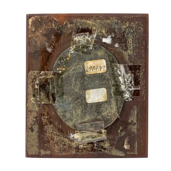 Brustbildnis mit Schärpe über dunklem Gewand oder Rüstung, Tempera/Metall, oval, HxB: ca. 5,5x4,5 cm (8,5x7,5 cm mit Rahmen). Alters- und Beriebspuren, leichtes Craquelé. Mit Rahmen (Kanten minim. beschädigt.)