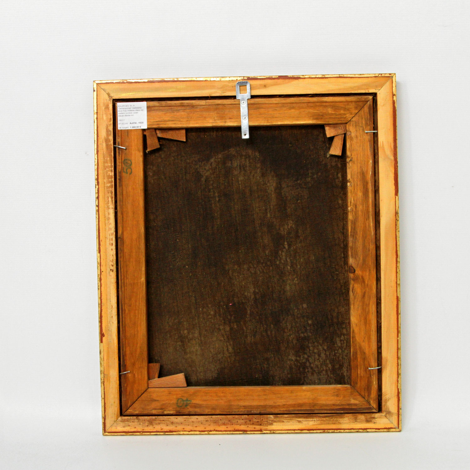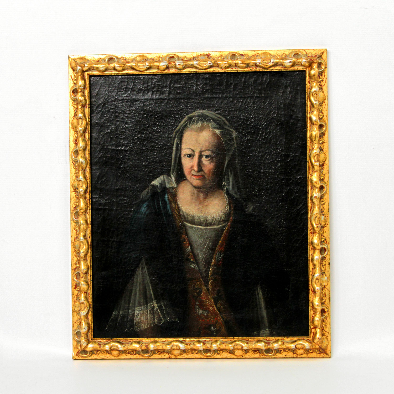 Halbbildnis einer Frau mittleren Alters mit weißem Schleier, einen blauen Mantel mit Brokatstickerei über dem mit Spitze besetztem Kleid tragend, unsign., Öl/Lw. doubl., 48x38,5 cm. Craquelé, Farbabplatzer, rest.. Mit Rahmen. Altersspuren.