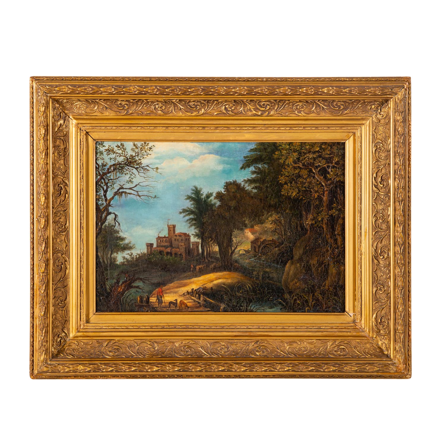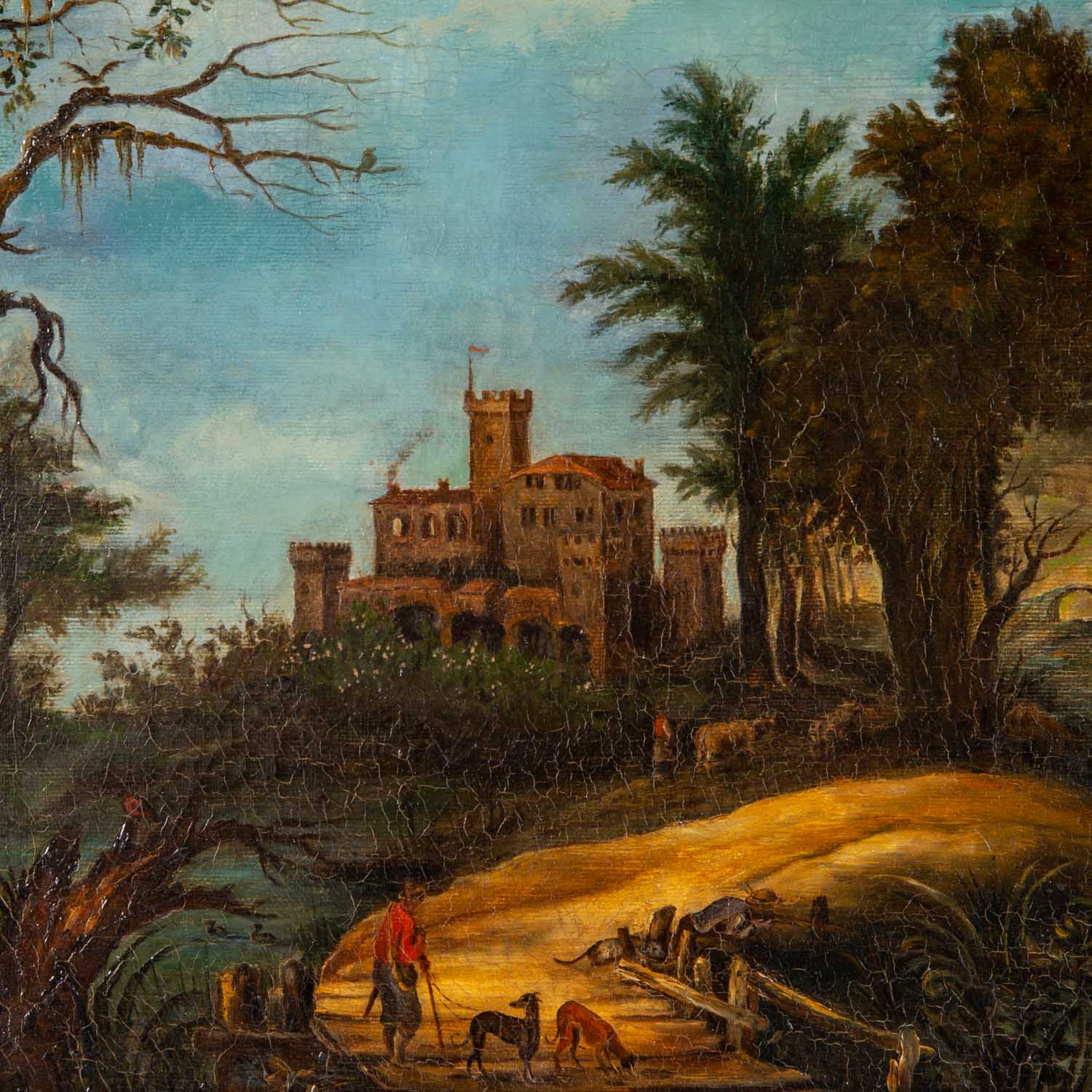 MALER/IN 18./19. Jh., 'Jäger und Hirten in Ideallandschaft mit Schloss',